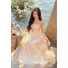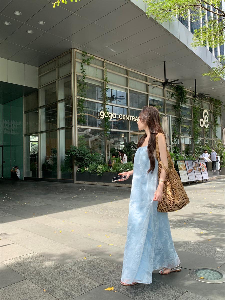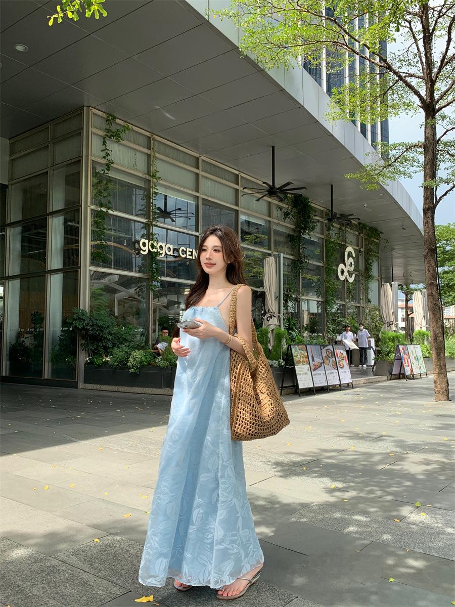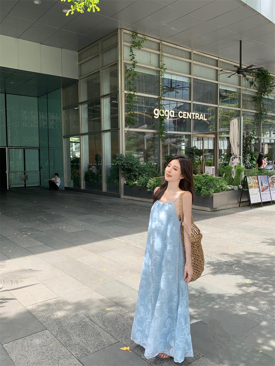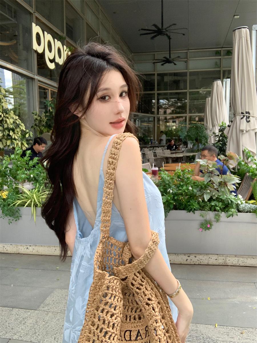 Vestido de Suspensório sem Costas para Mulheres Verão High-End Solto Férias à Beira-Mar Jacquard Francês Primeiro Amor Doce Saia Longa