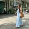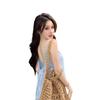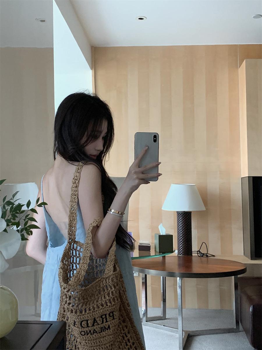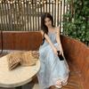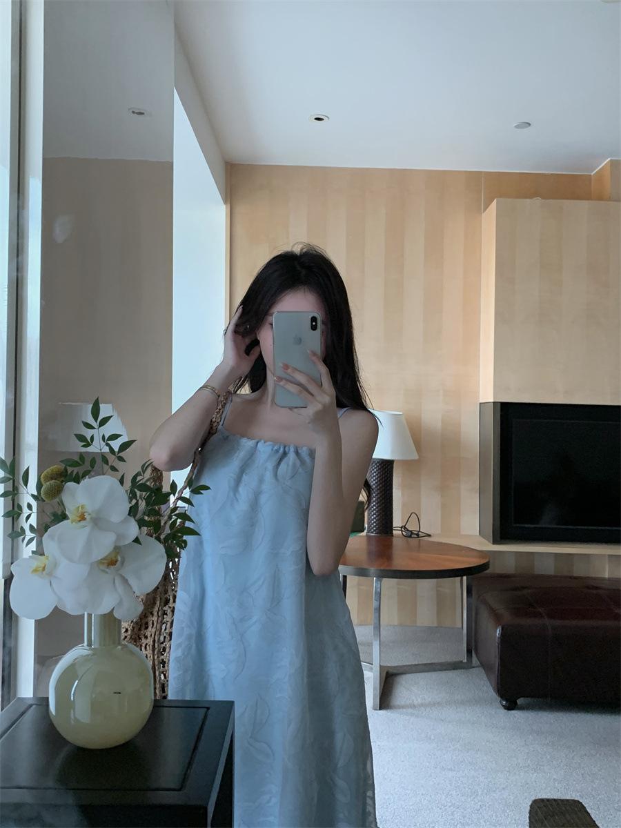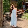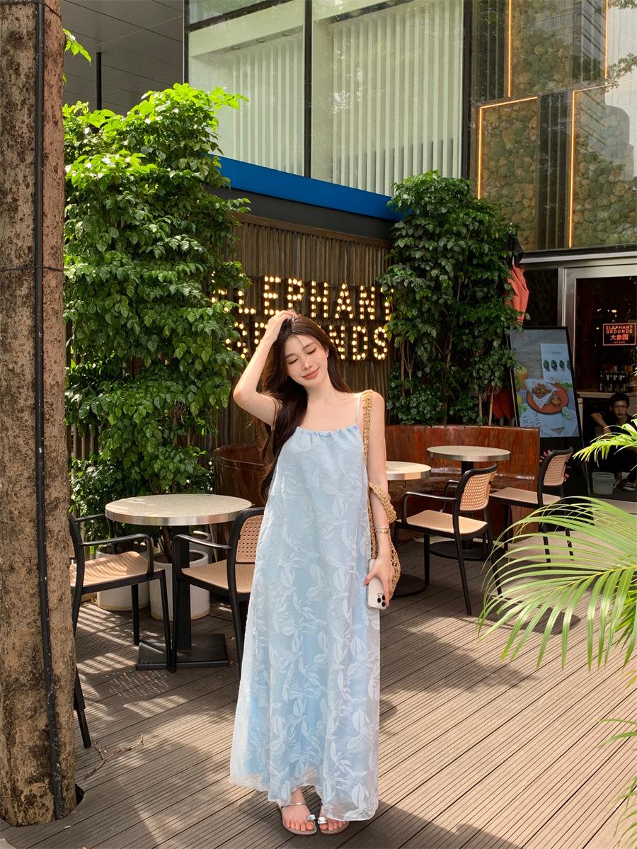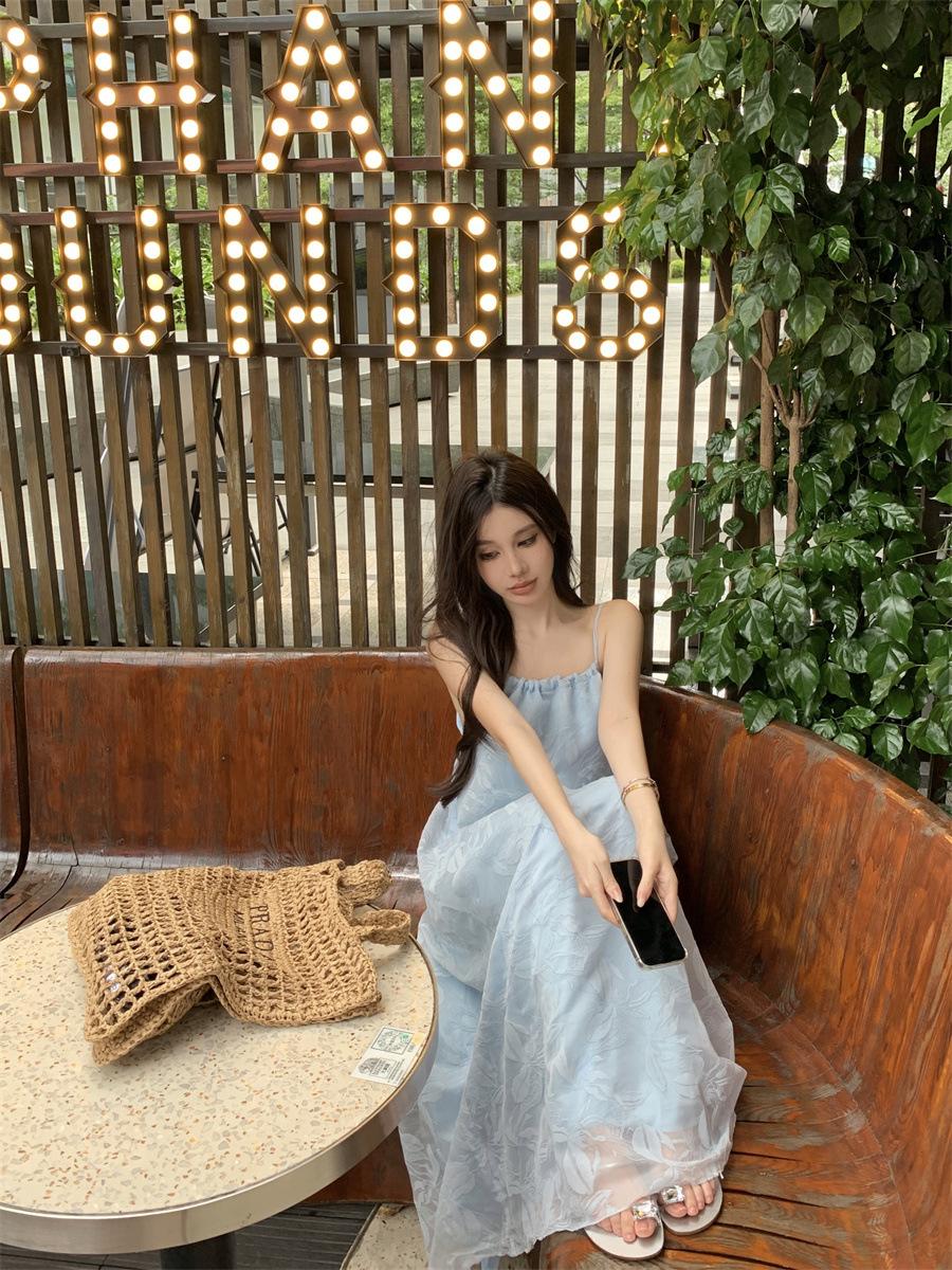 Vestido de Suspensório sem Costas para Mulheres Verão High-End Solto Férias à Beira-Mar Jacquard Francês Primeiro Amor Doce Saia Longa