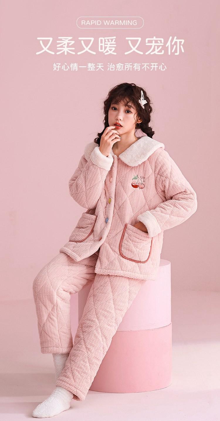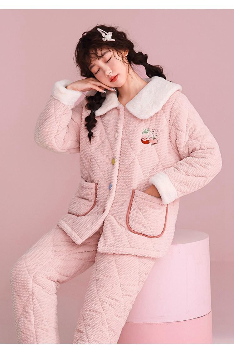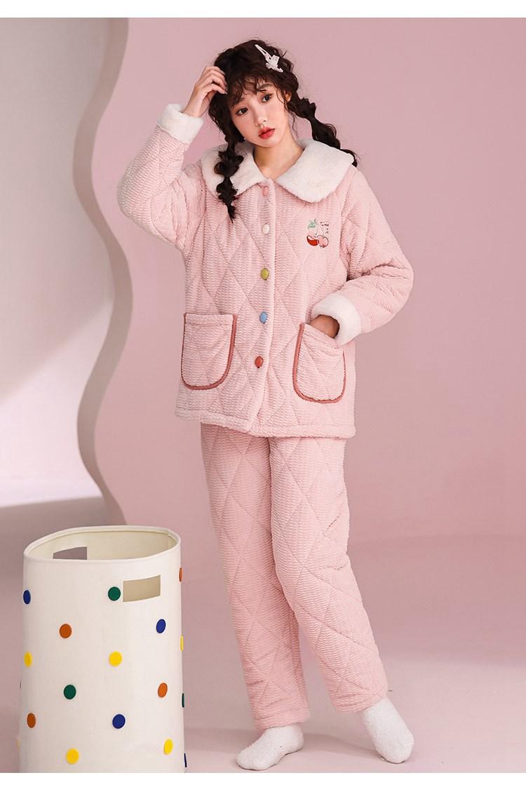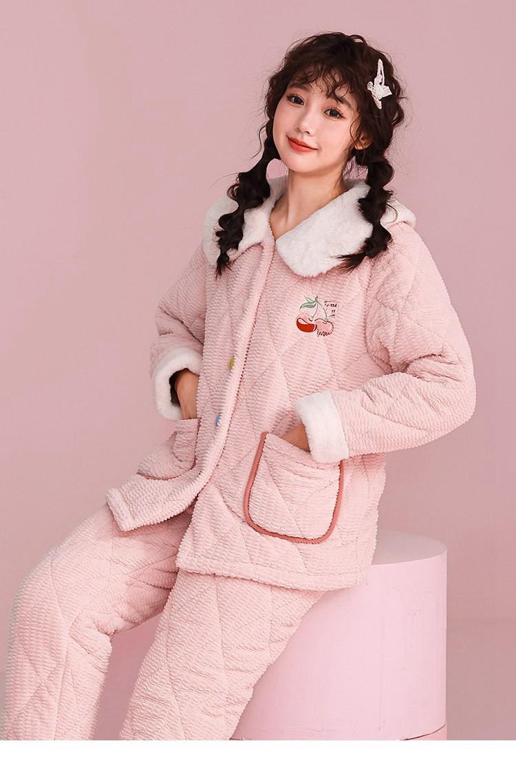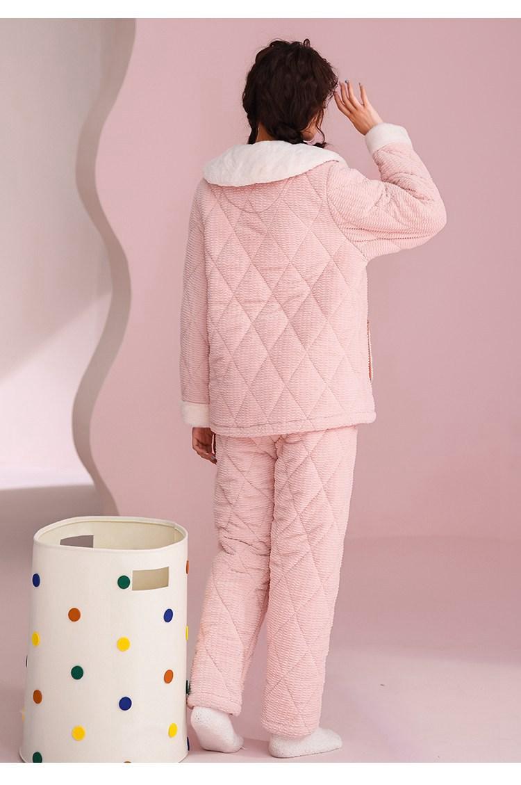 [três camadas de algodão] inverno novos pijamas femininos usam algodão acolchoado coral fleece roupas quentes para casa terno