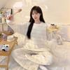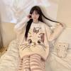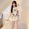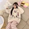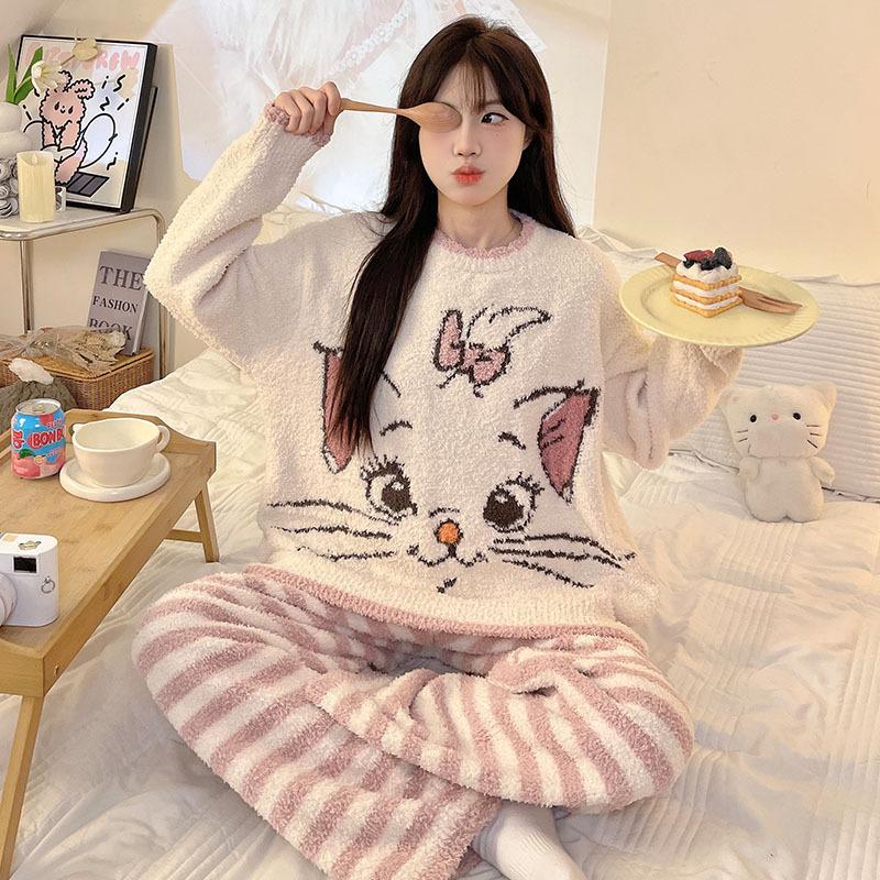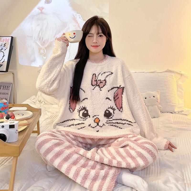 Pijama feminino outono e inverno 2024, lã coral, gola redonda, terno quente, fofo, desenho animado, meninas, flanela, roupas para casa