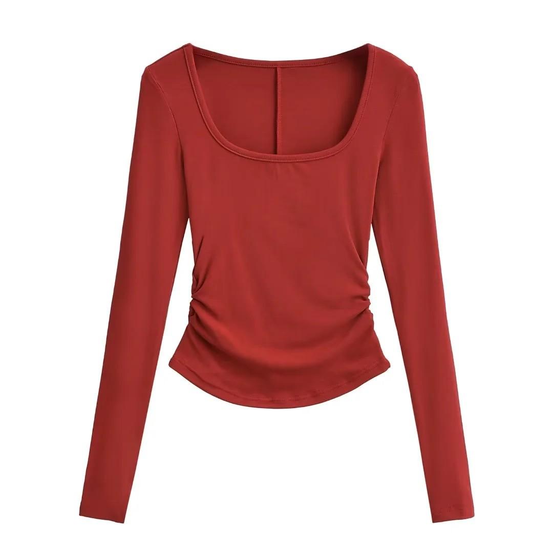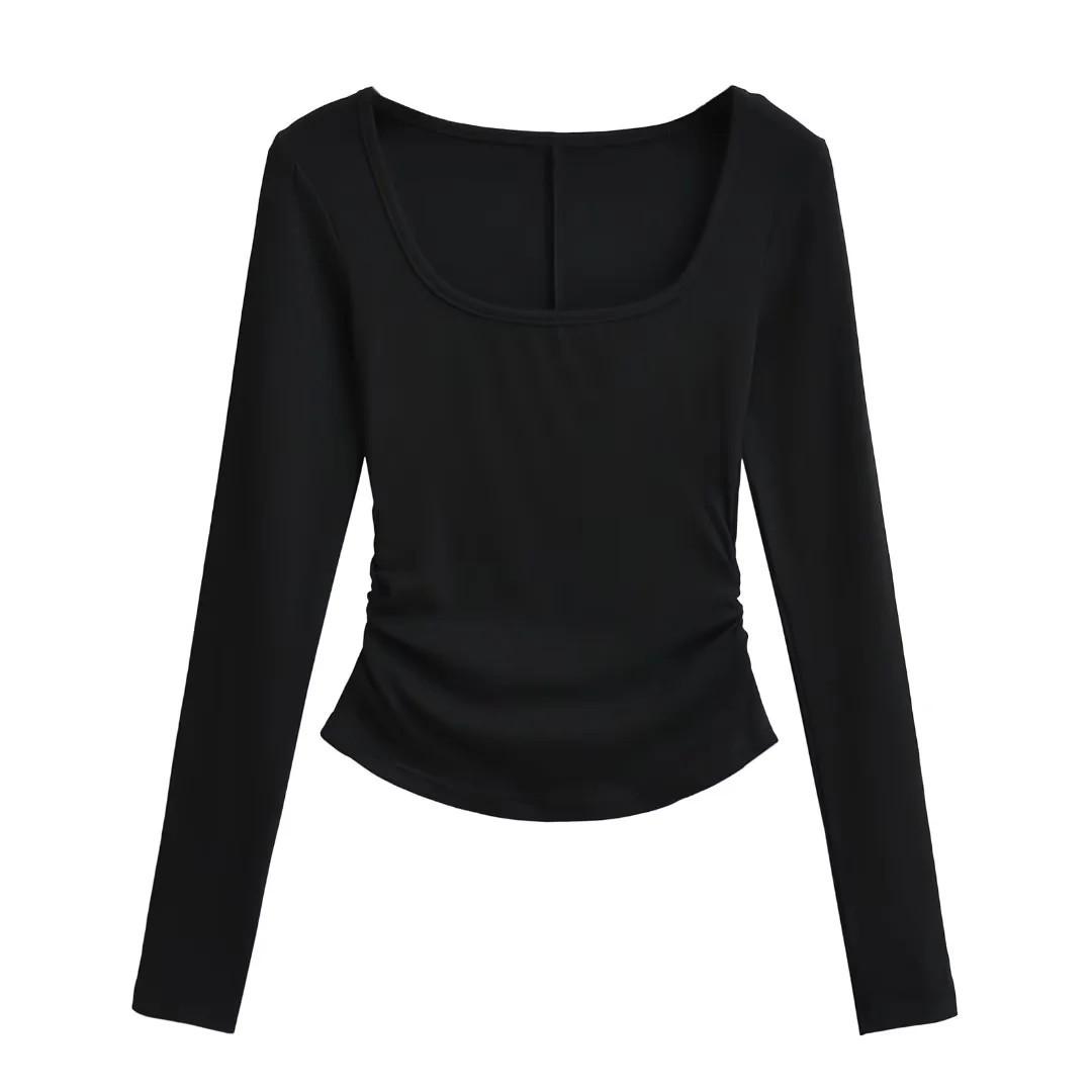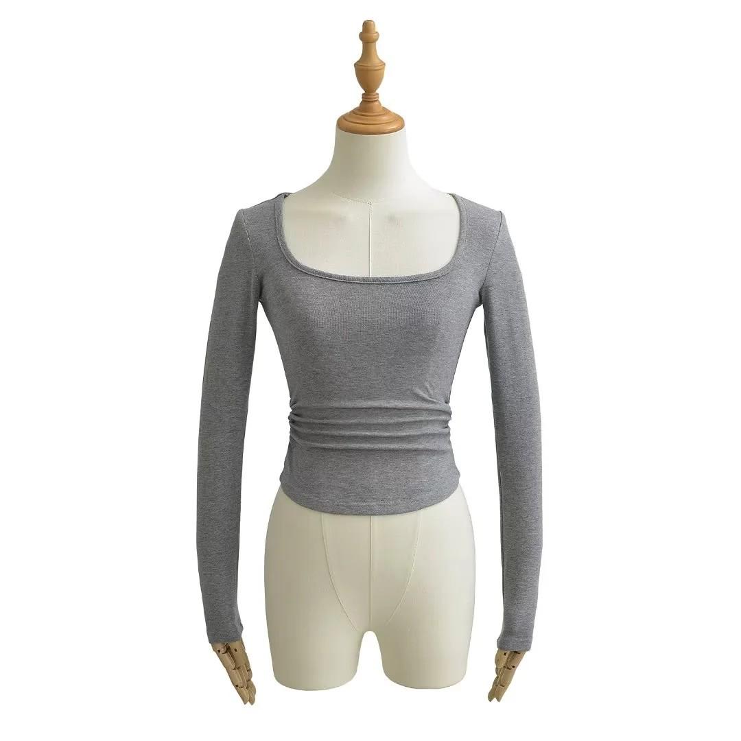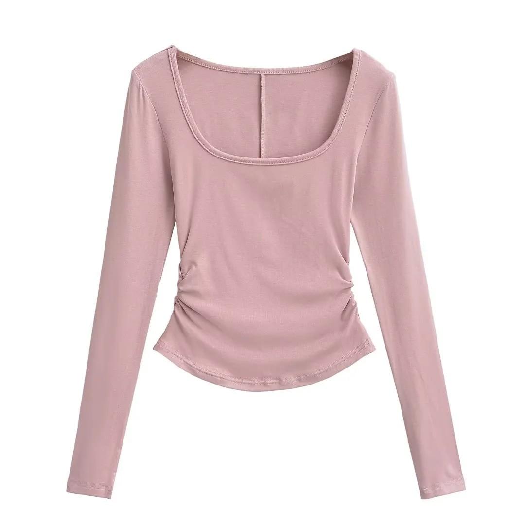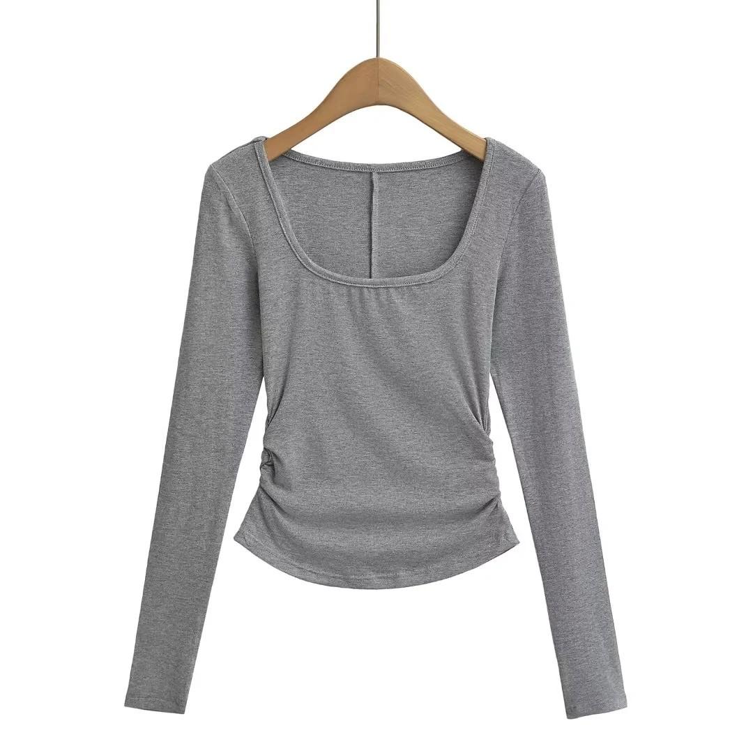 Camiseta de manga comprida com gola quadrada estilo europeu e americano, estilo hot girl, 2024, outono e inverno, nova camisa de cintura alta com bainha plissada e base fina