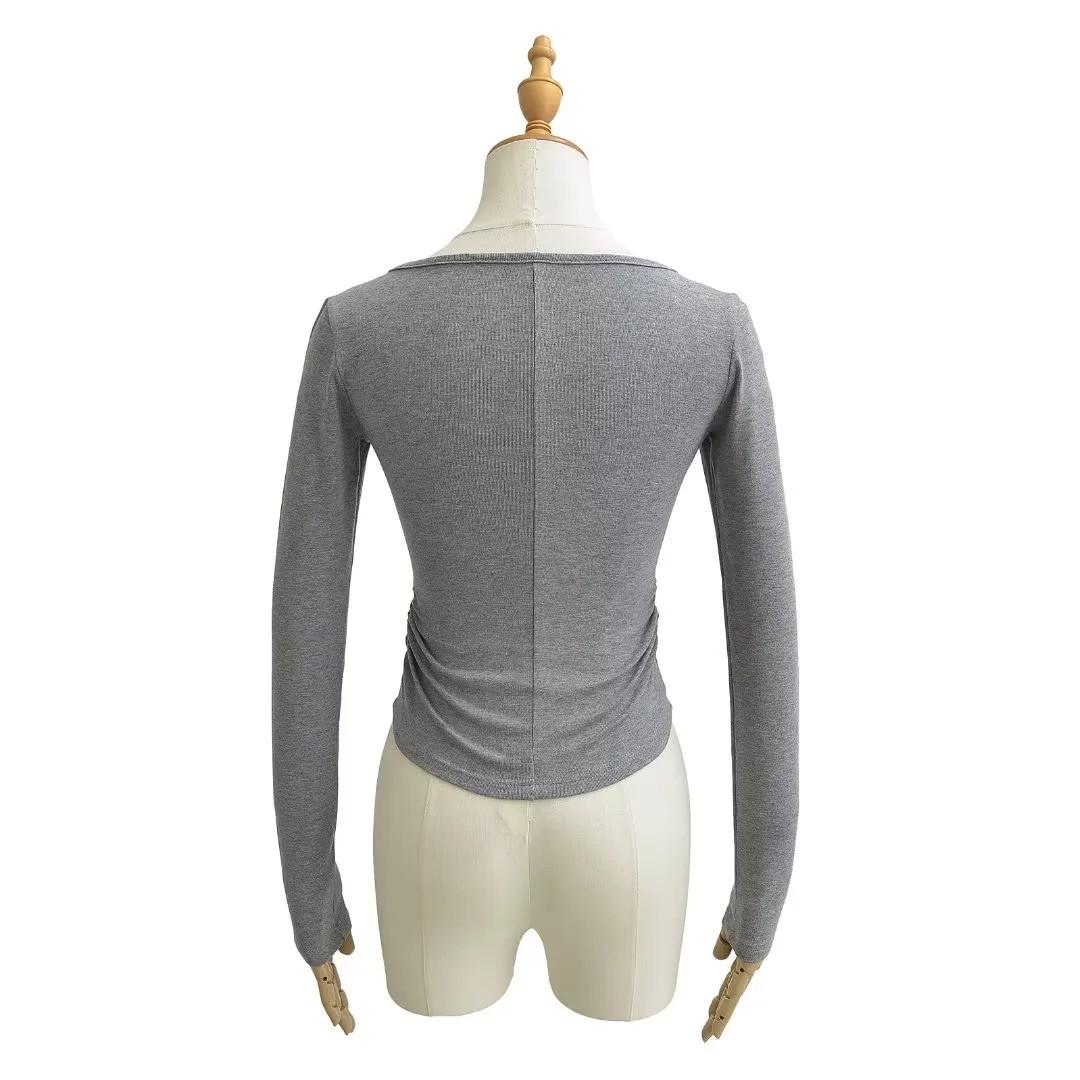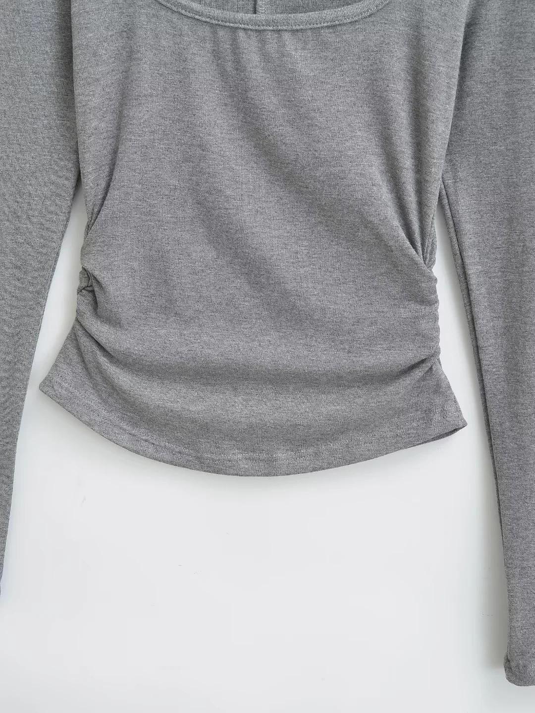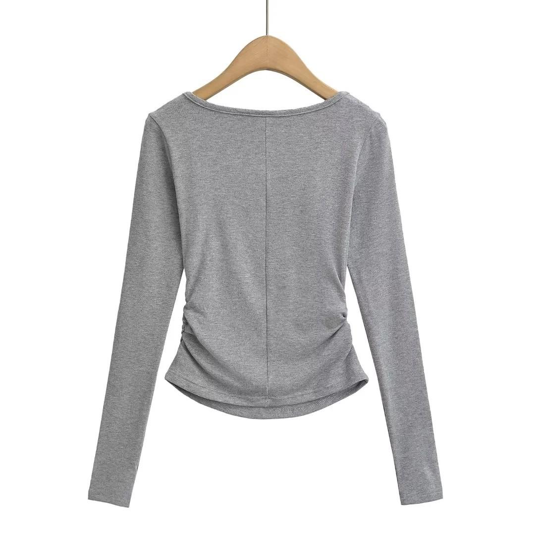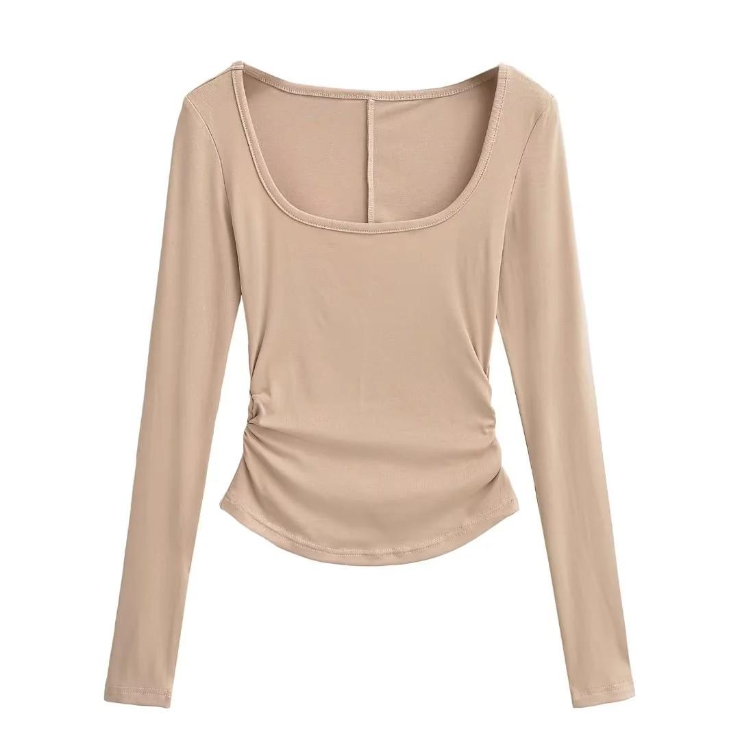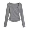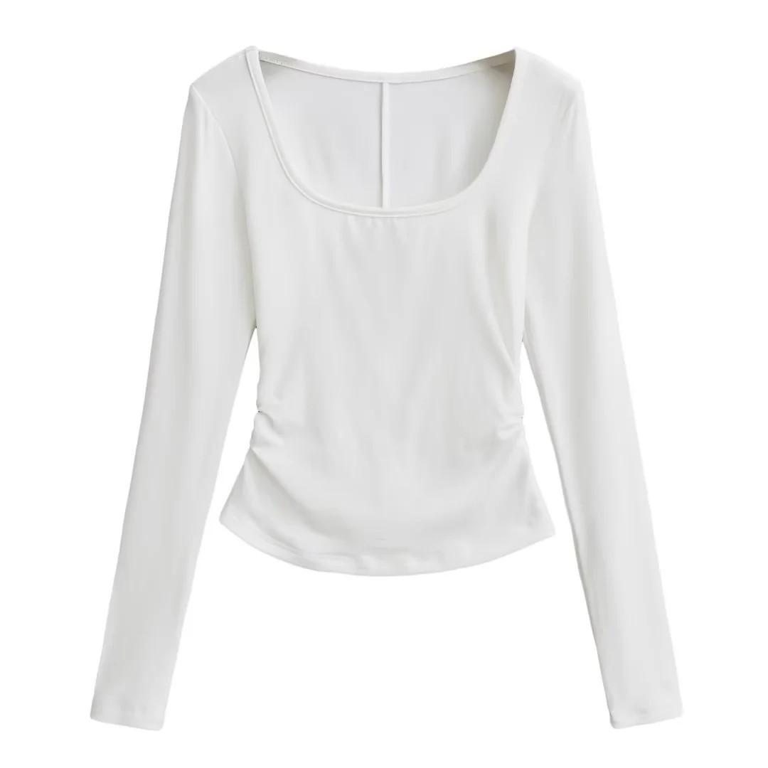 Camiseta de manga comprida com gola quadrada estilo europeu e americano, estilo hot girl, 2024, outono e inverno, nova camisa de cintura alta com bainha plissada e base fina