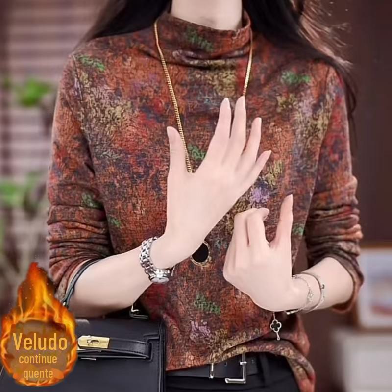 2024 outono e inverno nova camiseta feminina manga longa moda temperamento lã forrado quente camisa de fundo feminino versátil mãe top
