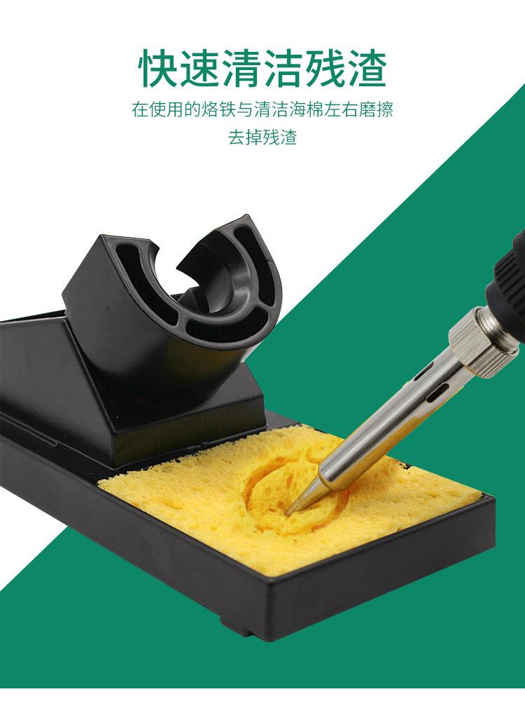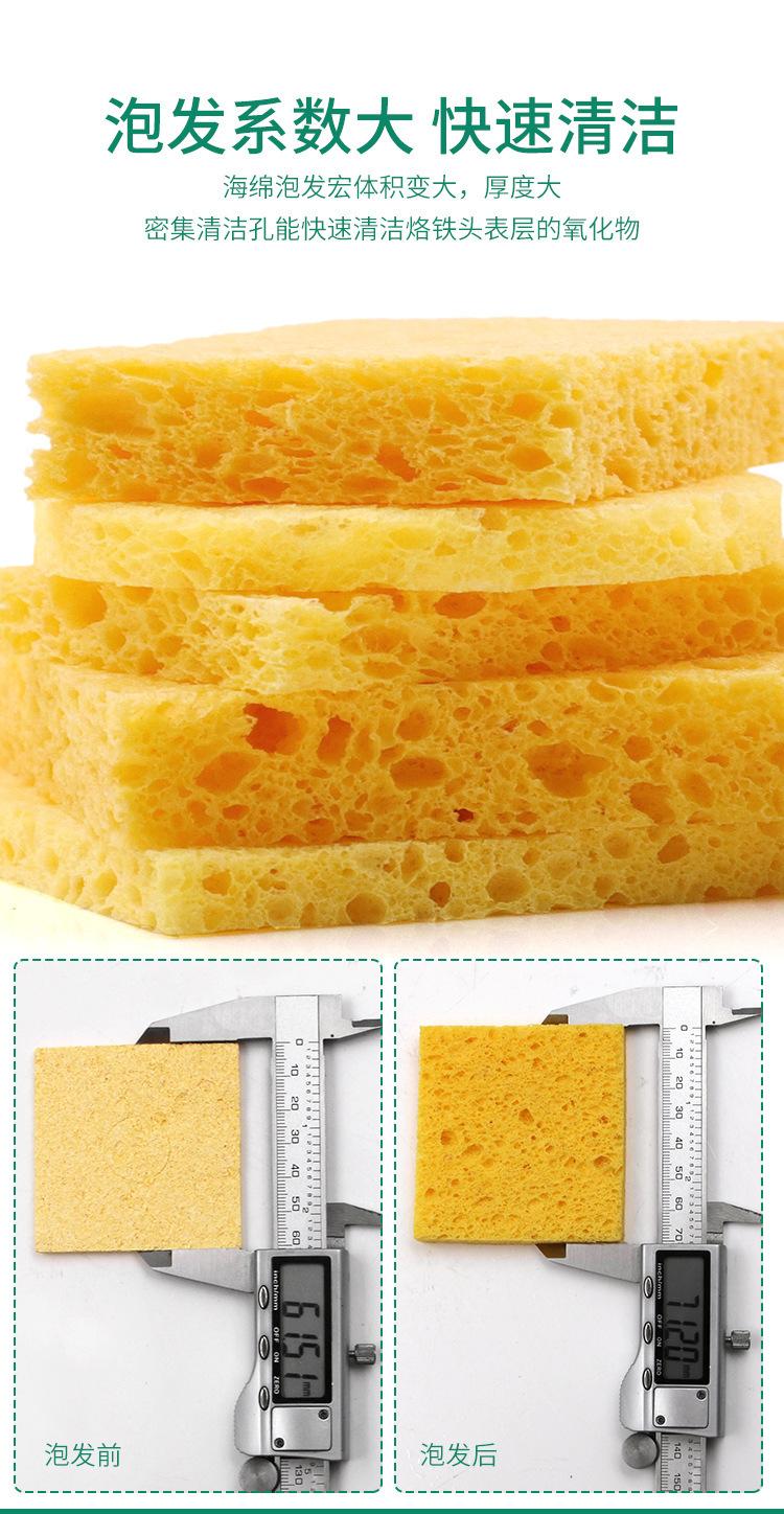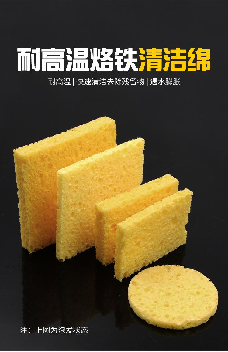 A esponja de limpeza de soldagem, colocada no suporte do ferro de solda, é usada para limpar a ponta do ferro de solda. Ela pode limpar o óxido na superfície da ponta do ferro de solda sem danificar a camada de liga da ponta do ferro de solda. Ela pode evitar que a ponta do ferro de solda oxide, superaqueça e queime, remover resíduos de solda e manter os componentes do PCB limpos.