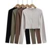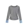 Camisa de gola redonda estilo europeu e americano, blusa de fundo fino com pregas, design feminino, manga comprida, listrada, costura, cor contrastante, camiseta simples
