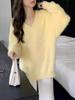 Exportação Transfronteiriça Estilo Preguiçoso Imitação Veludo Vison Decote V Pulôver Tricô para Mulheres Outono e Inverno Novo Tricô Solto Macio Ceroso para Mulheres