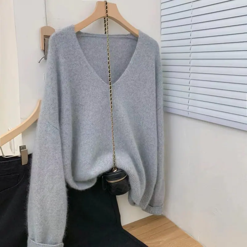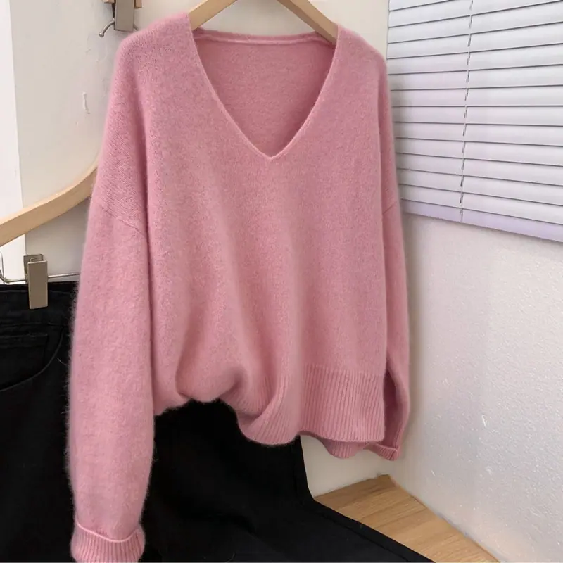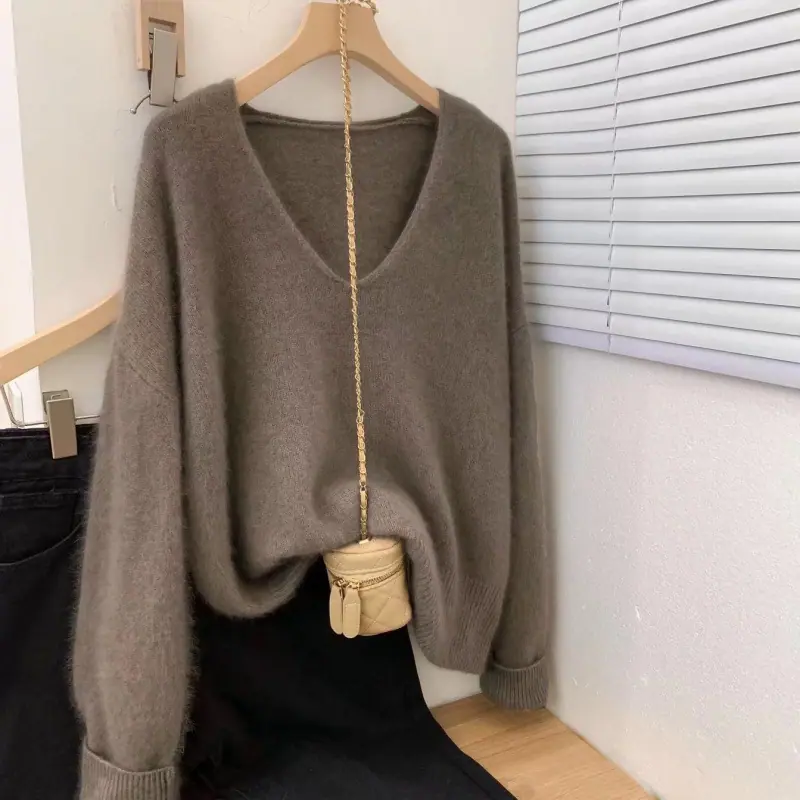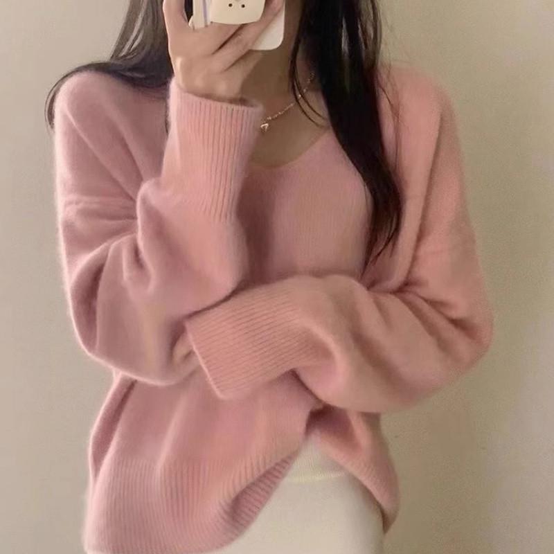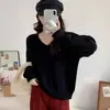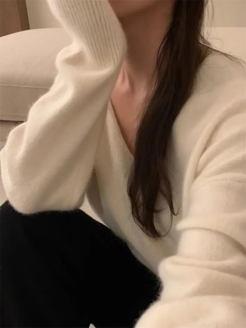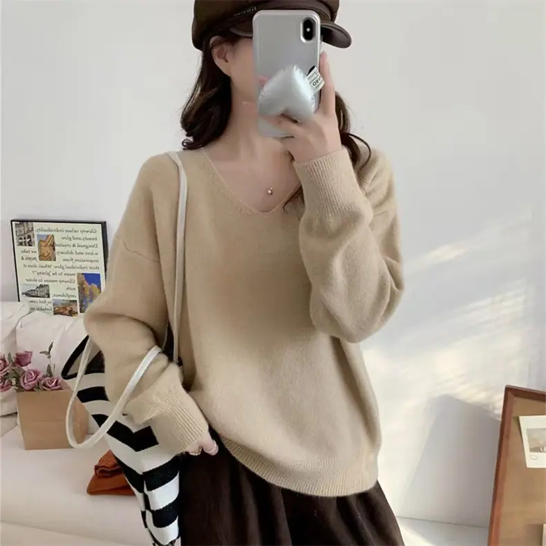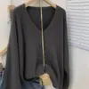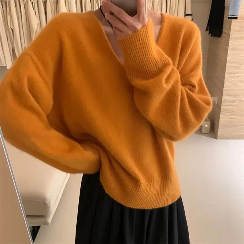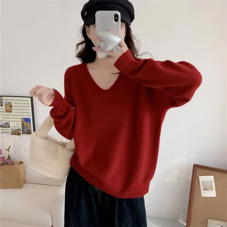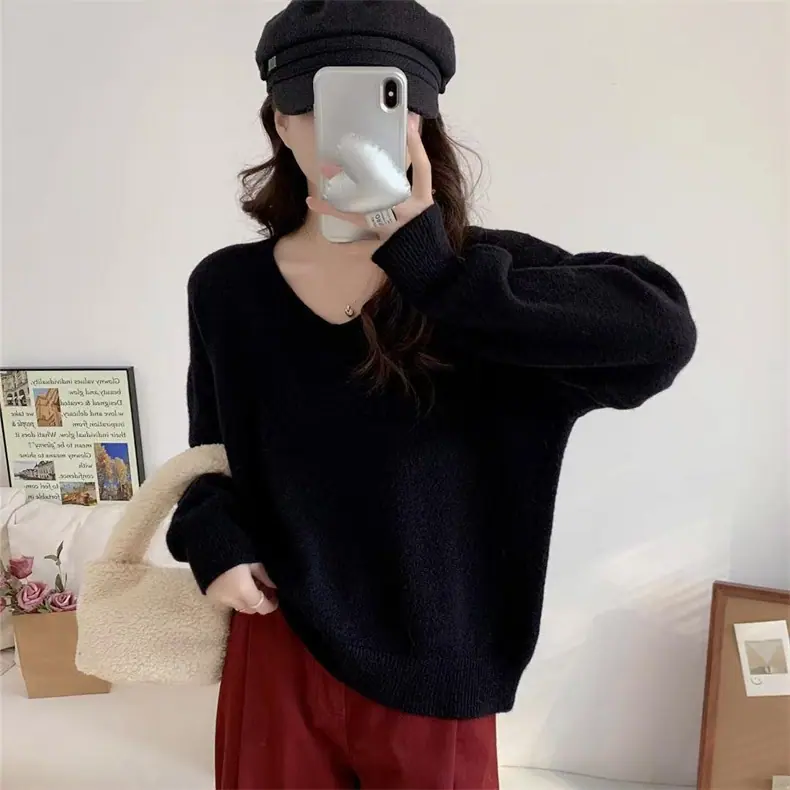 Novo suéter feminino de cor sólida, macio, encerado, estilo preguiçoso, solto, emagrecedor, gola em V, base, suéter para outono e inverno