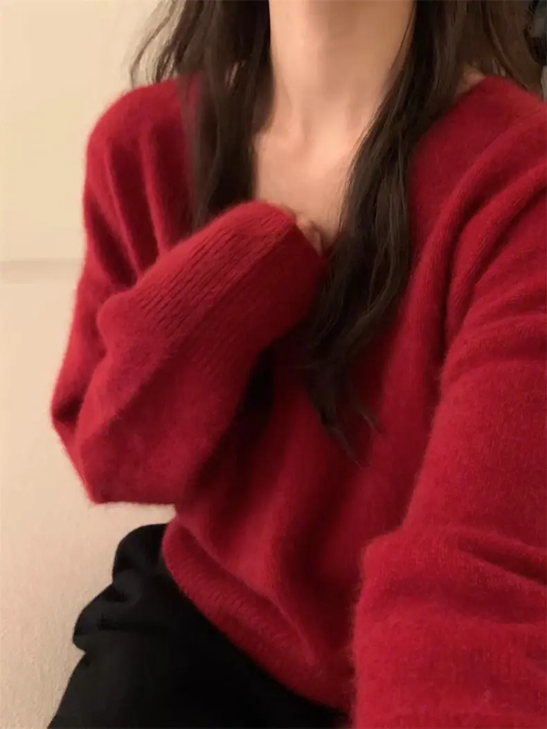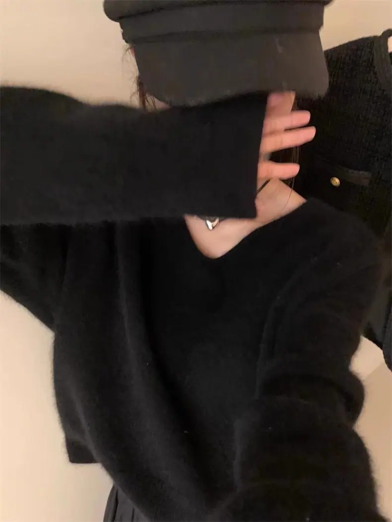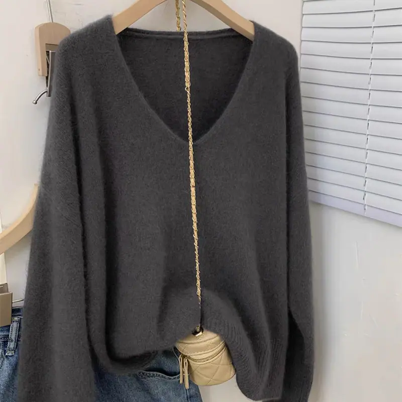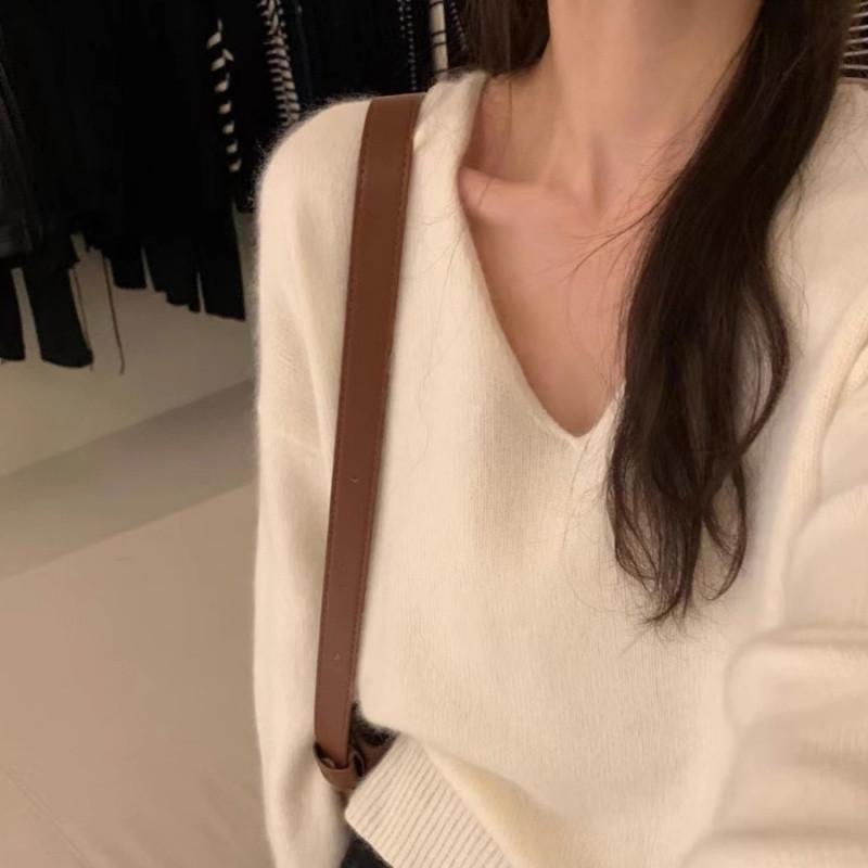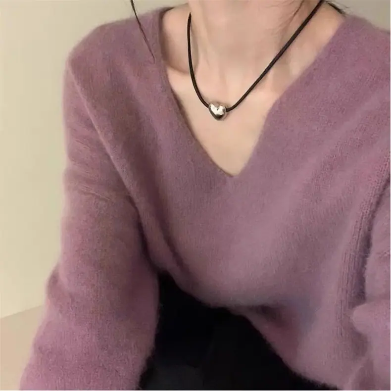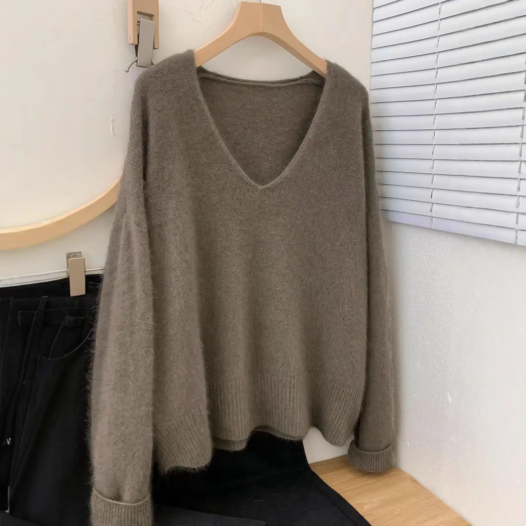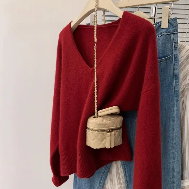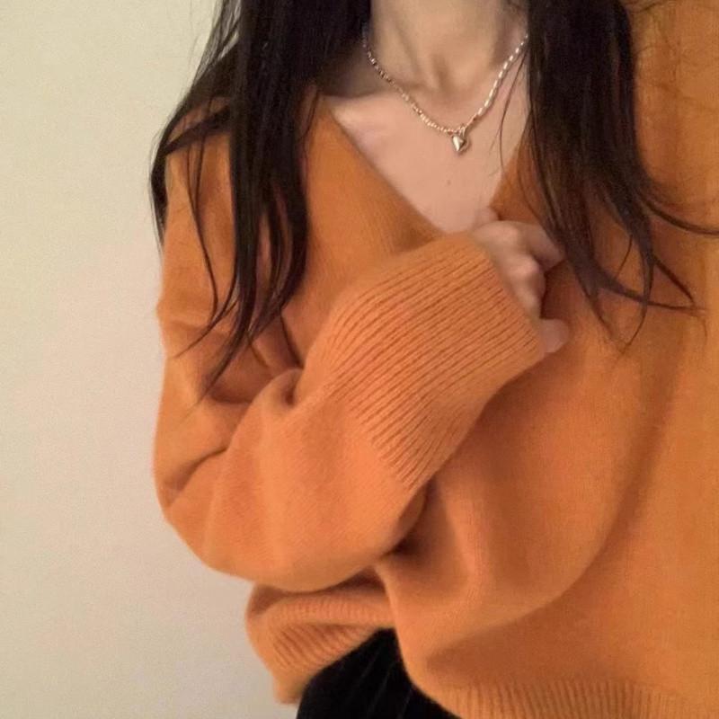 Novo suéter feminino de cor sólida, macio, encerado, estilo preguiçoso, solto, emagrecedor, gola em V, base, suéter para outono e inverno