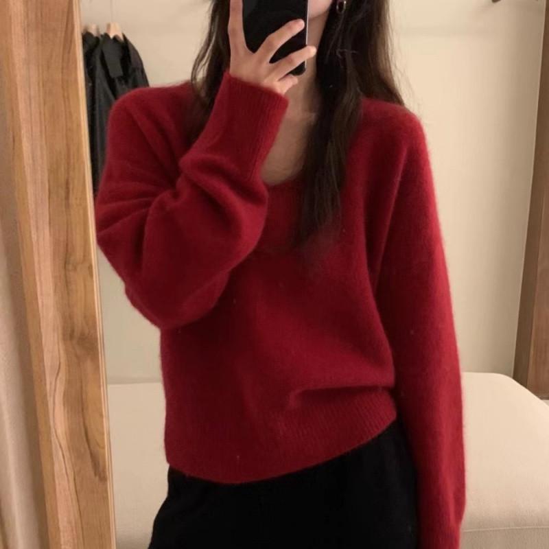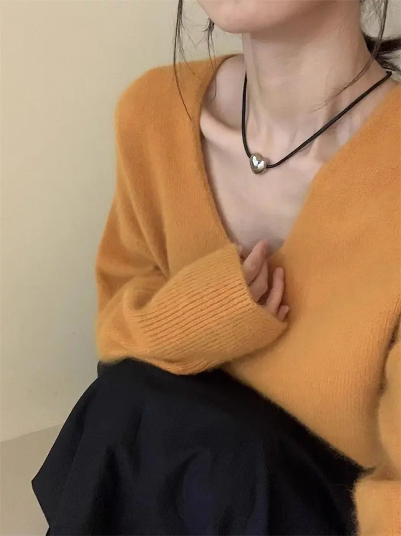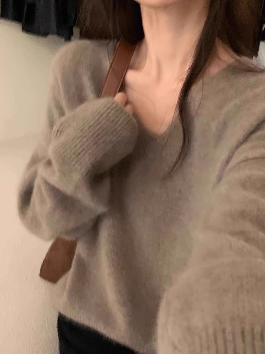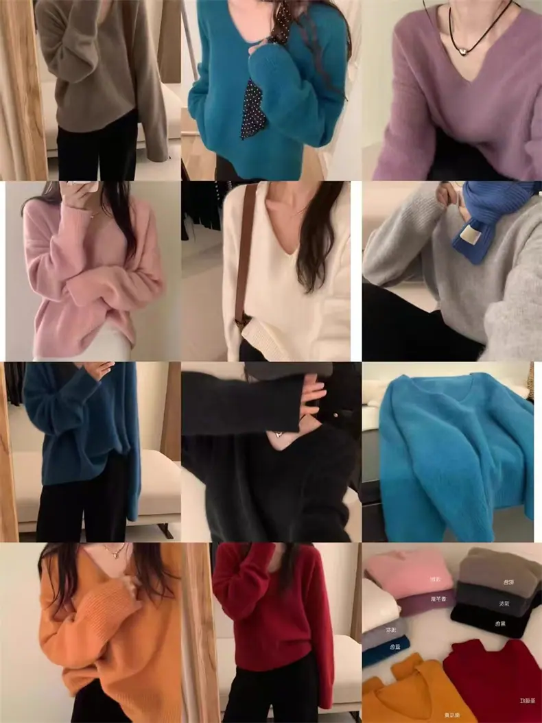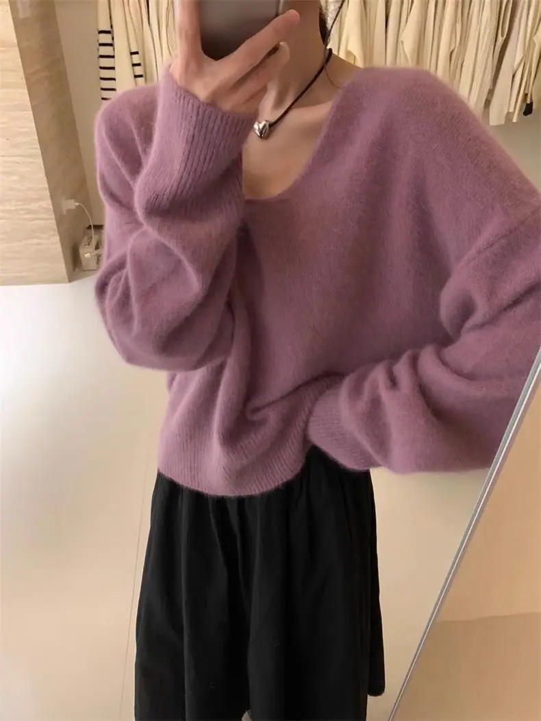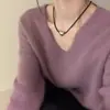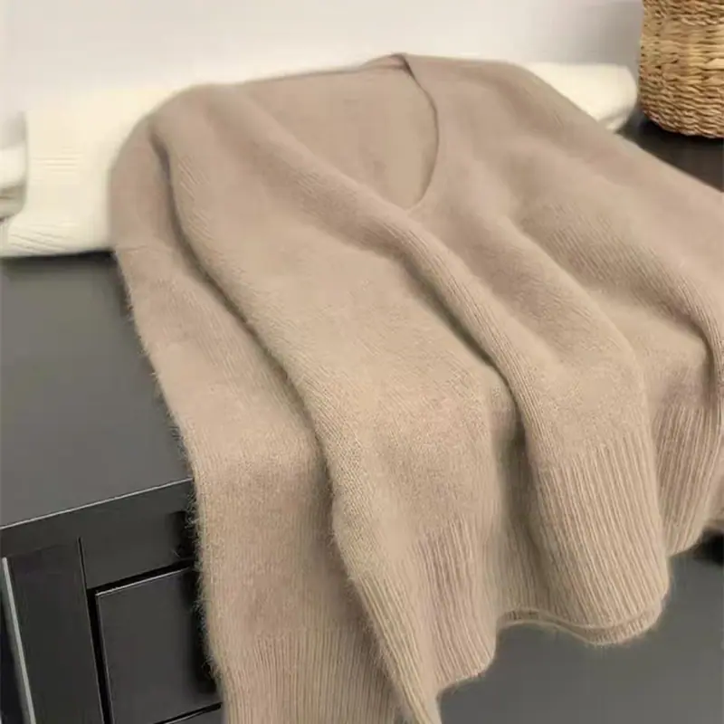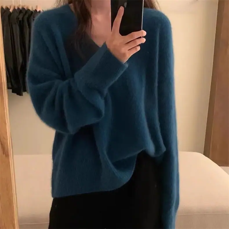 Novo suéter feminino de cor sólida, macio, encerado, estilo preguiçoso, solto, emagrecedor, gola em V, base, suéter para outono e inverno