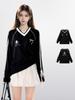 Moletom Americano Listrado Preto com Decote V Estilo Esportivo para Mulheres Primavera & Outono Solto Preguiçoso Moderno Marca Jersey Top com Laço