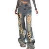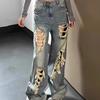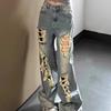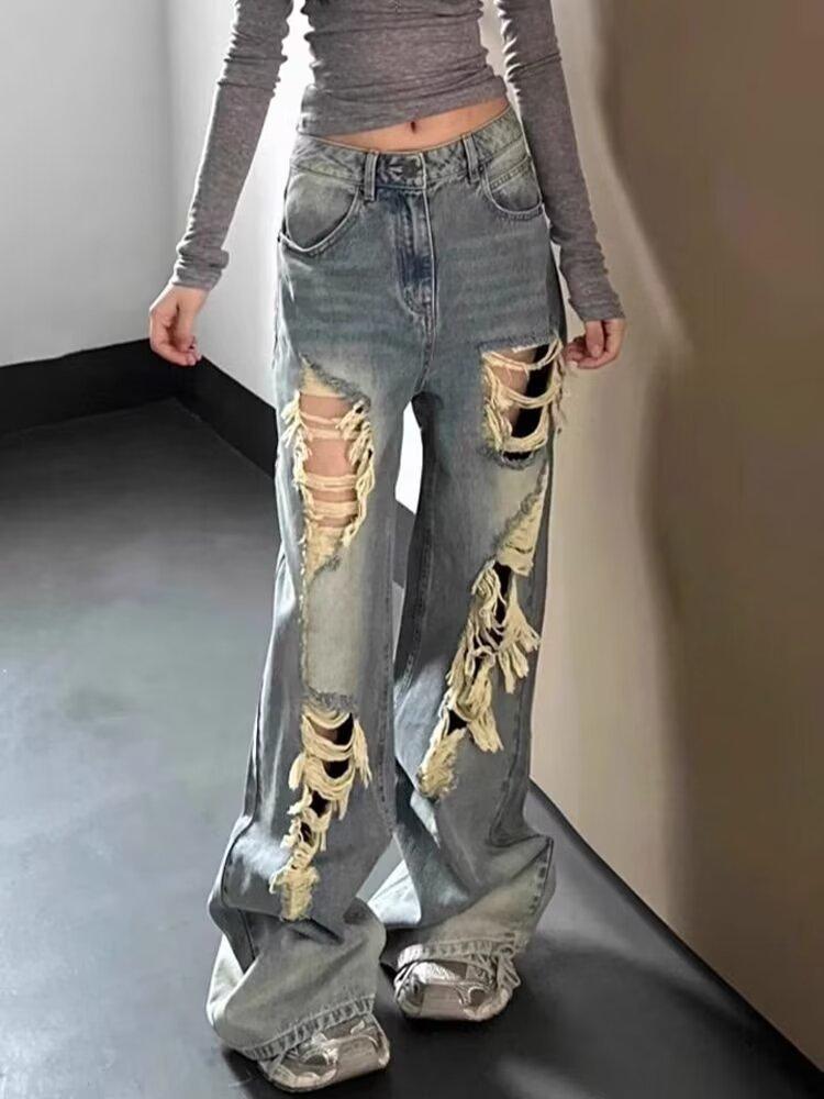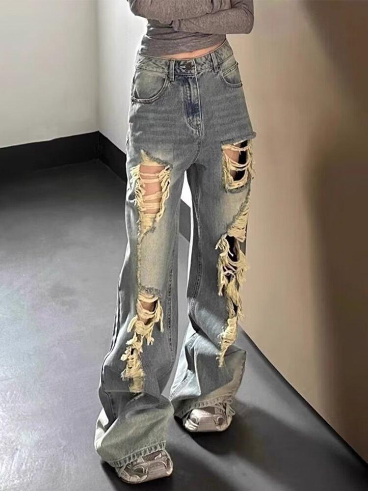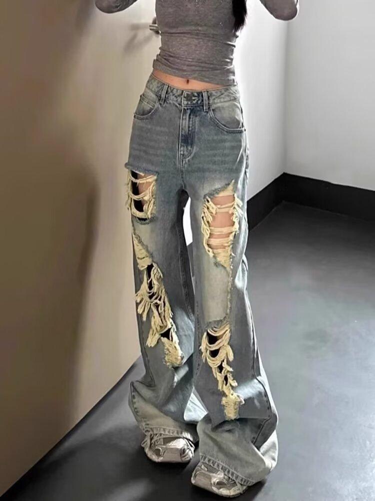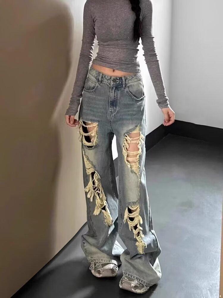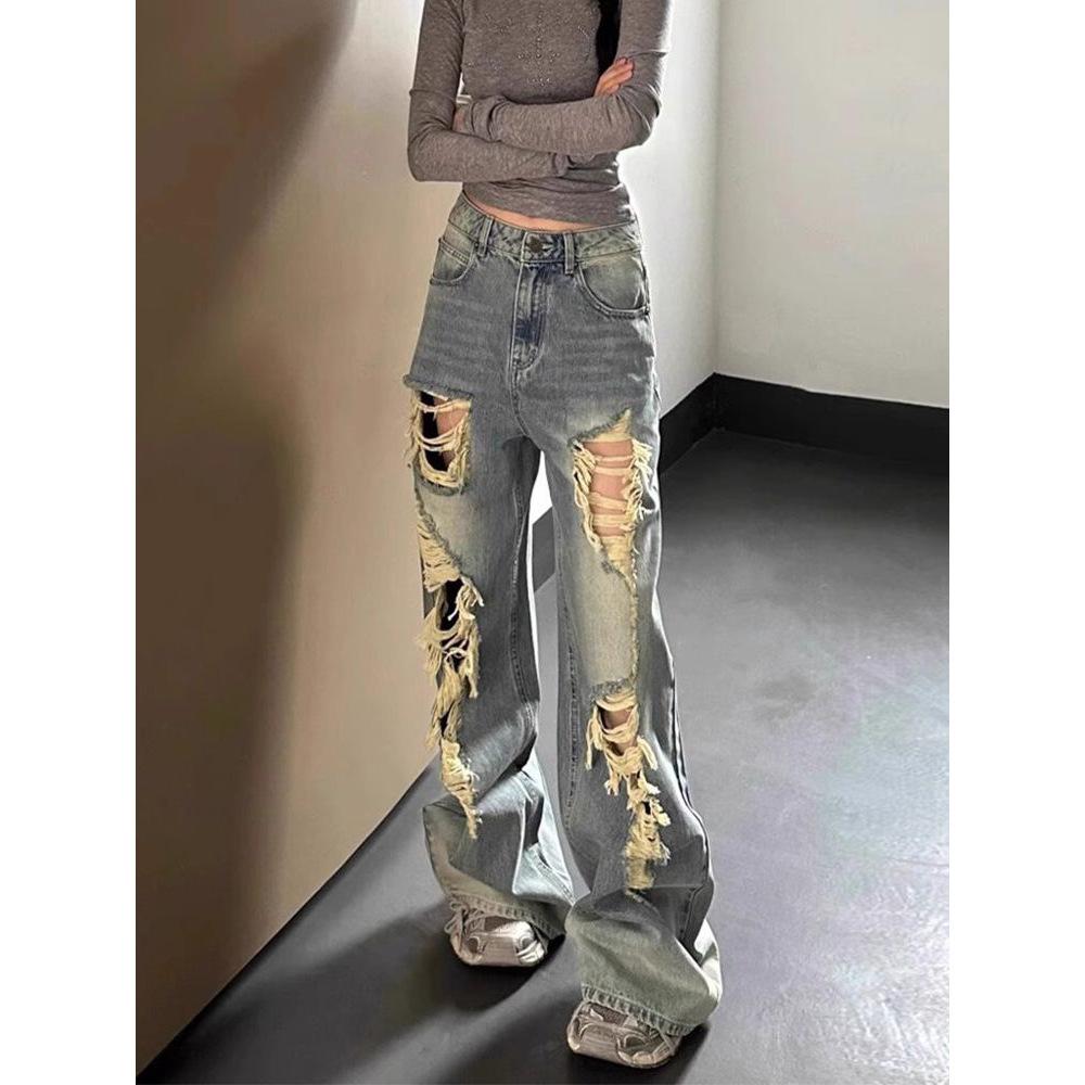 Jeans estilo americano retrô lavado rasgado feminino 2024 novo verão cintura alta solto emagrecimento perna reta perna larga calças