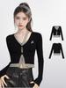 Suéter preto falso de duas peças de manga comprida, suéter de malha feminino, outono e inverno, camisa de base interna slim fit, top curto, início do outono