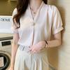 Real Shot 2023 Verão Novo Estilo Coreano All-match V-neck Manga Curta Cetim Slim Camisa Feminina Verão Top