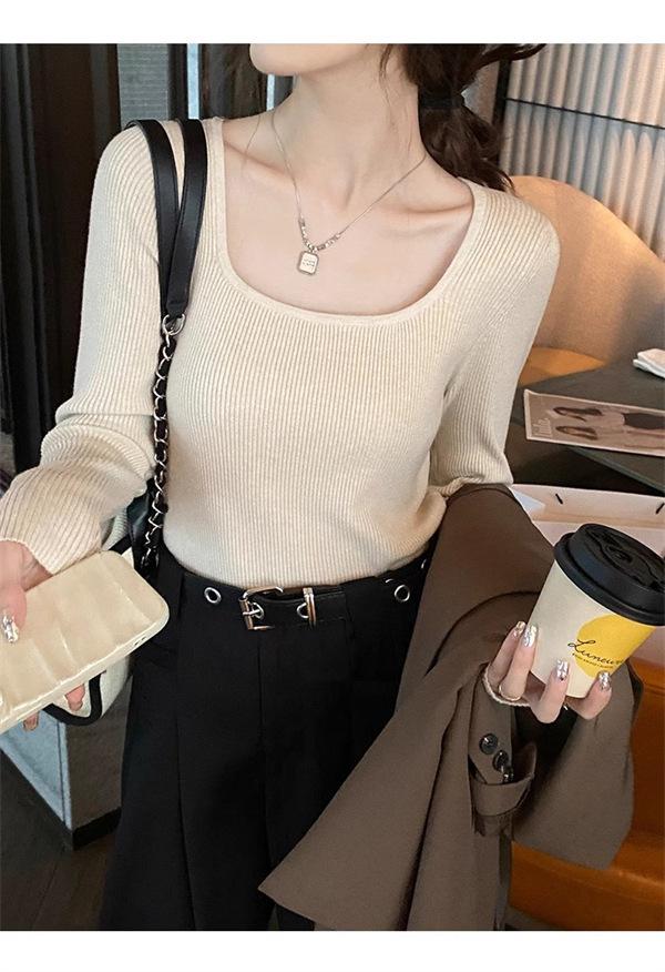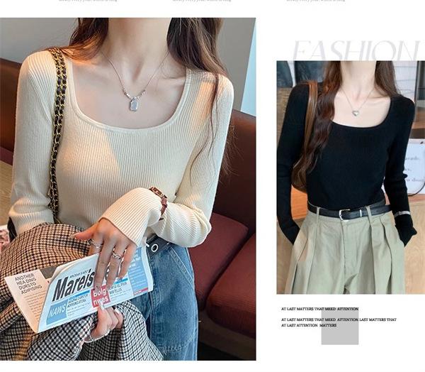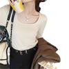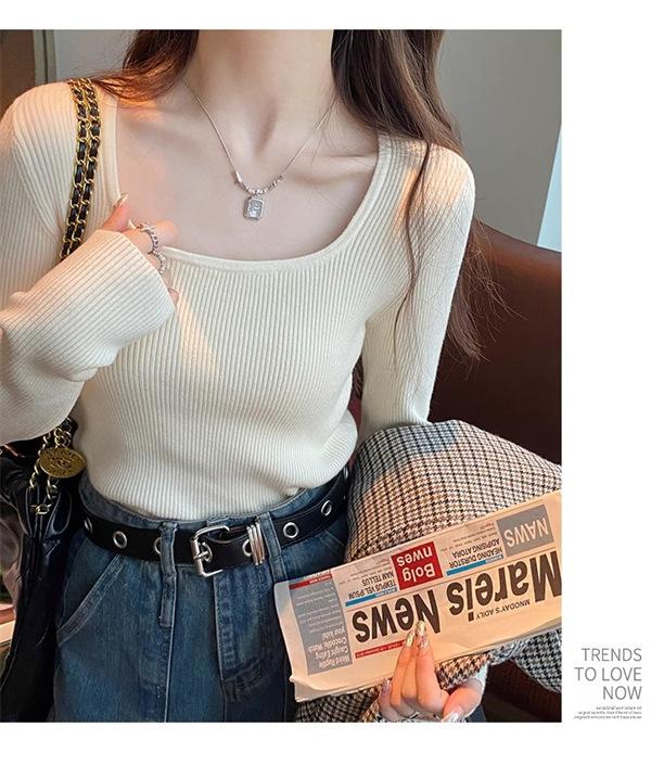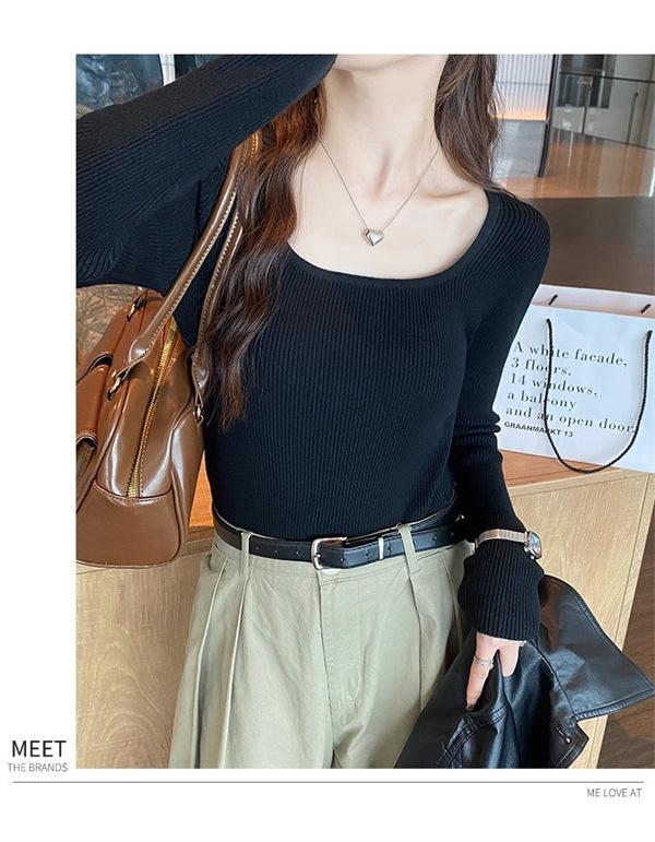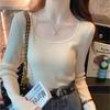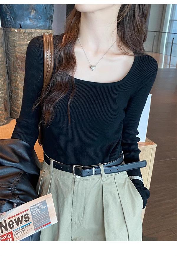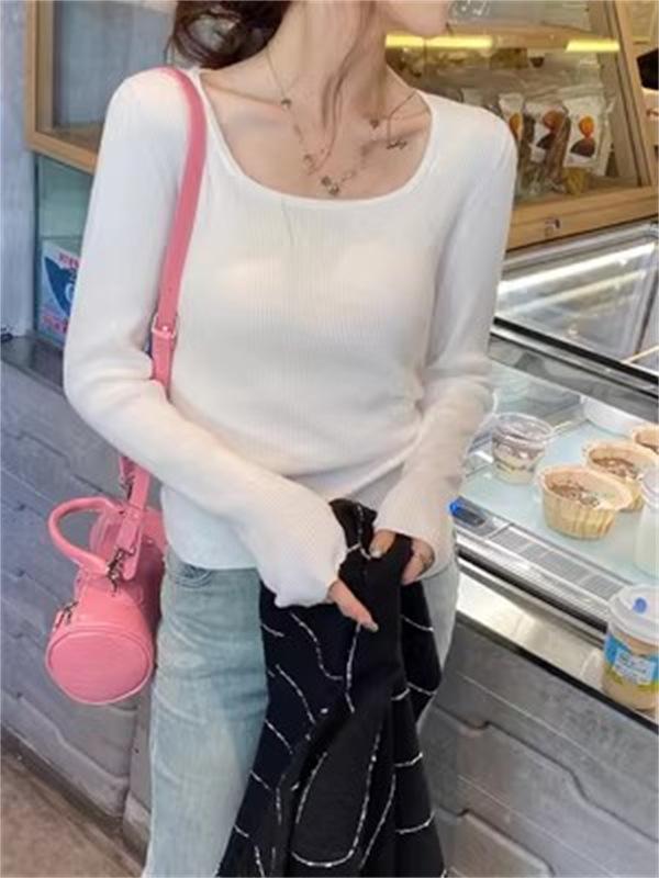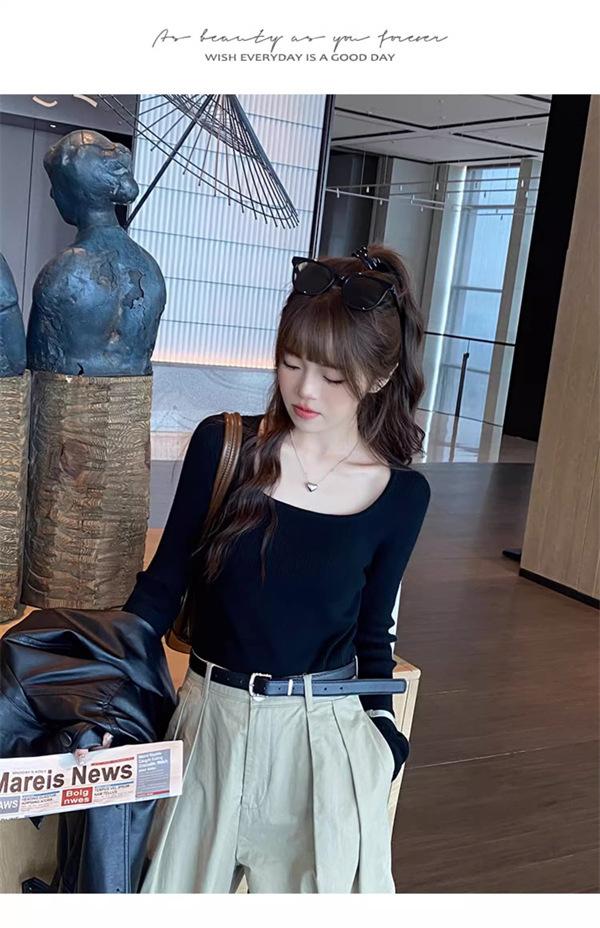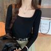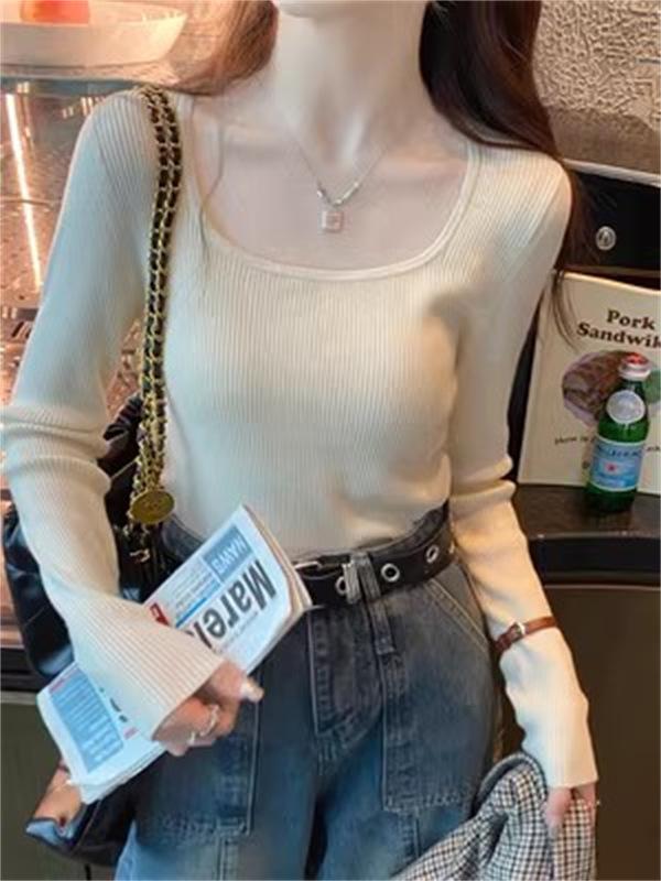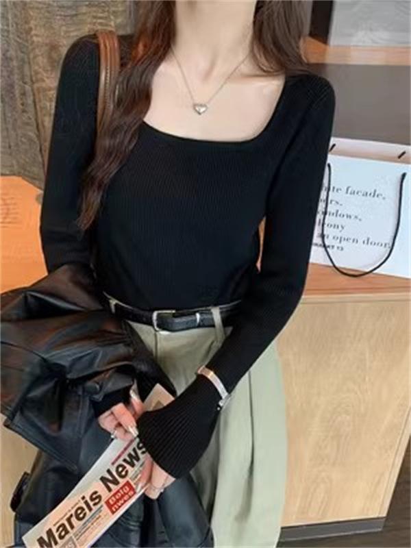 Camiseta Preta de Base com Decote Quadrado para Mulheres, Top de Tricô de Outono e Inverno, Suéter Slim-Fit de Manga Longa 2025, Elegante e Estiloso