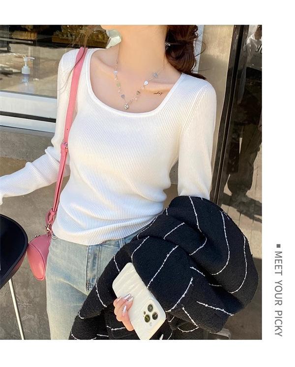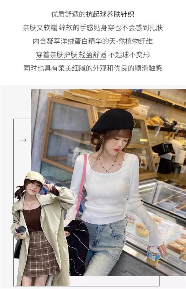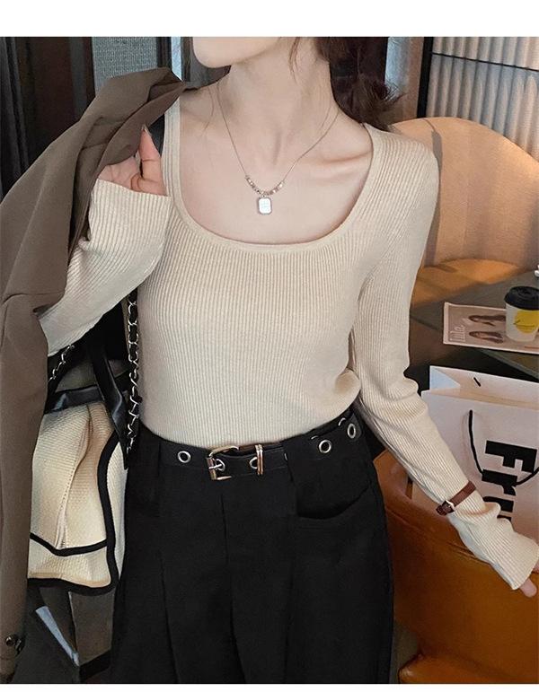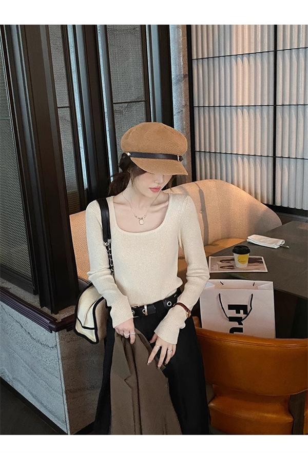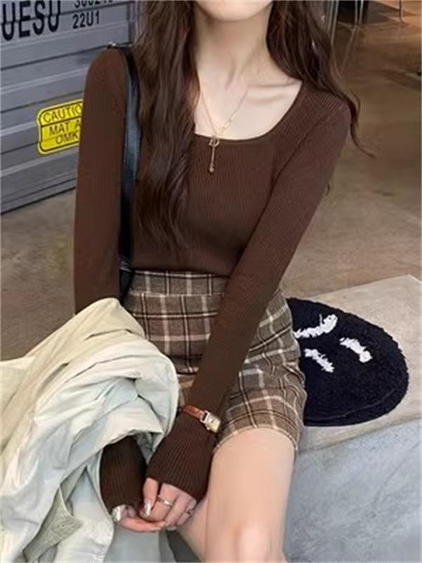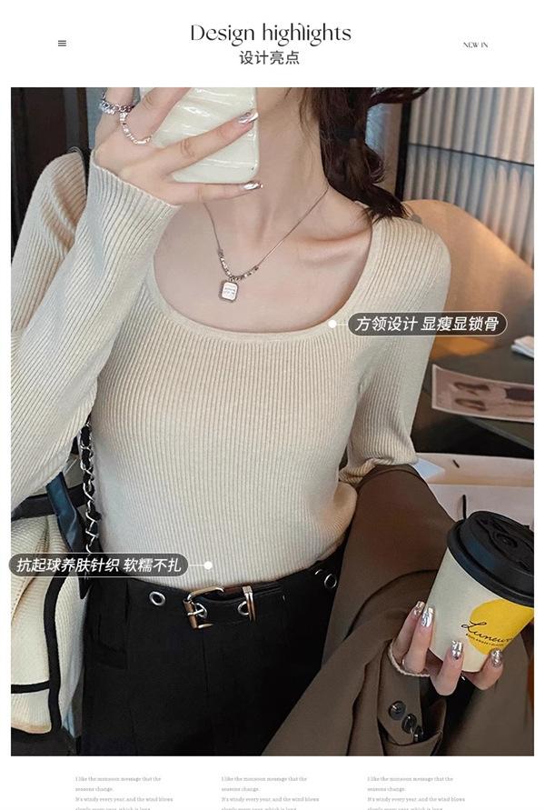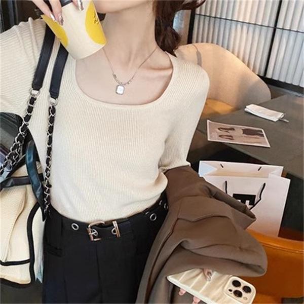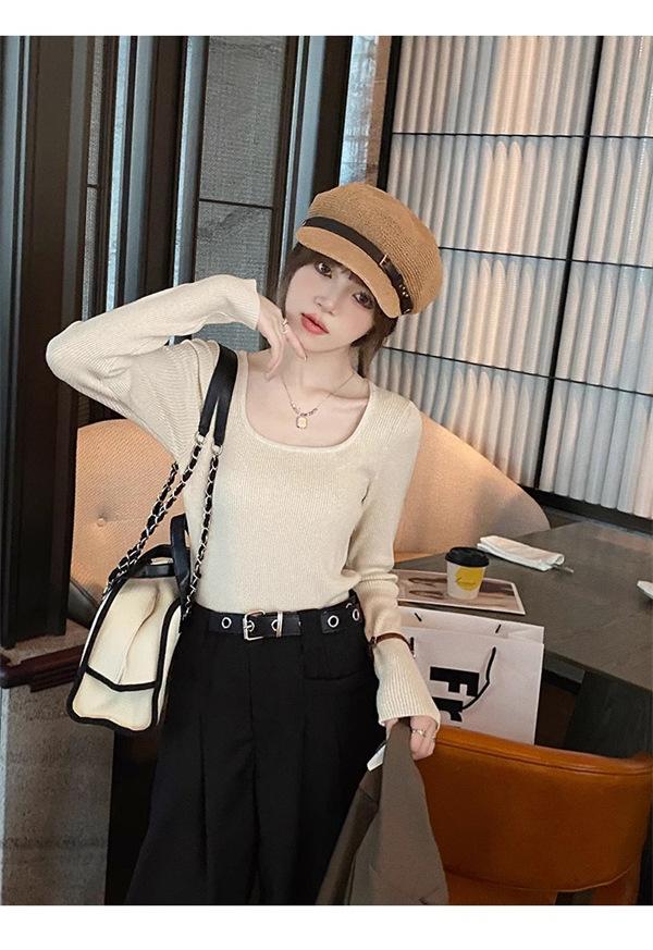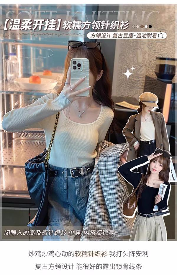 Camiseta Preta de Base com Decote Quadrado para Mulheres, Top de Tricô de Outono e Inverno, Suéter Slim-Fit de Manga Longa 2025, Elegante e Estiloso