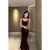 Liquidação Elegante Vestido Cauda de Peixe Estilo Francês Vestido de Alça de Veludo Preto Feminino 2026 Primavera Slim-Fit Longo