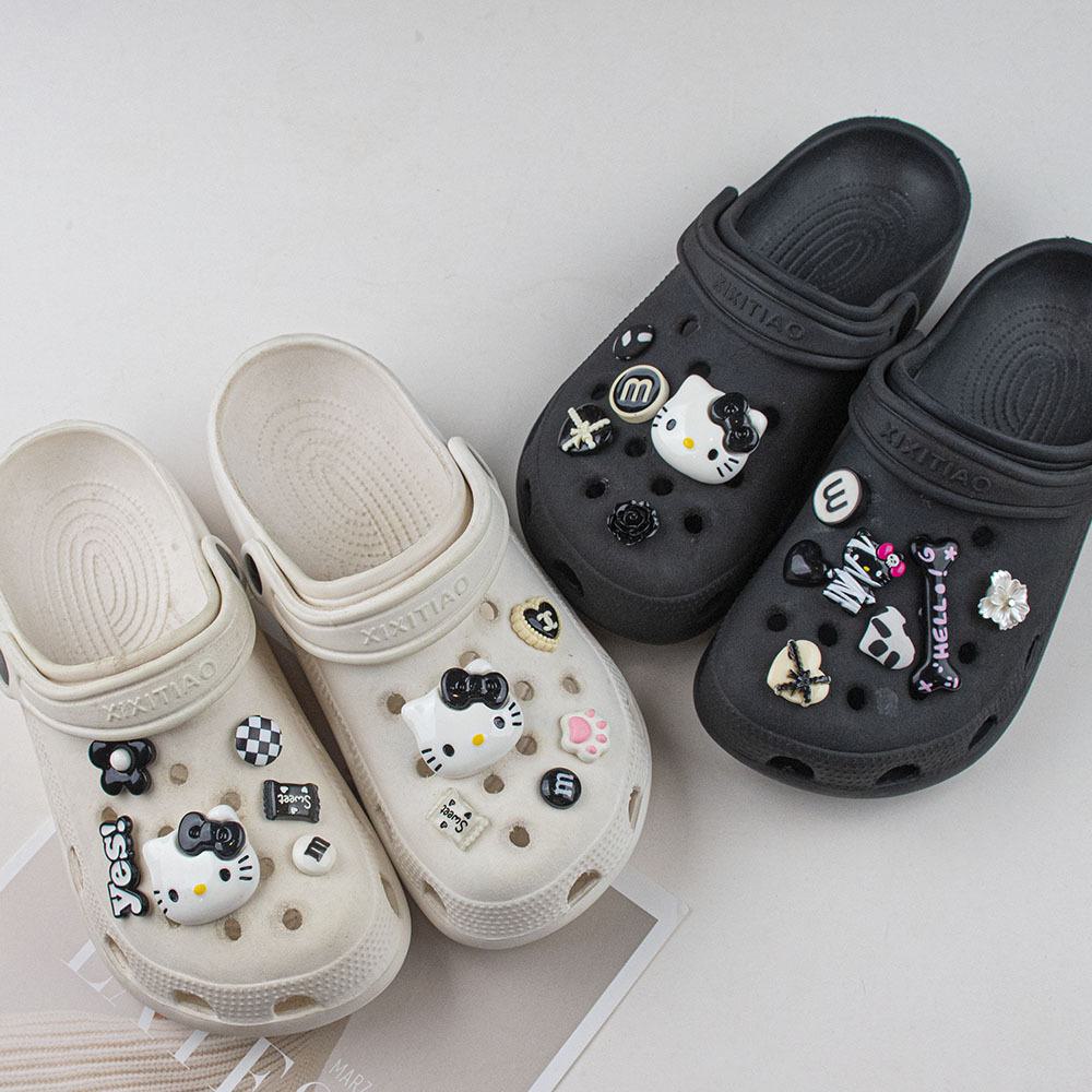 Desenhos animados diy buraco sapatos acessórios buraco sapatos acessórios preto e branco KT gato sapatos flor chinelos fivela decorativa fivela de sapato destacável