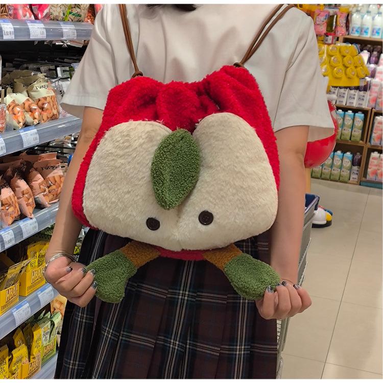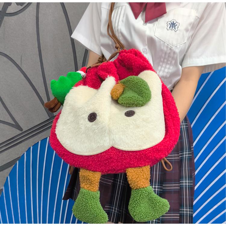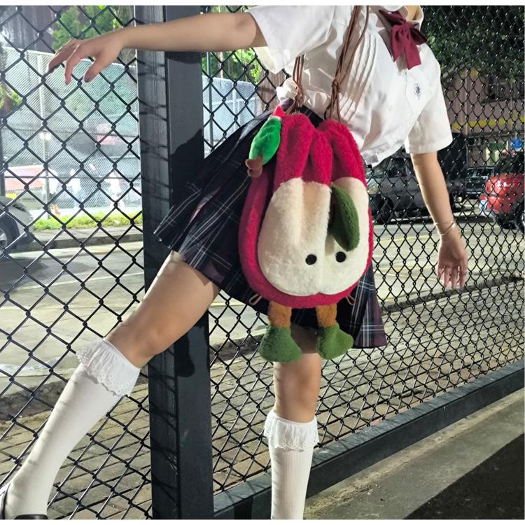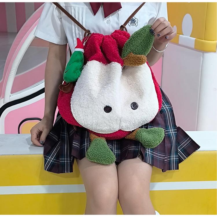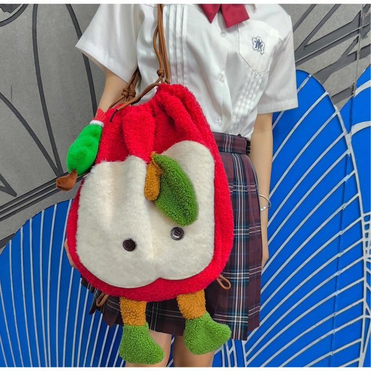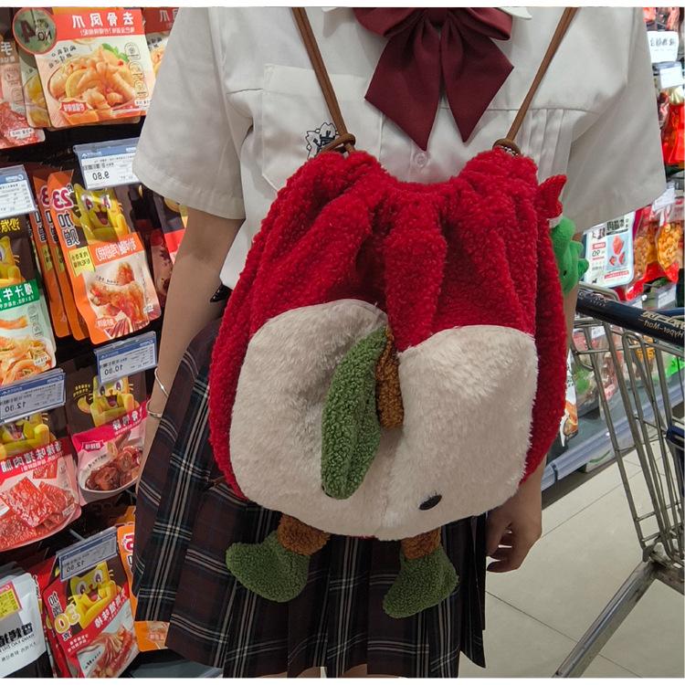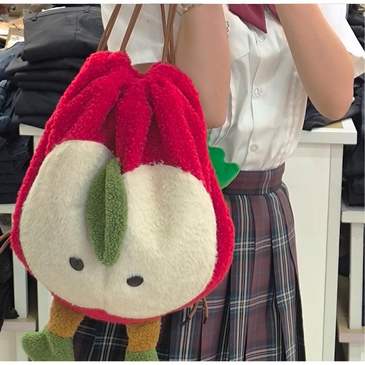 Mochila criativa de desenho animado com cordão de maçã vermelha, bolsa de ombro de pelúcia de grande capacidade, bolsa de ombro de classe de estudante