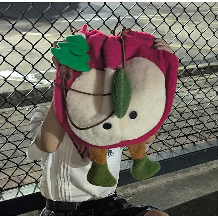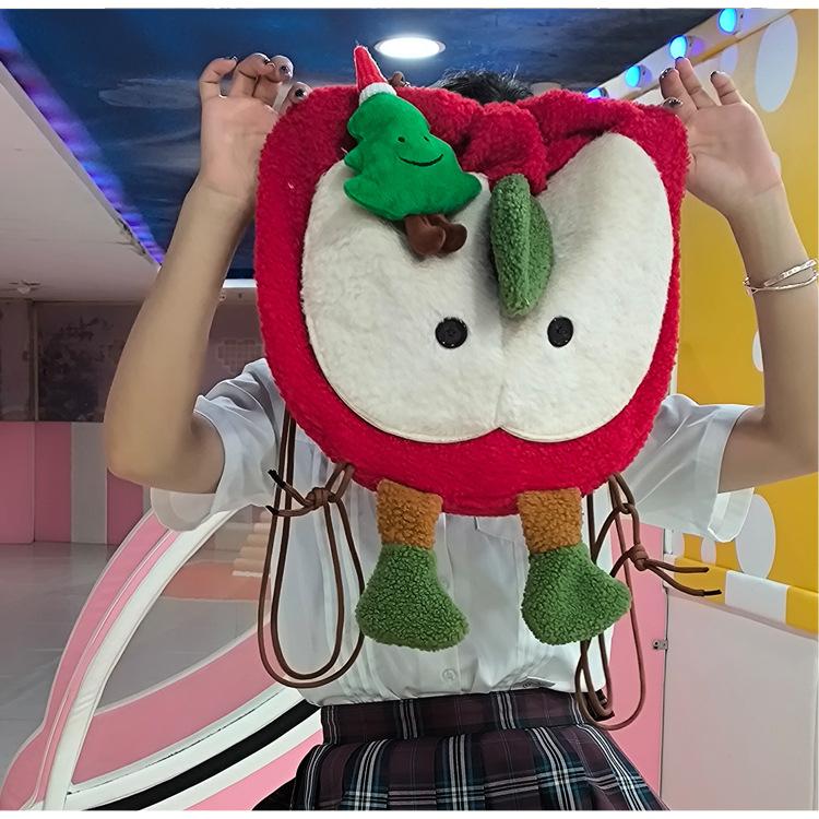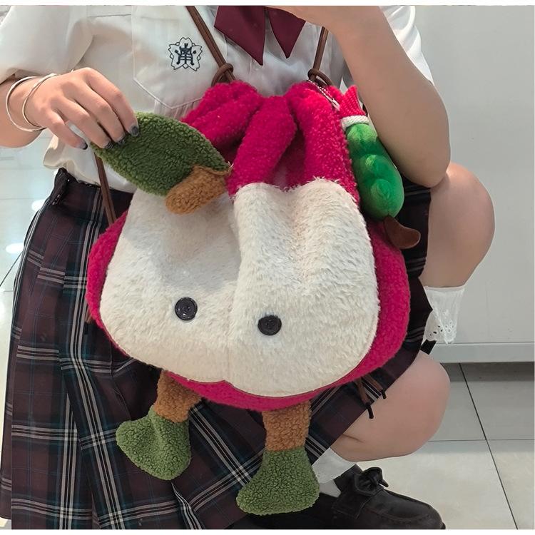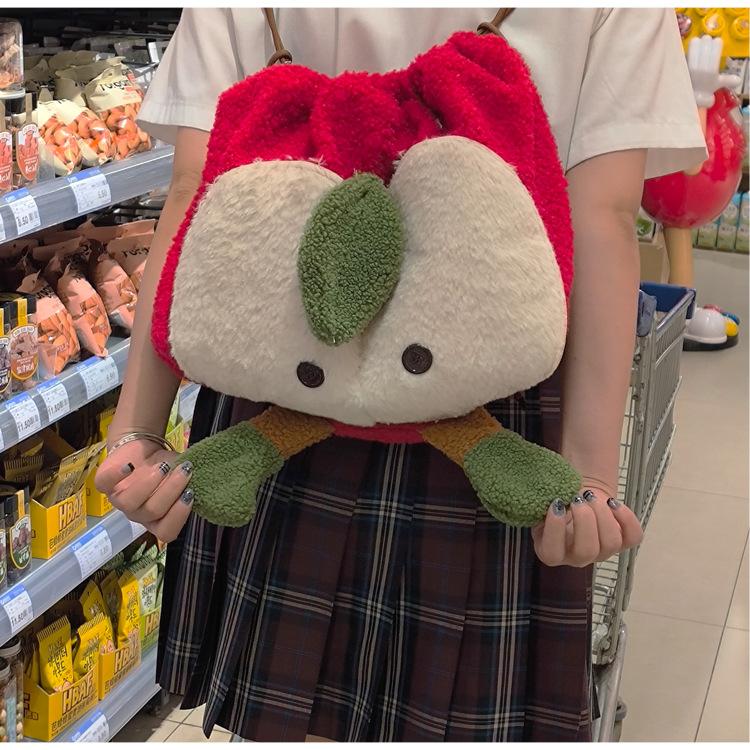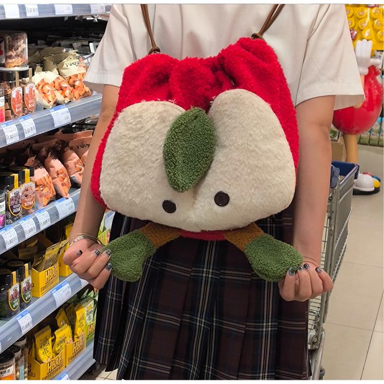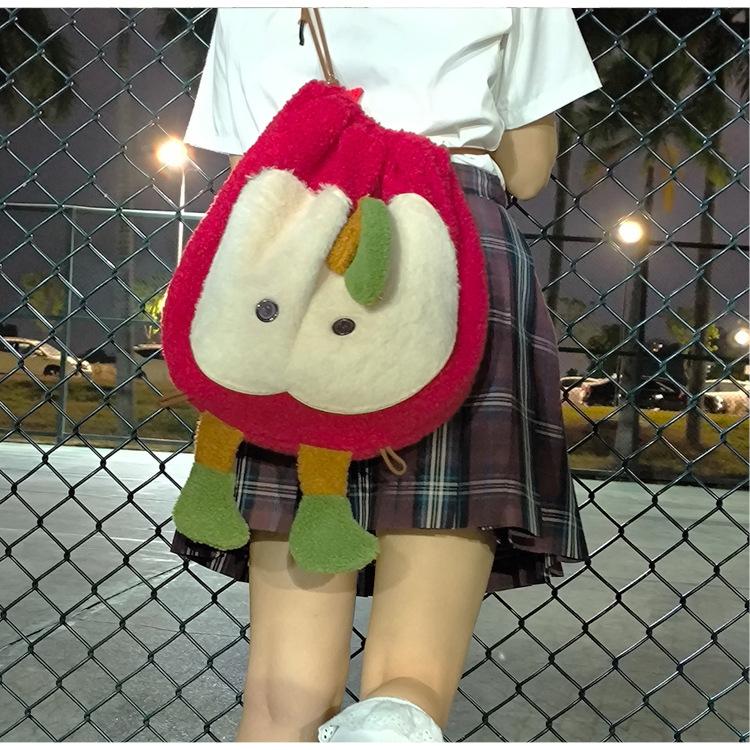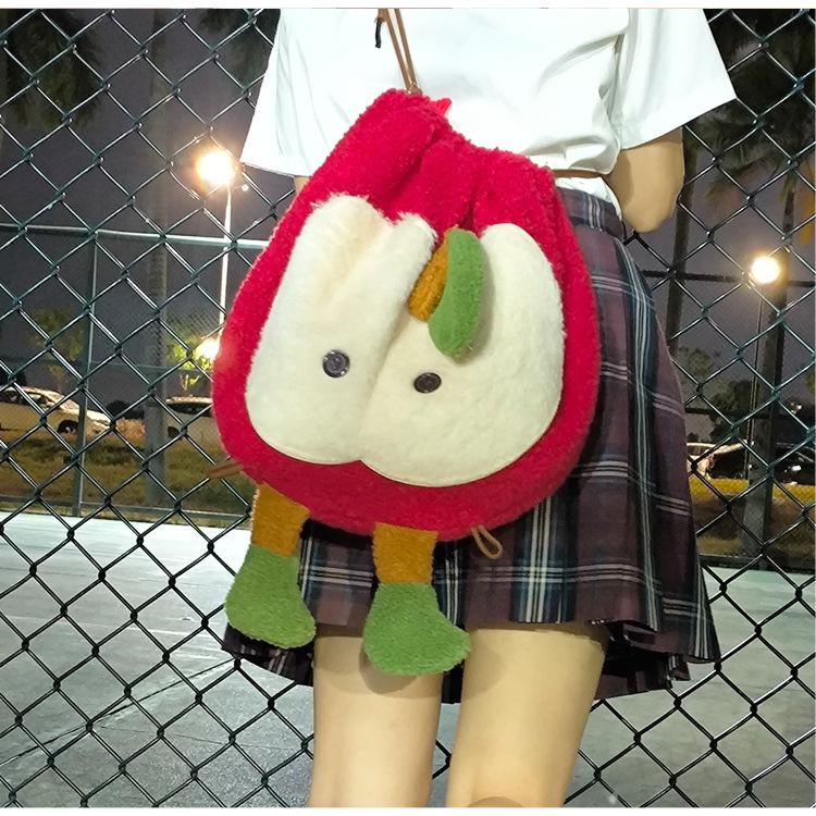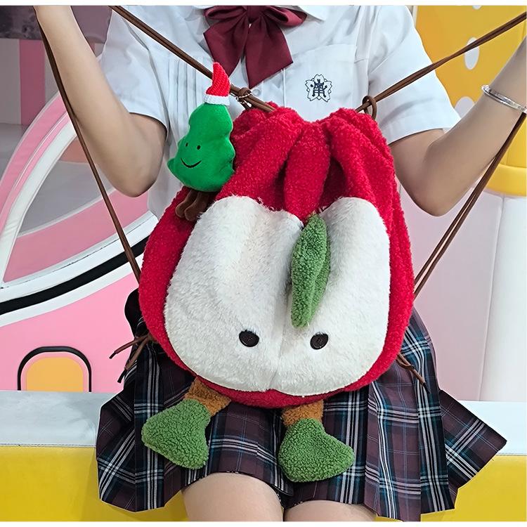 Mochila criativa de desenho animado com cordão de maçã vermelha, bolsa de ombro de pelúcia de grande capacidade, bolsa de ombro de classe de estudante