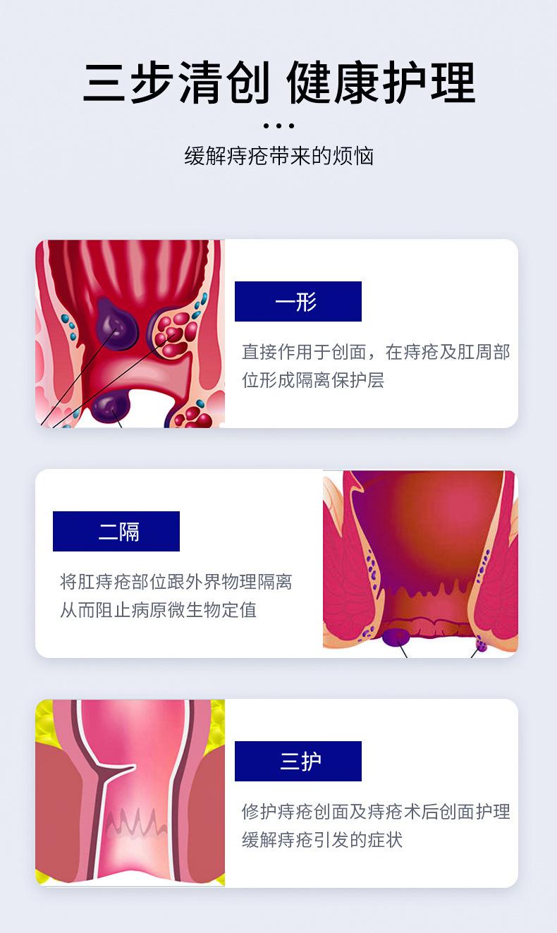 The product forms a protective film on the hemorrhoids and perianal wounds, physically isolating the anal hemo...