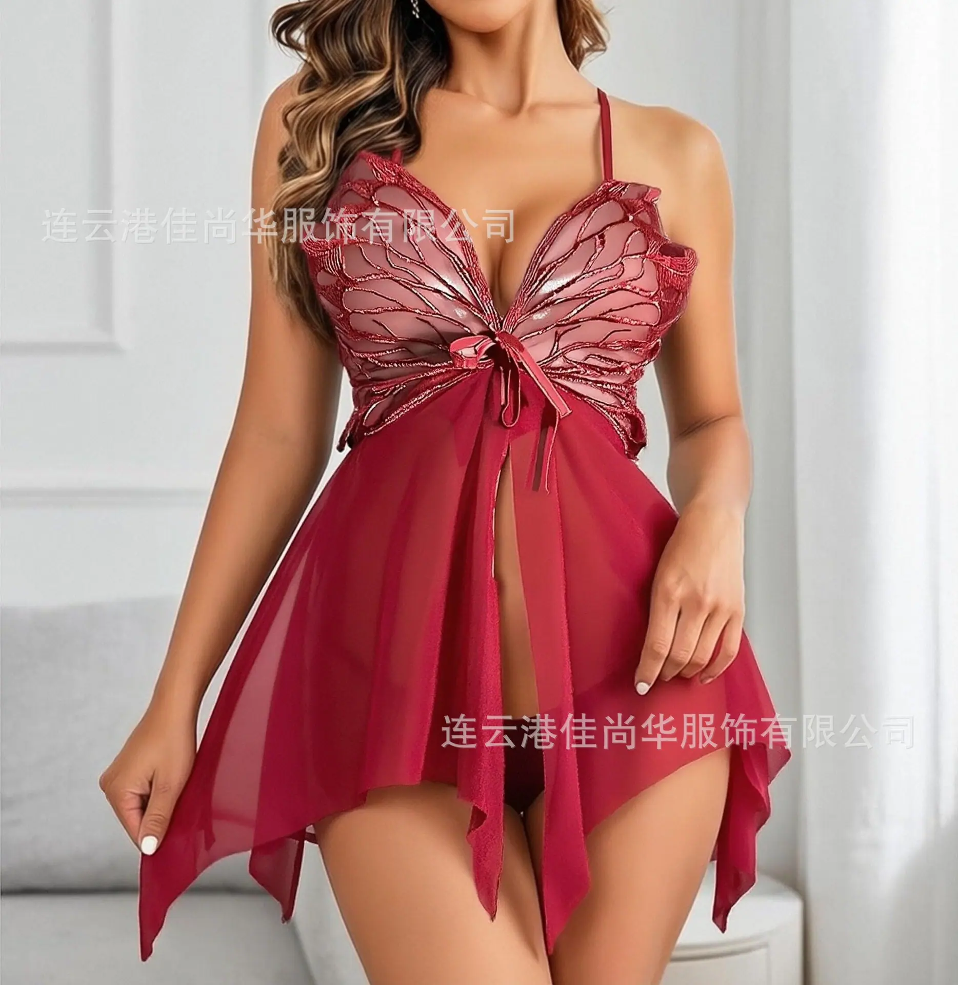 Vestido de Alcinha Fino Transparente com Renda de Borboleta para Outono e Inverno, Costas Abertas, Conjunto de Lingerie e Pijama Sexy para Mulheres