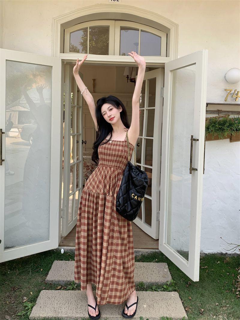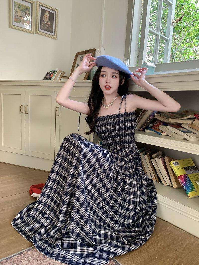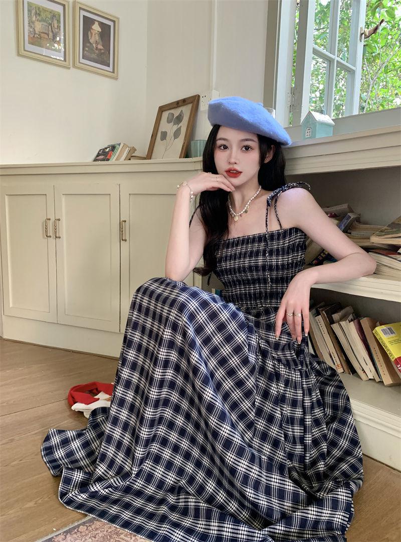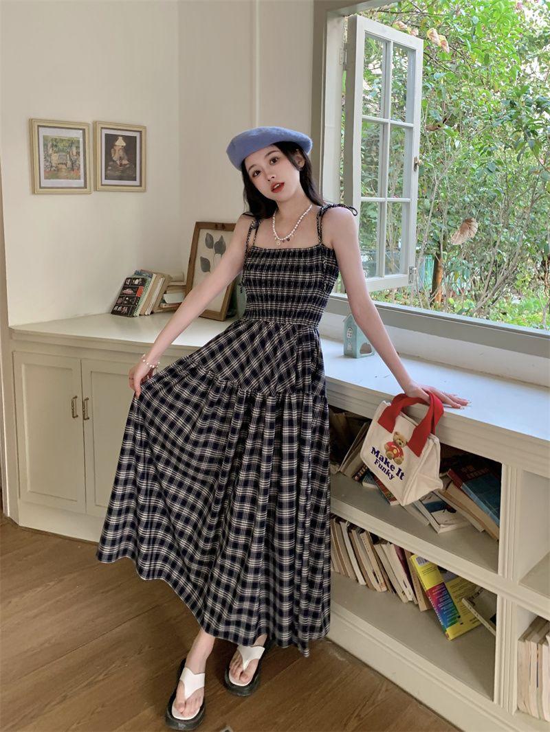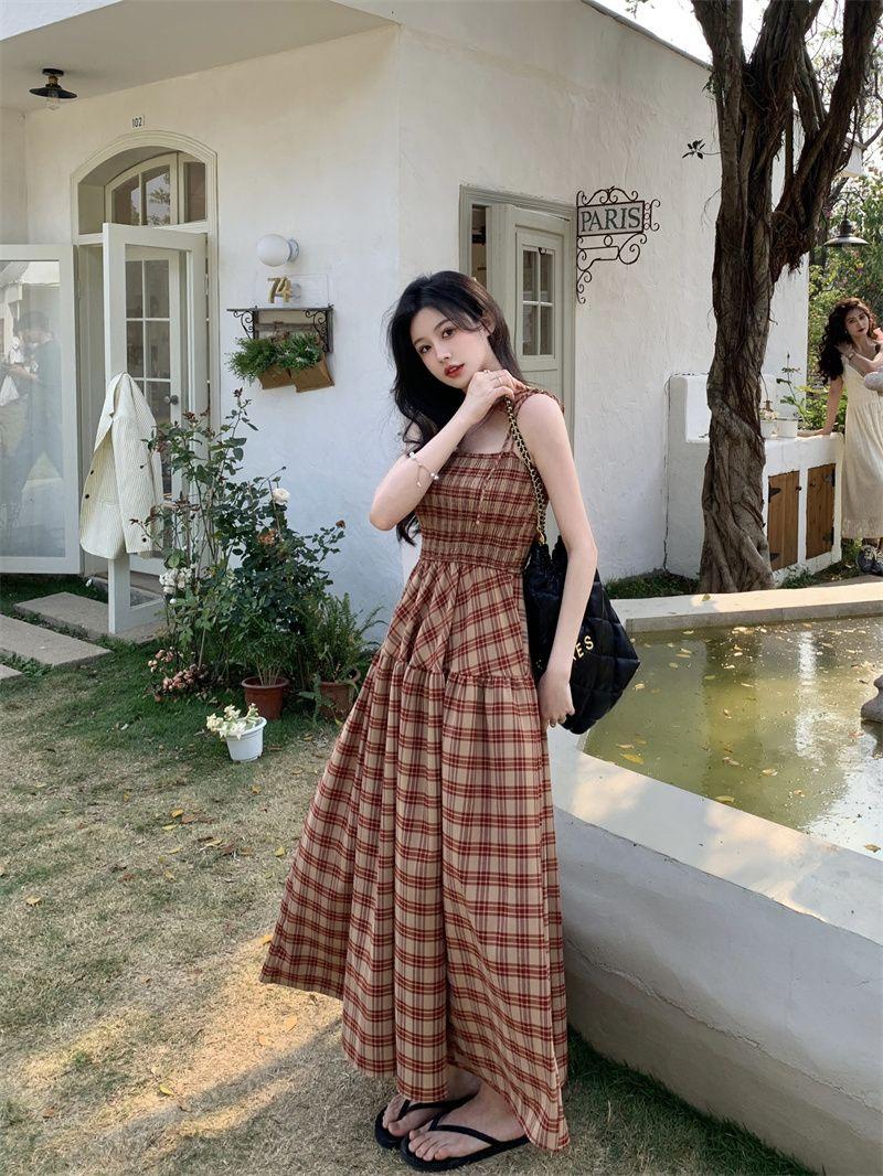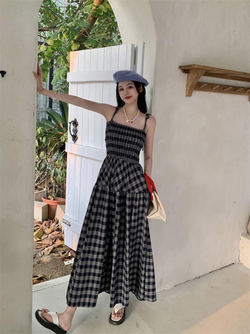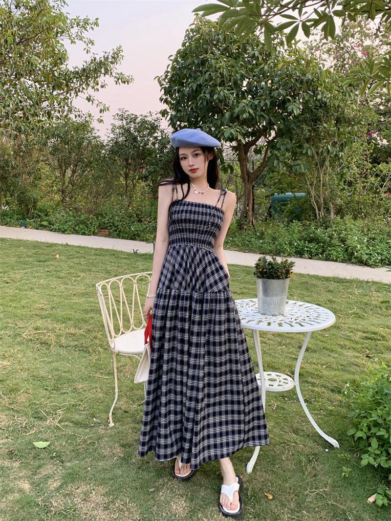Saia estilo francês para chá, nova saia feminina de verão, cintura fina, xadrez, comprimento médio, doce e picante, elegante, vestido tipo sling