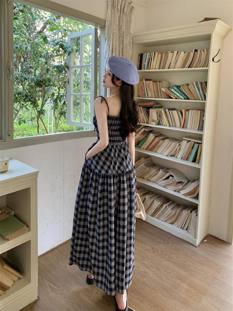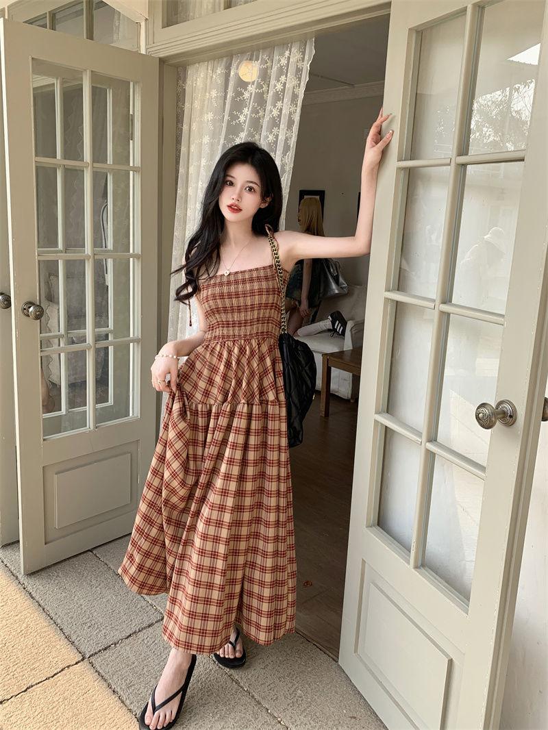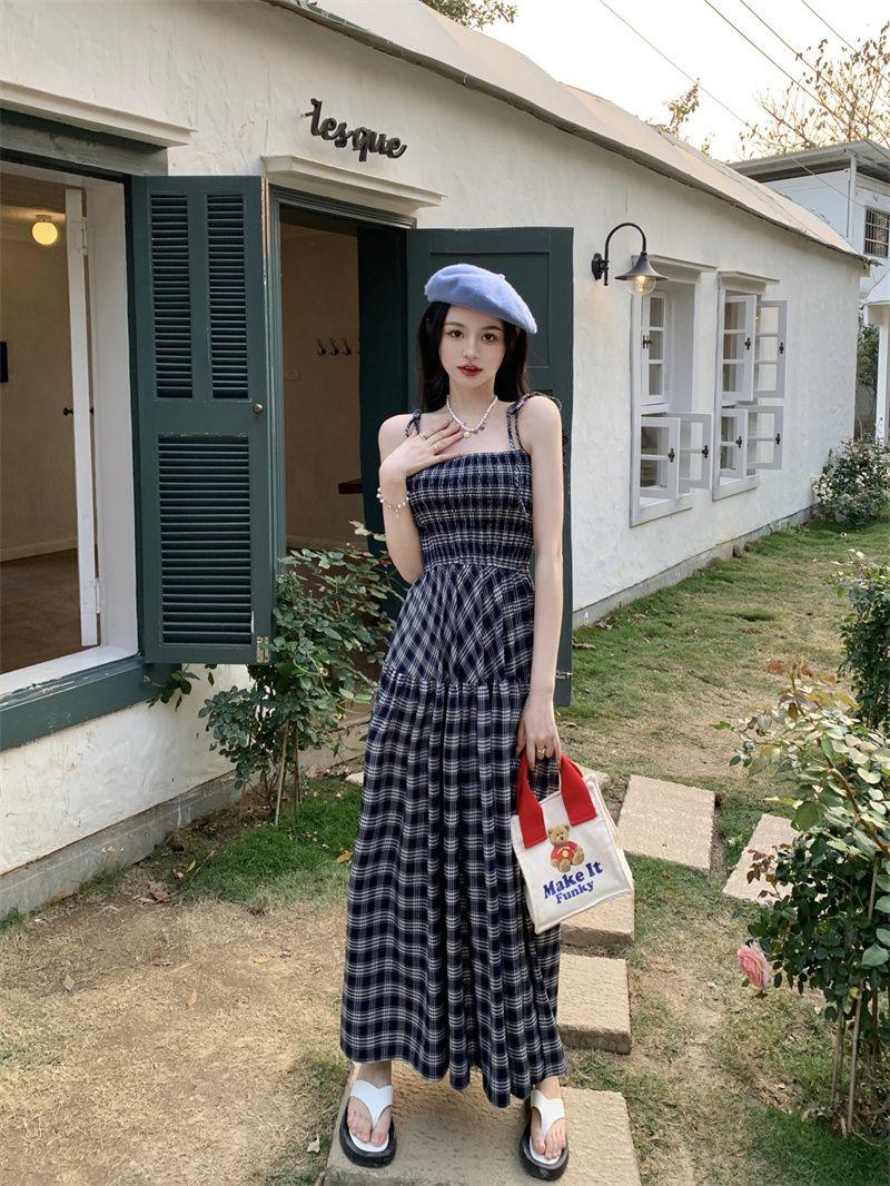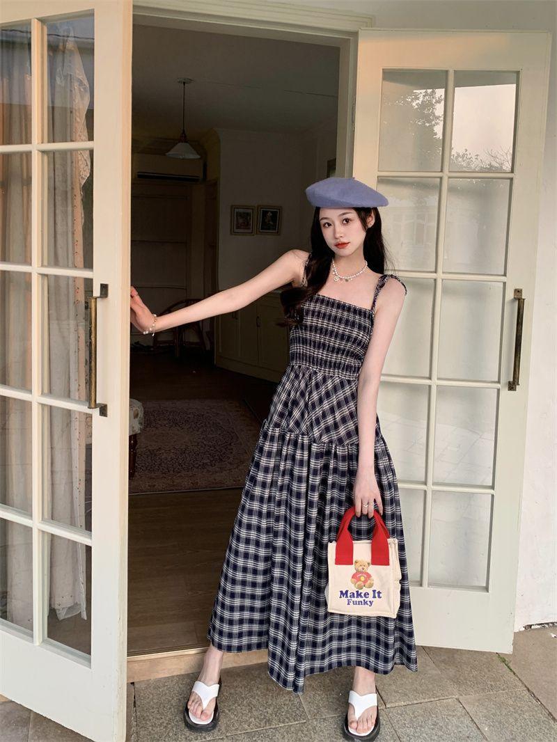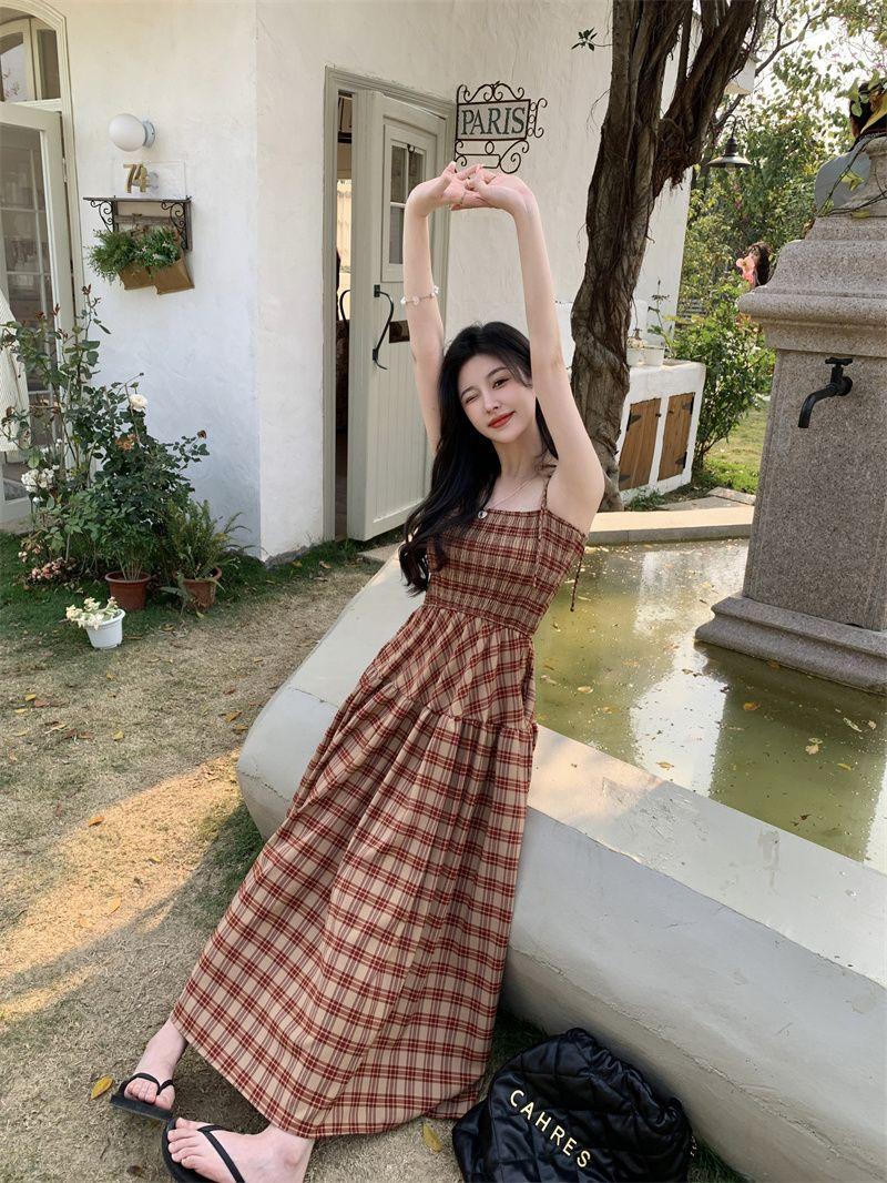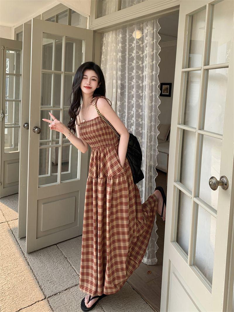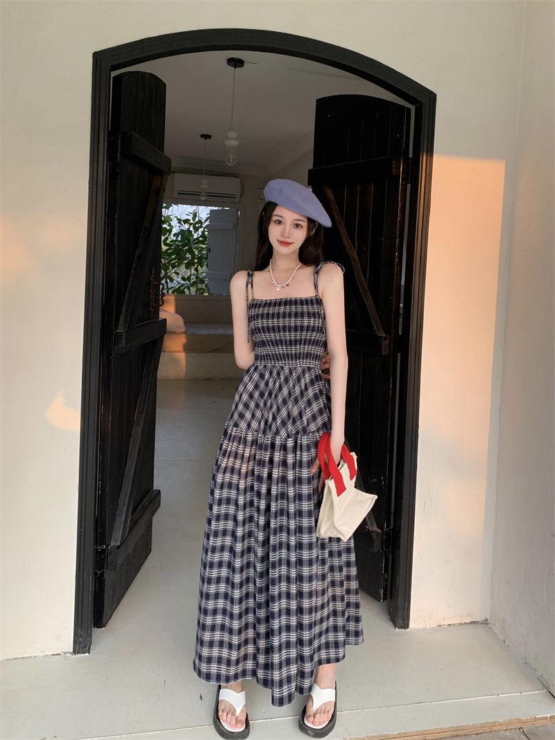 Saia estilo francês para chá, nova saia feminina de verão, cintura fina, xadrez, comprimento médio, doce e picante, elegante, vestido tipo sling