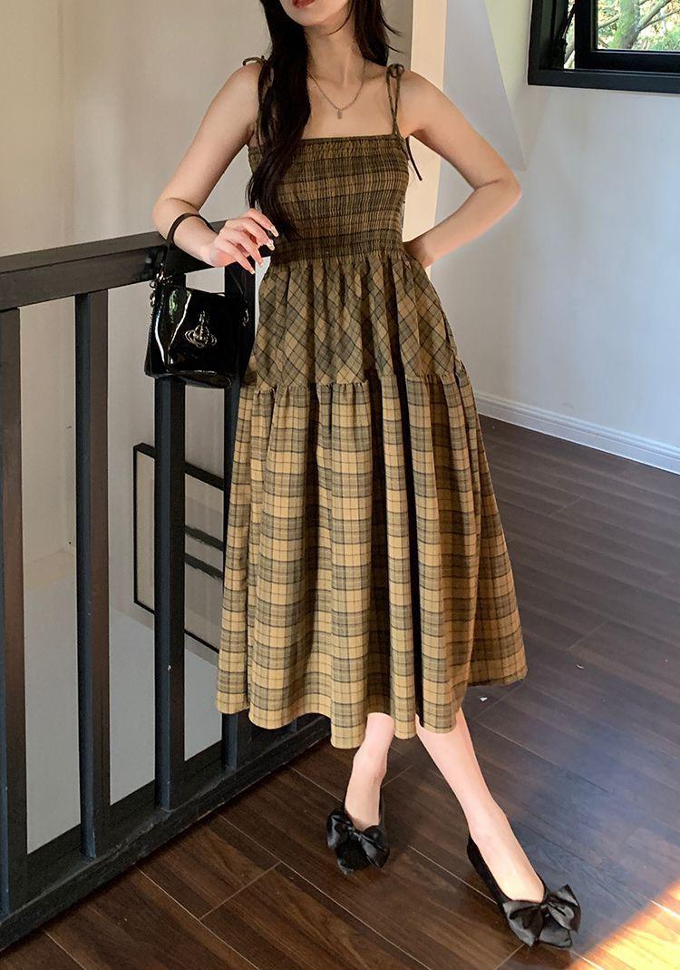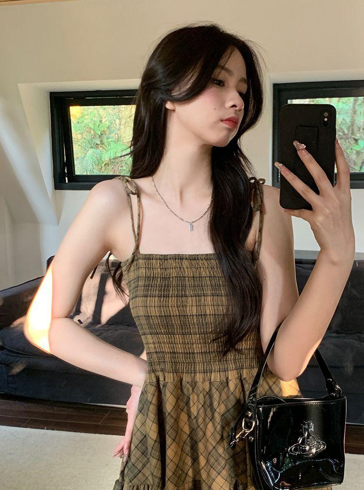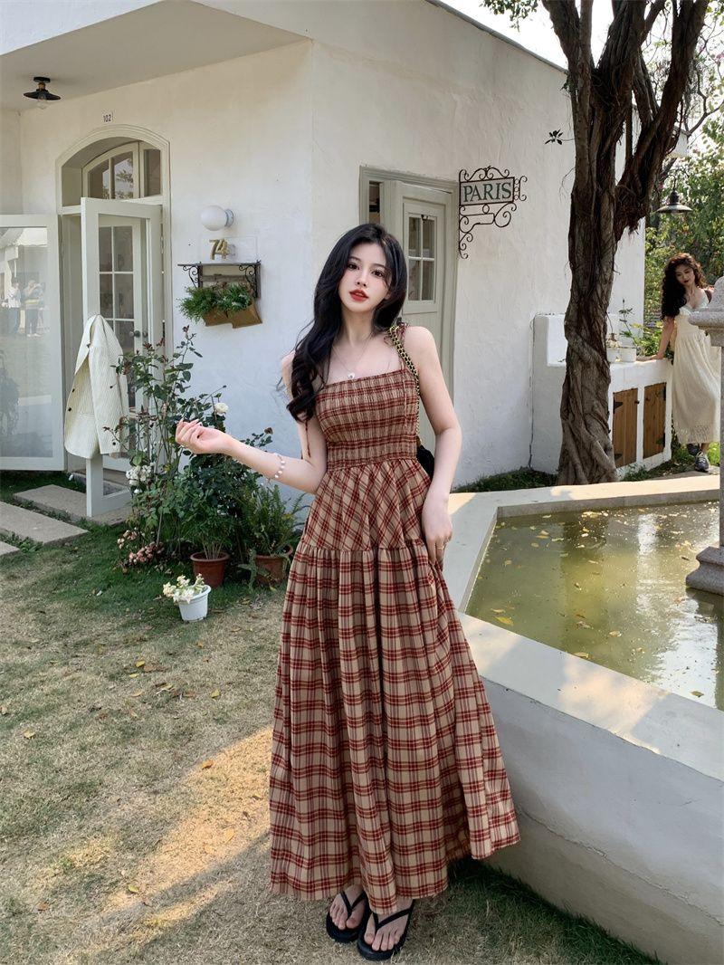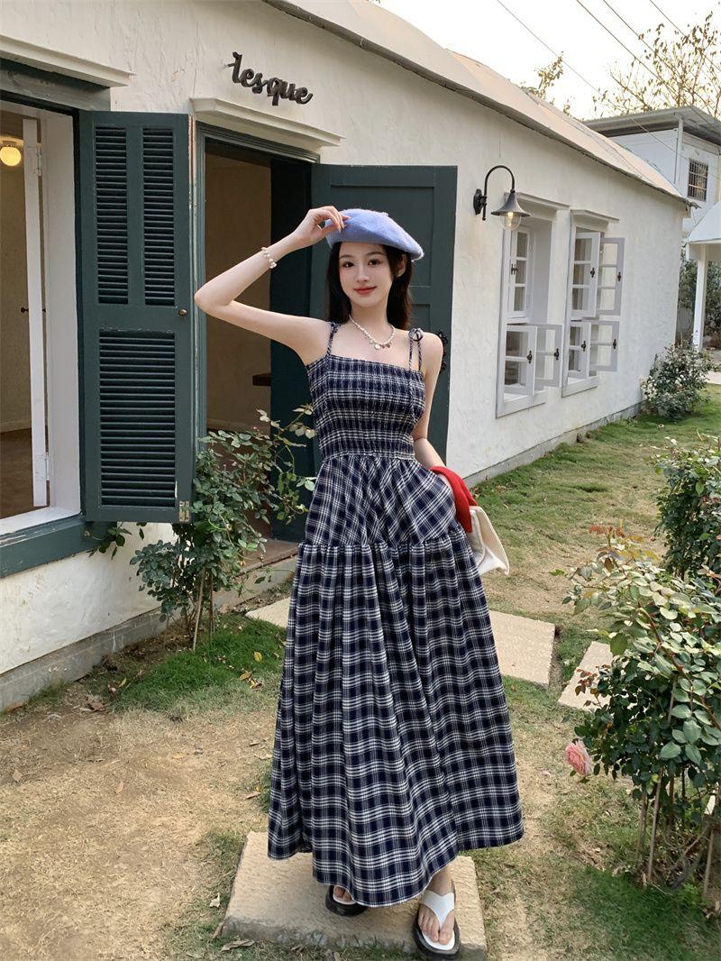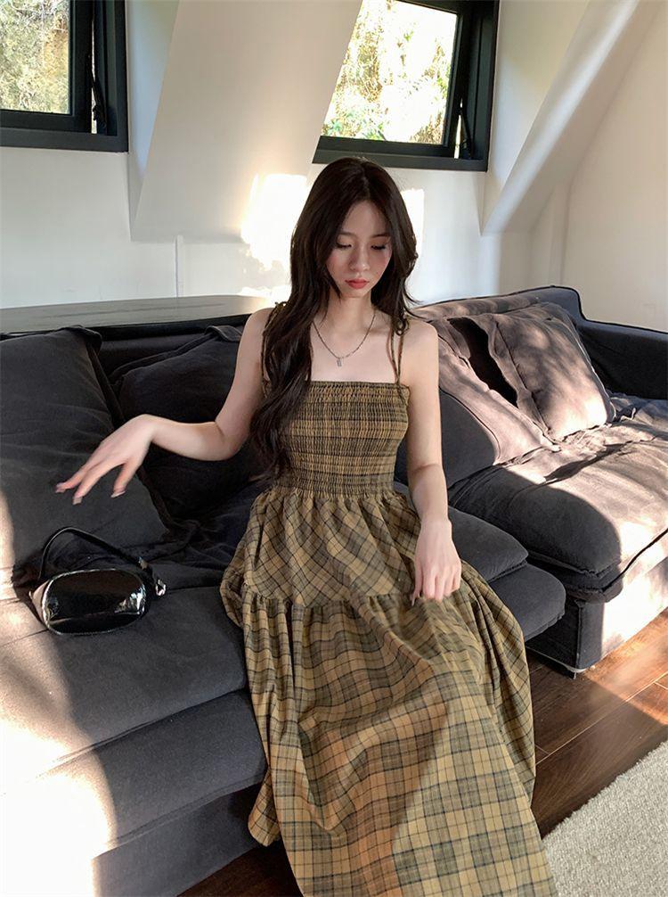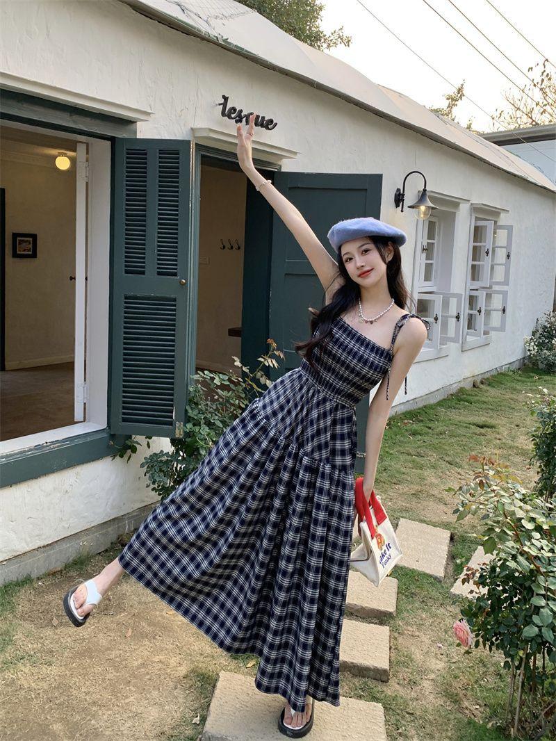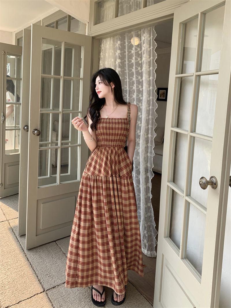 Saia estilo francês para chá, nova saia feminina de verão, cintura fina, xadrez, comprimento médio, doce e picante, elegante, vestido tipo sling