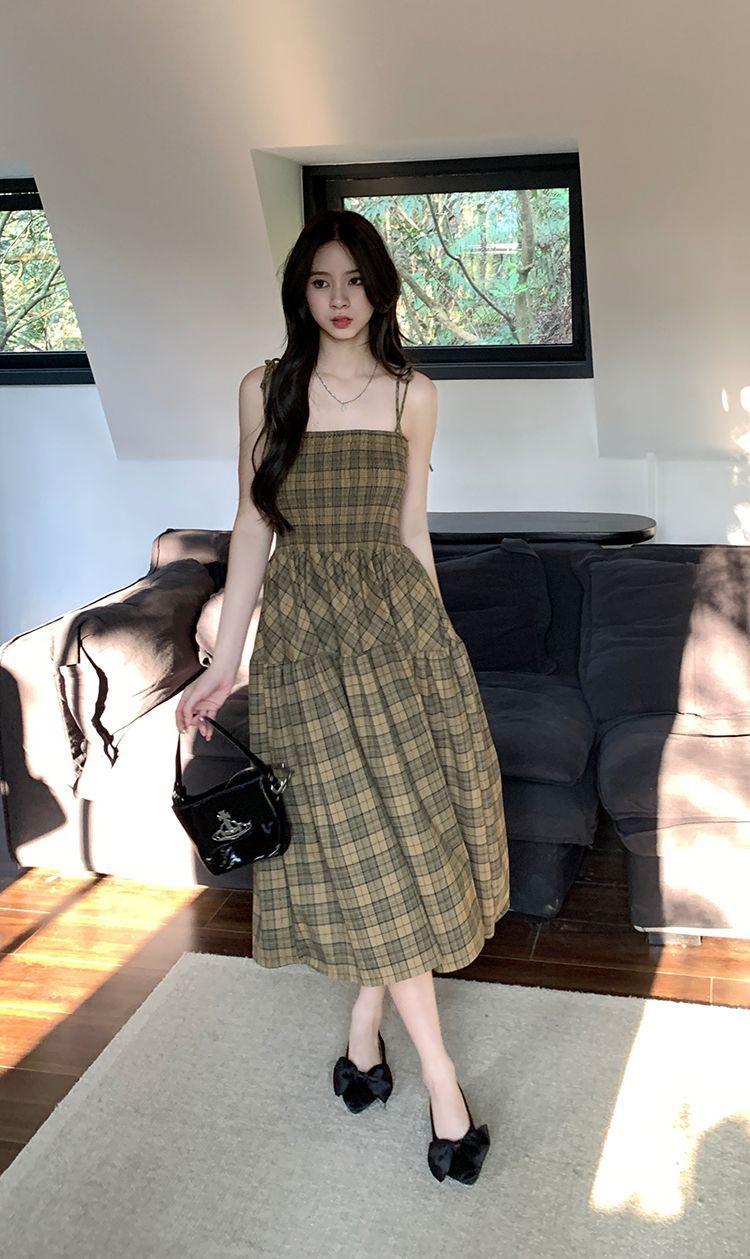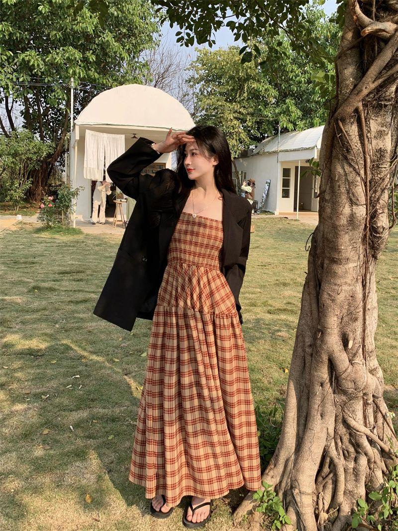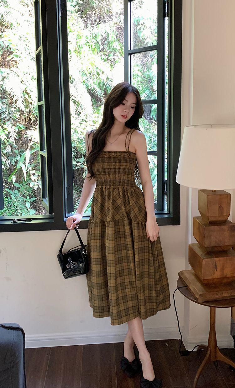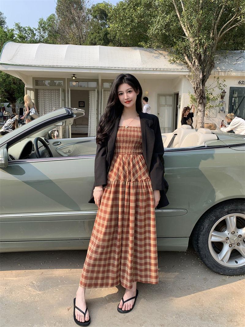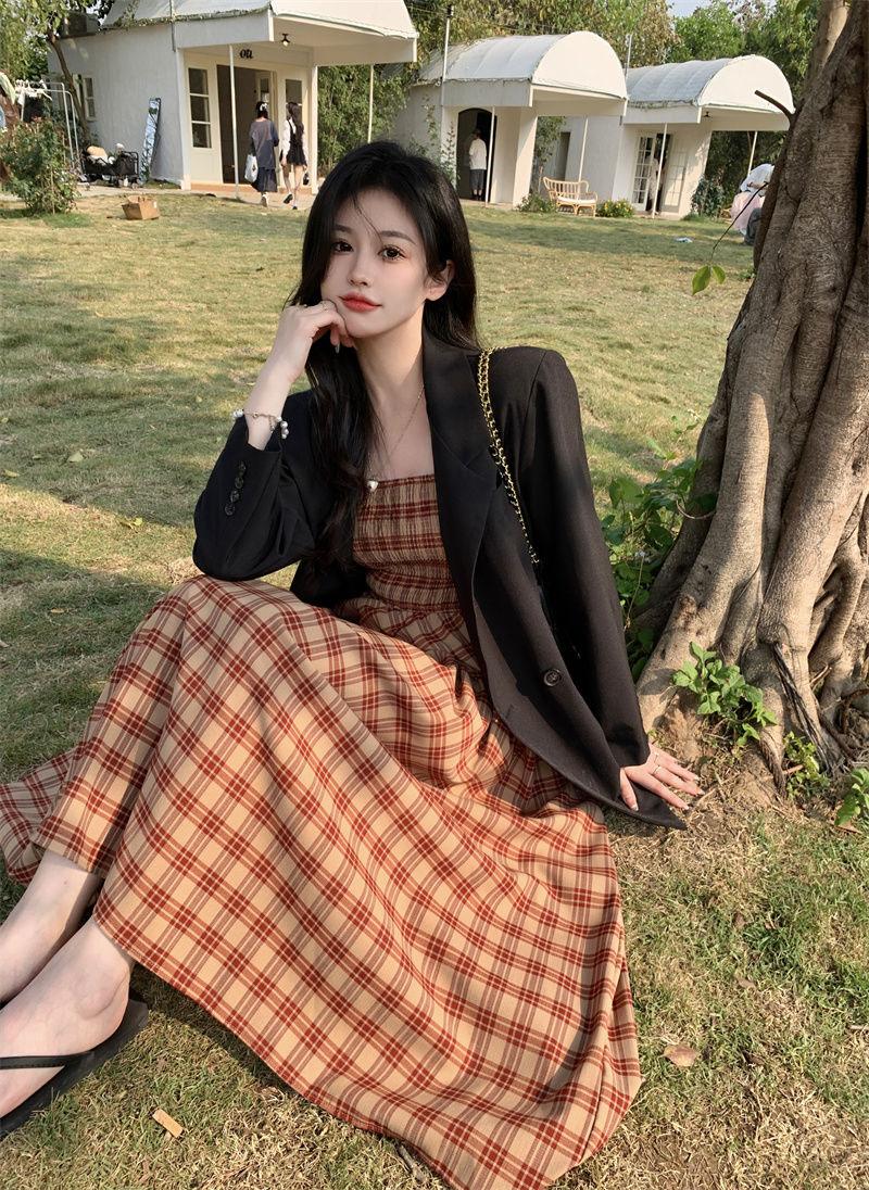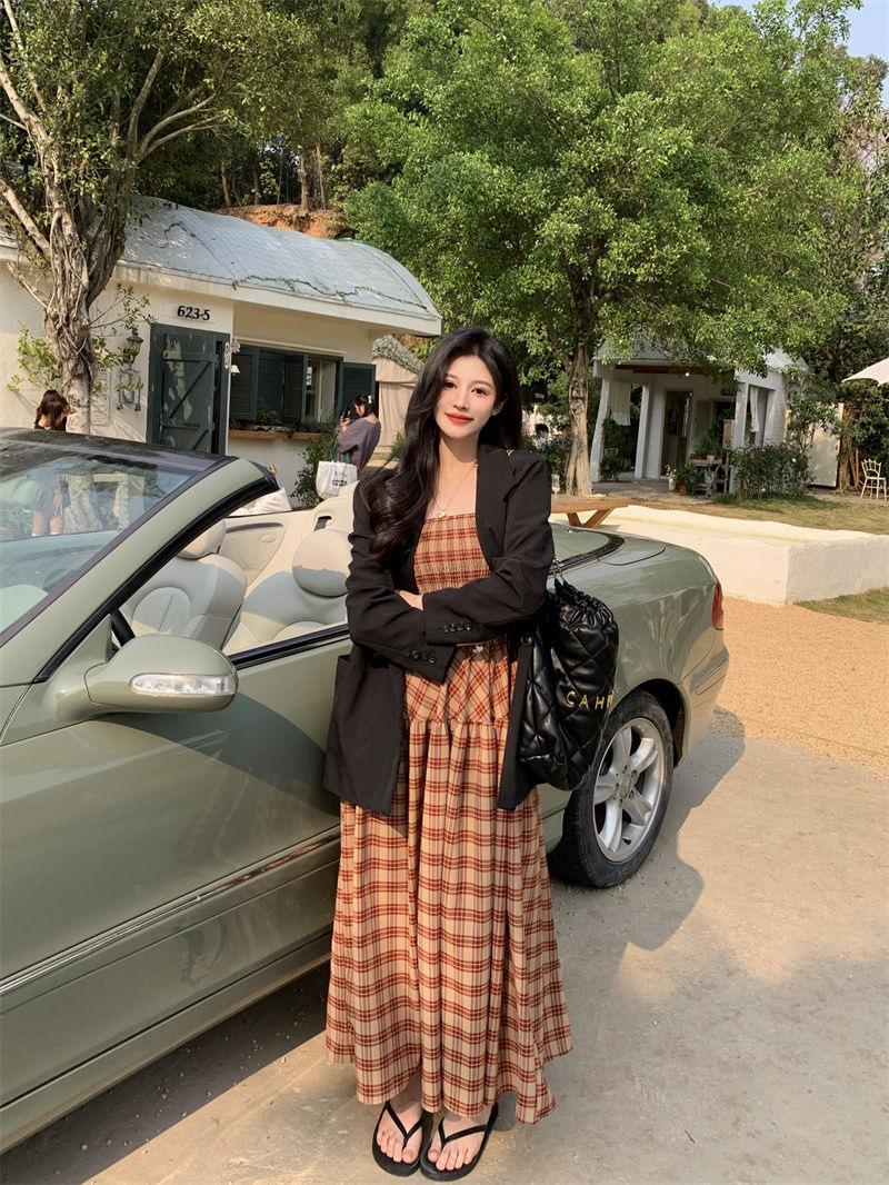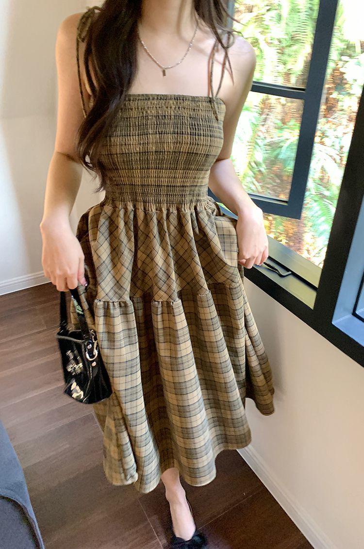 Saia estilo francês para chá, nova saia feminina de verão, cintura fina, xadrez, comprimento médio, doce e picante, elegante, vestido tipo sling