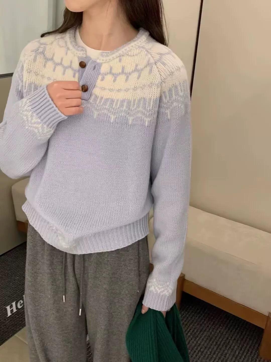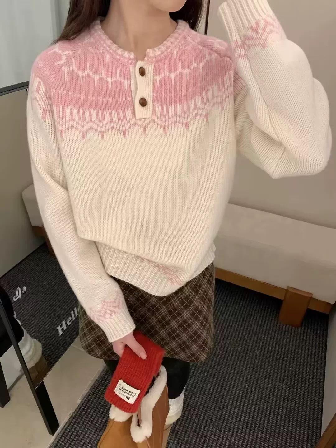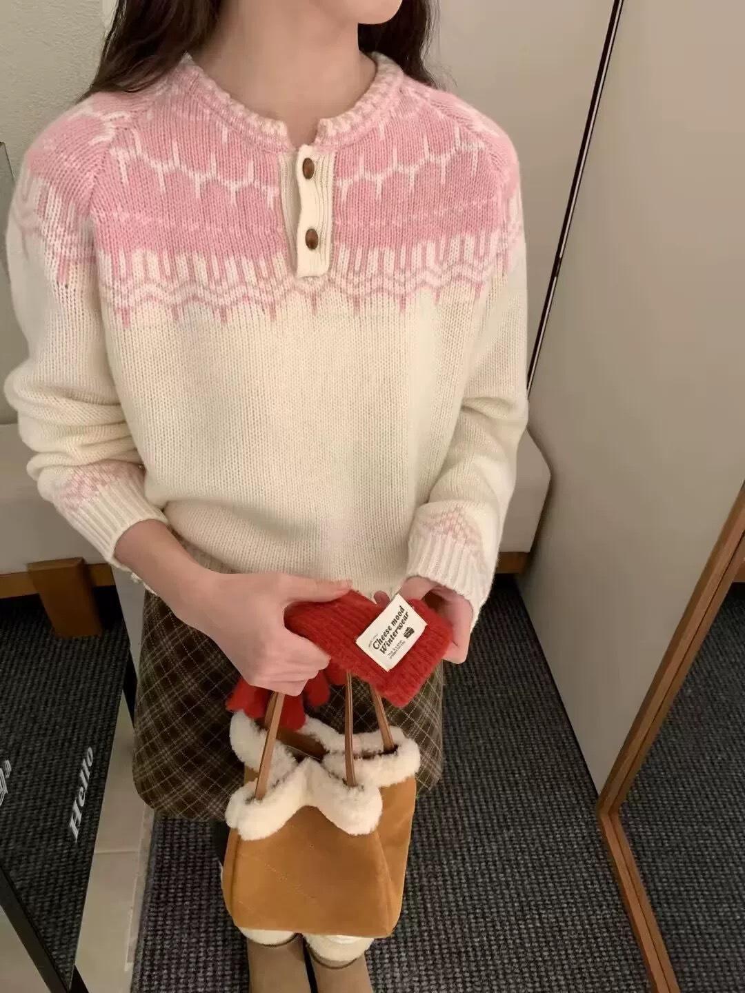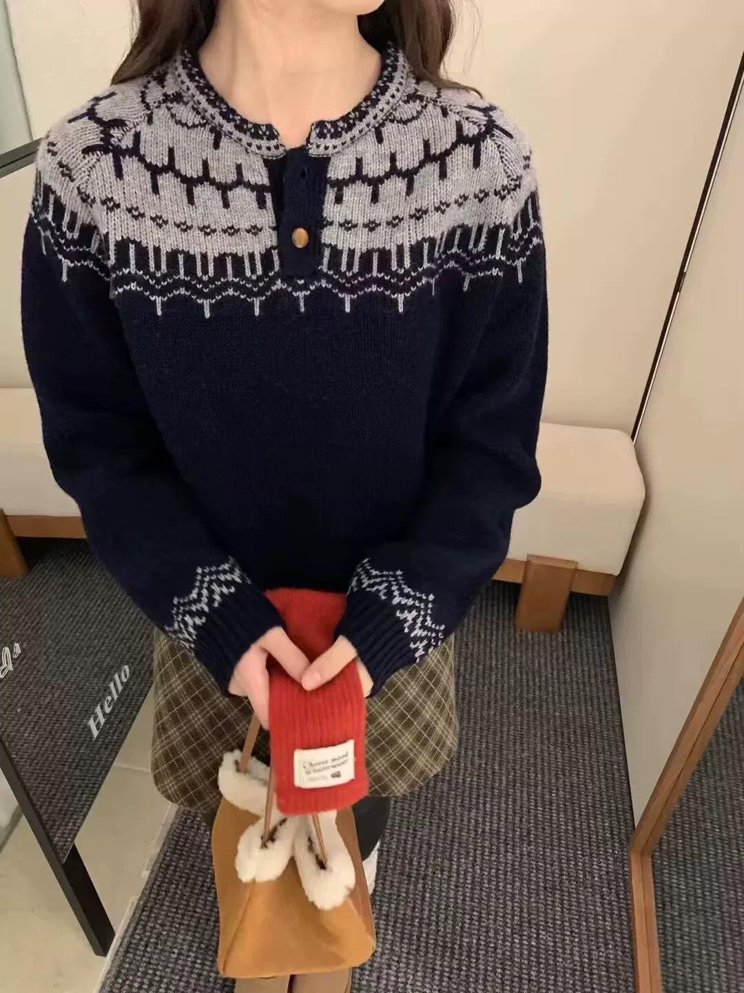 Suéter jacquard estilo coreano retrô com gola meio aberta, pulôver feminino, outono e inverno 2024, novo suéter para todos os gostos, top 898
