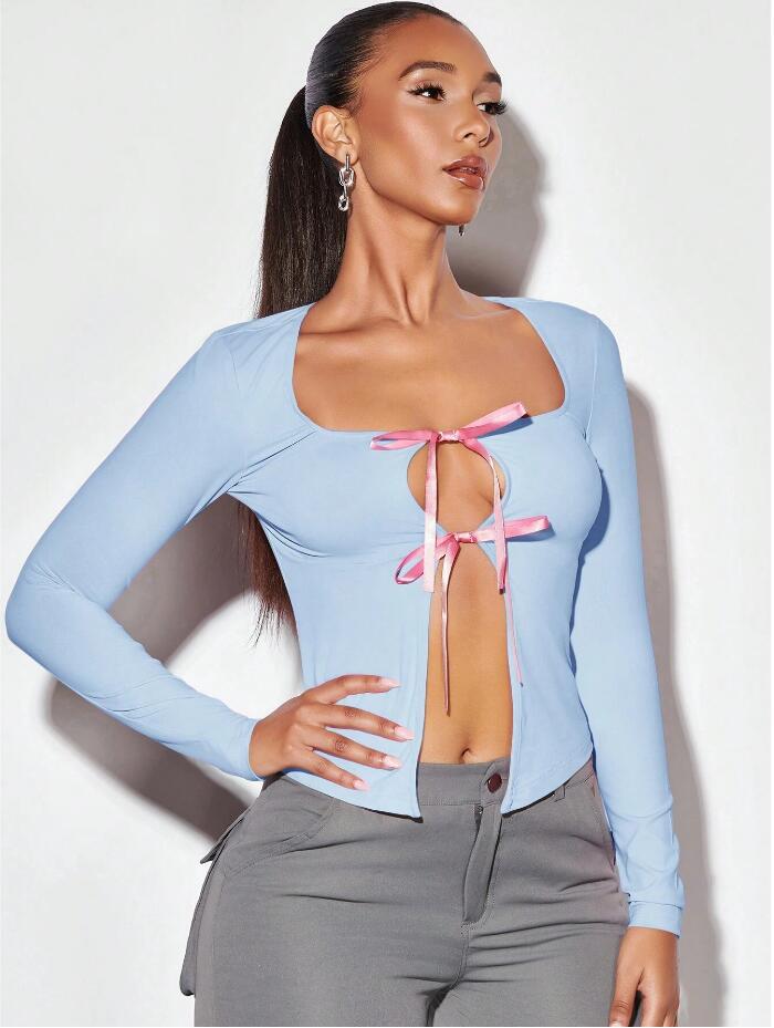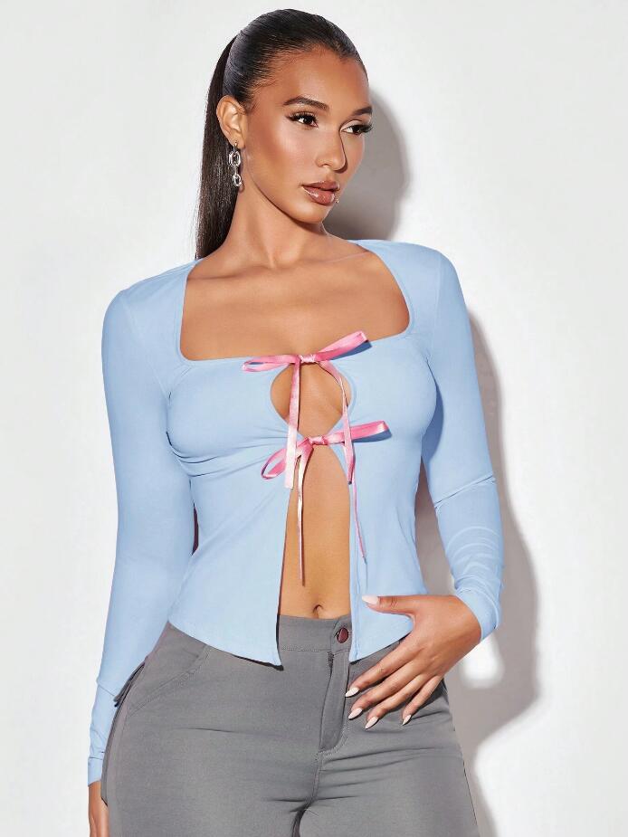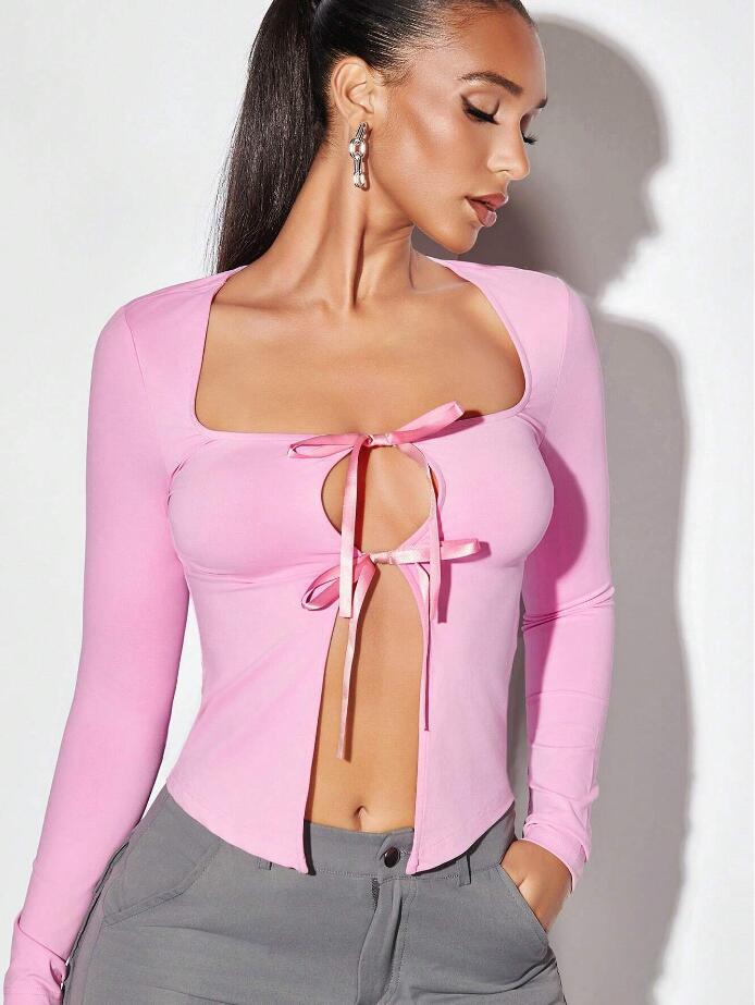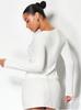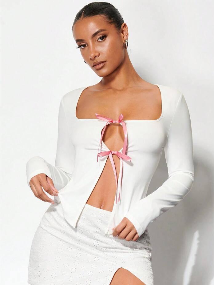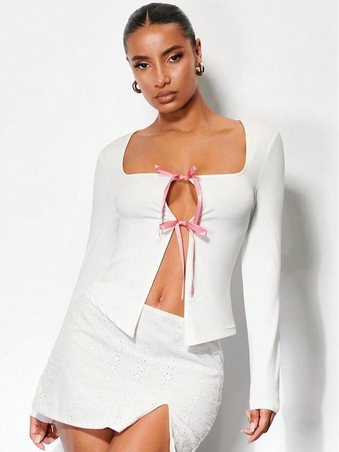 Garota gostosa, puro desejo, gola quadrada, renda, slim fit, curta, manga comprida, design, camisa de malha emagrecedora, parte inferior, top
