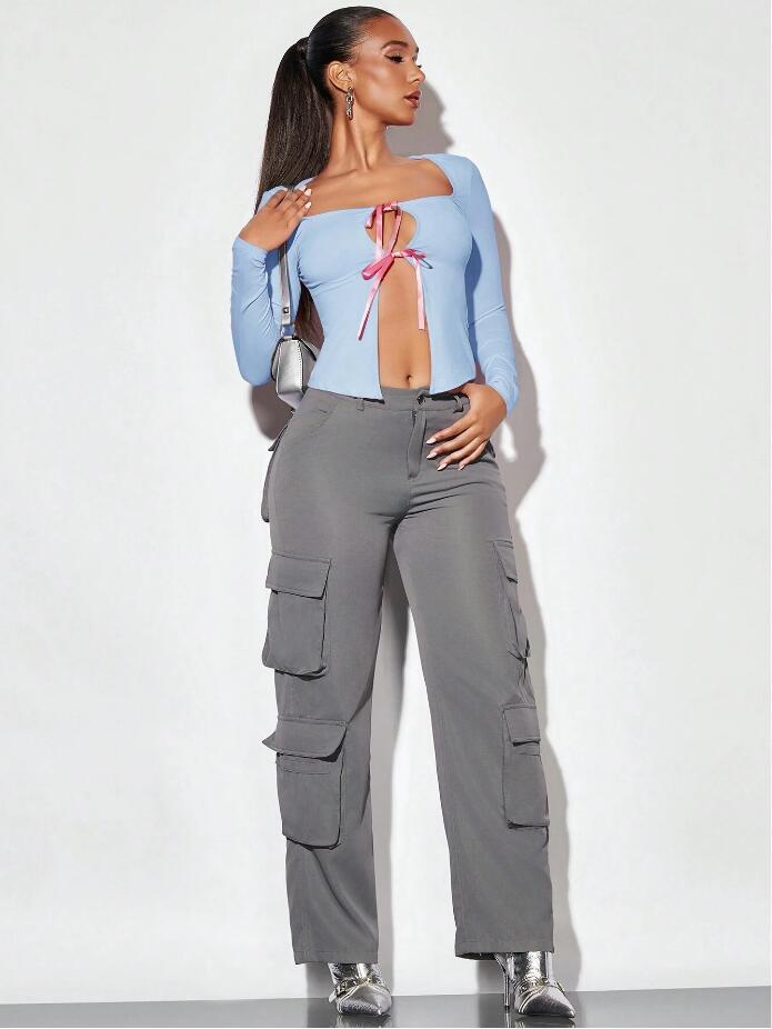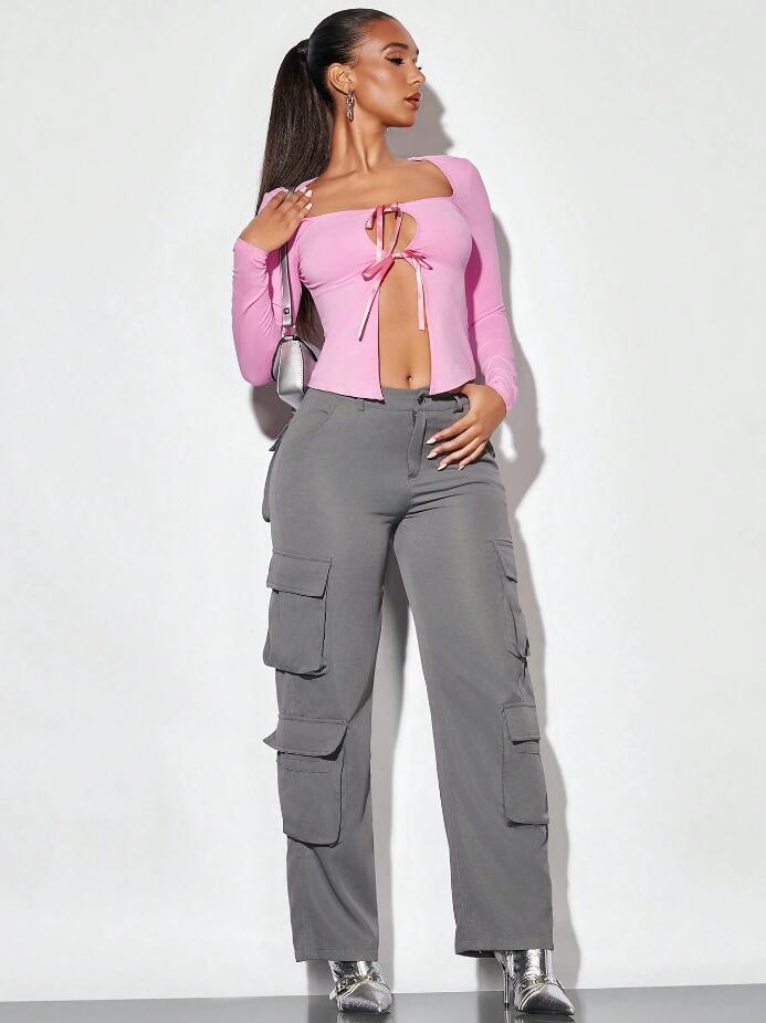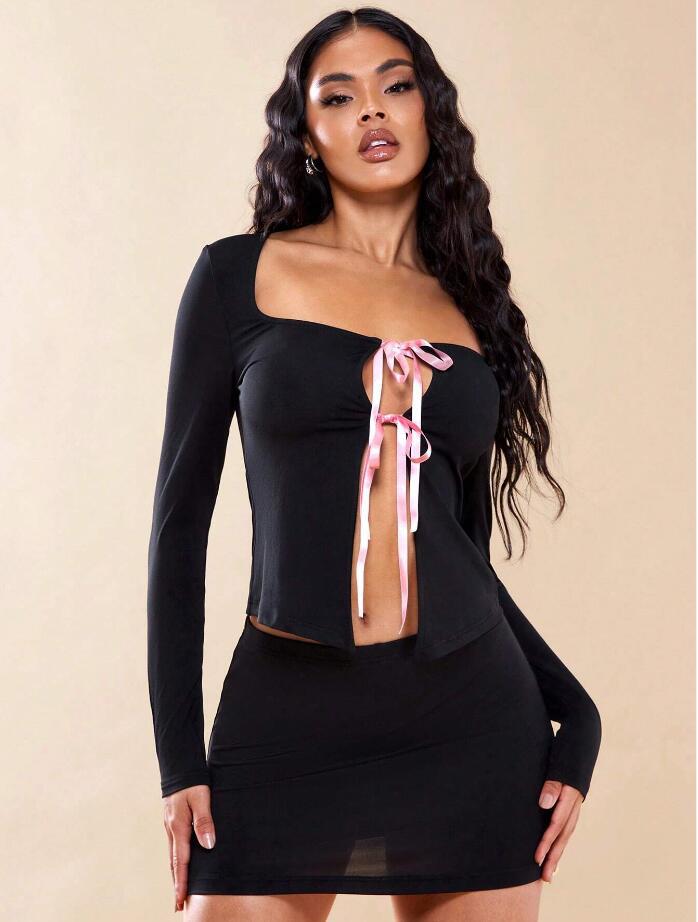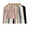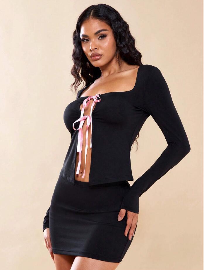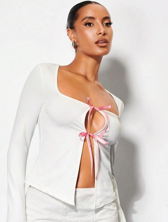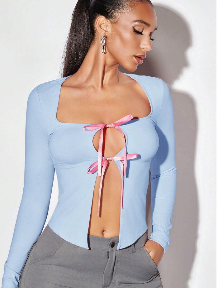 Garota gostosa, puro desejo, gola quadrada, renda, slim fit, curta, manga comprida, design, camisa de malha emagrecedora, parte inferior, top