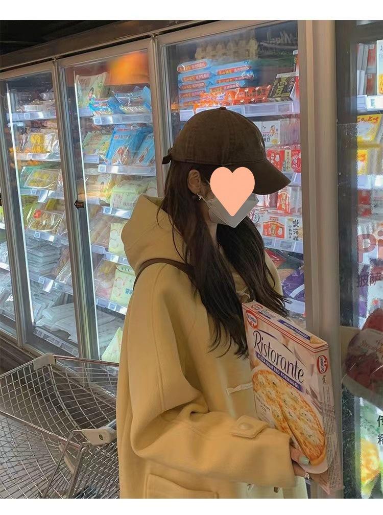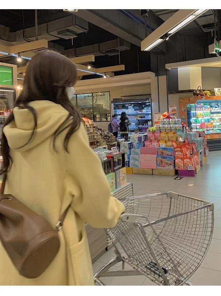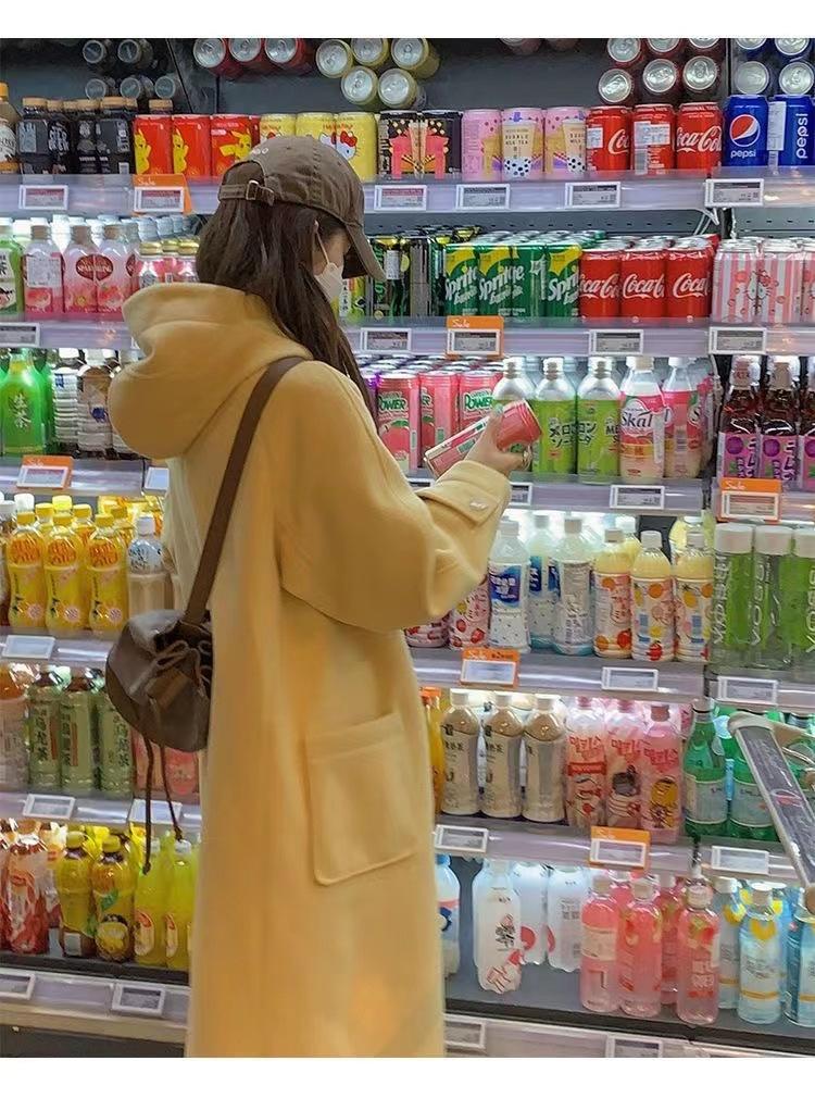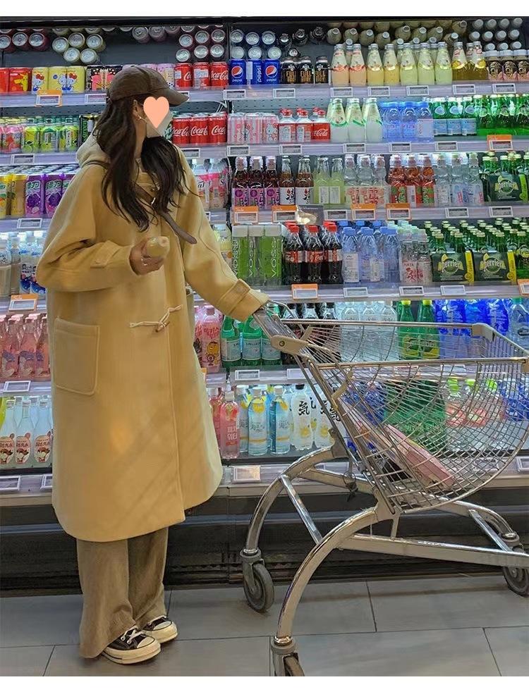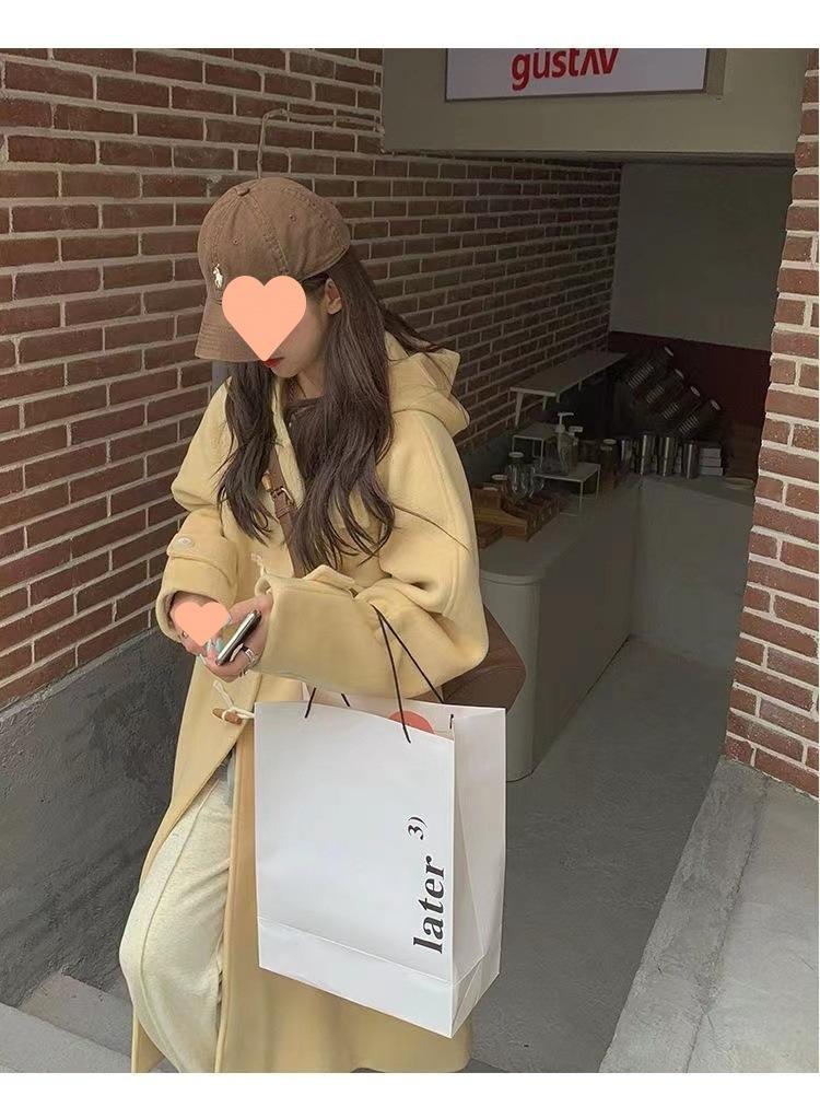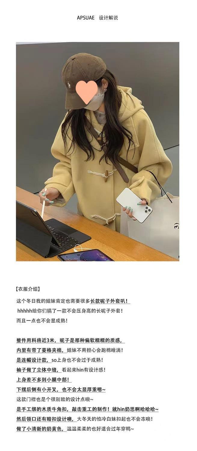 2025 Novo Outono e Inverno Casaco de Lã Feminino Estilo Médio Tendência Casaco de Lã com Capuz e Botão de Chifre