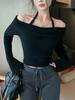 Suéter de malha Pure Wish Neck Feminino Outono 2024 Camisa de base de manga comprida com ombros de fora Spice Girls Ombro Curto Sweet and Hot Top