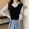 Falso duas peças costura polo colarinho manga comprida malha suéter feminino início do outono cintura estilo francês topo de alta qualidade