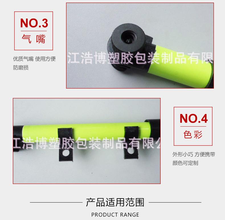 Características: velocidade de inflação rápida, pressão de ar estável, alta pressão de ar, operação confortável, em conformidade com os padrões de proteção ambiental da UE, LOGOTIPO personalizável