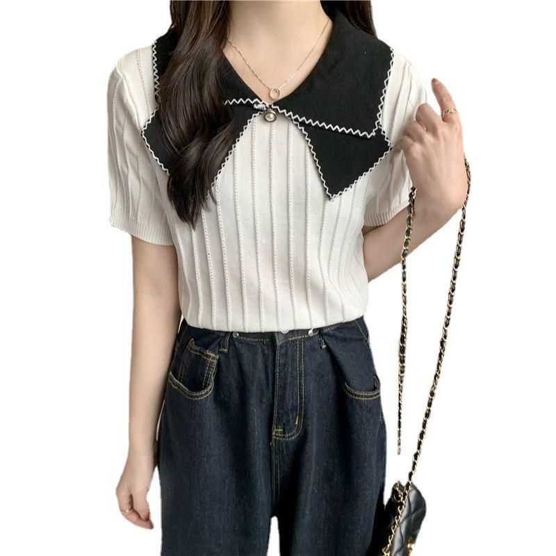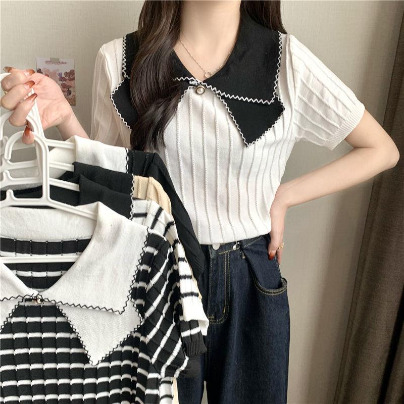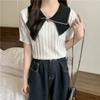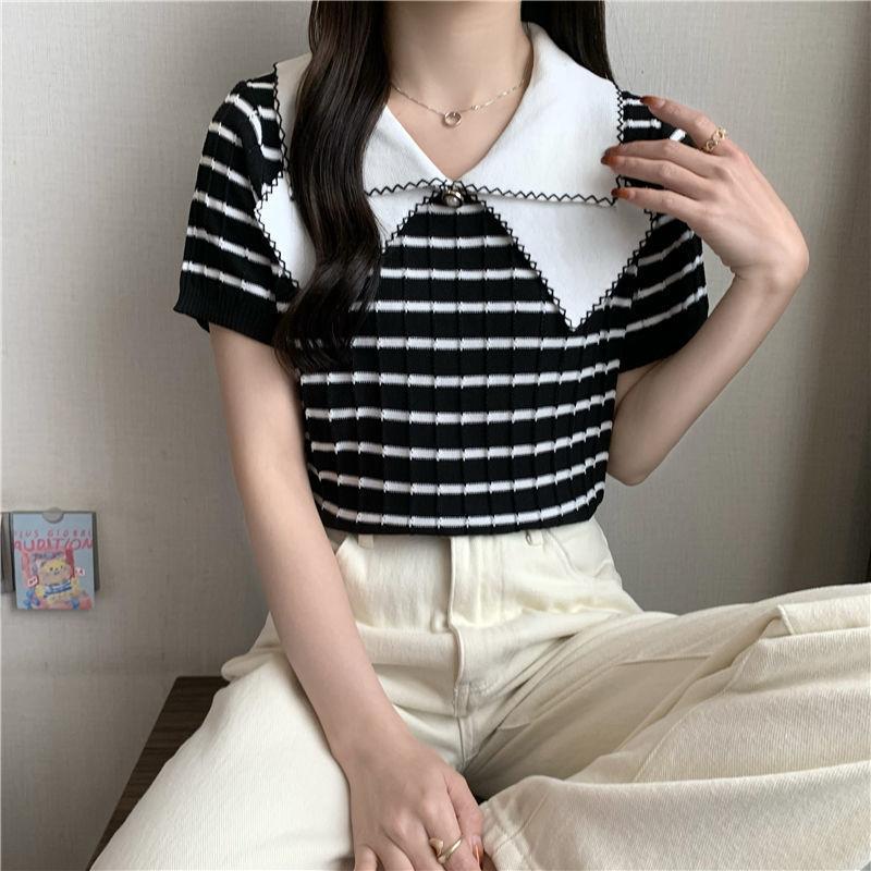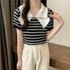 Camiseta Tricotada Listrada Manga Curta Feminina Verão 2025 Nova Redutora de Idade Doce Design de Camisa de Estilo Ocidental Nicho Top