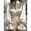 2026 Nova Marca Independente da Amazon Elegante Camisa de Cetim de Manga Longa com Manga Bufante Lisa para Mulheres