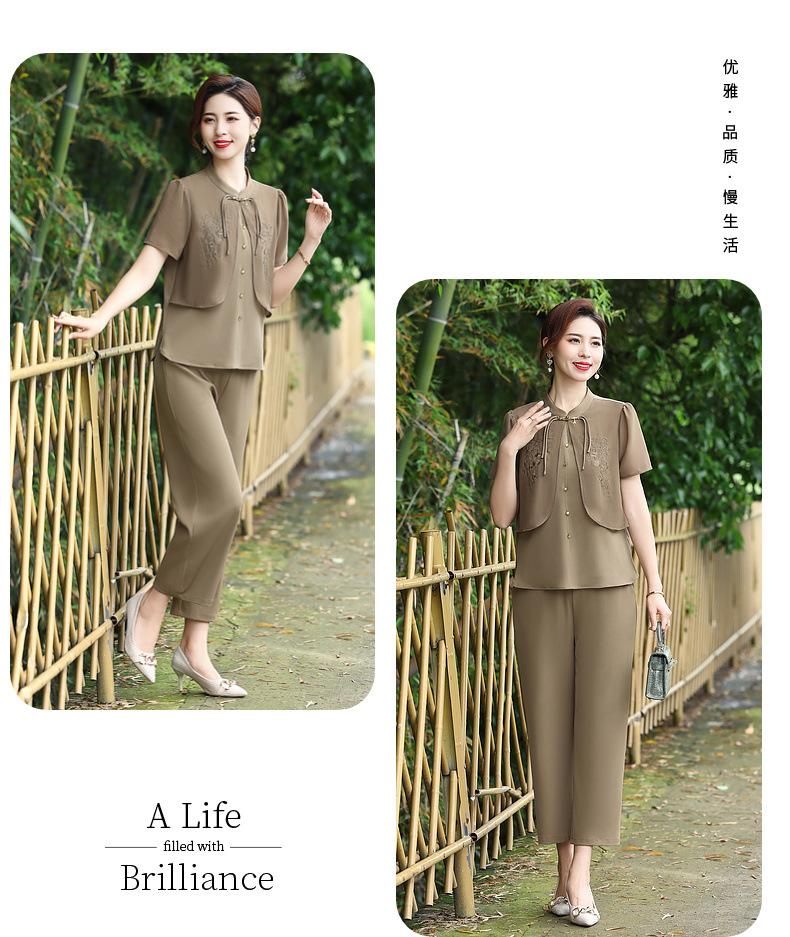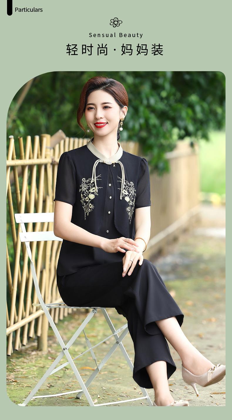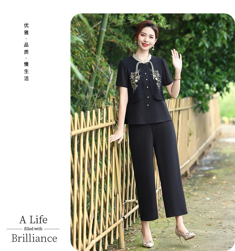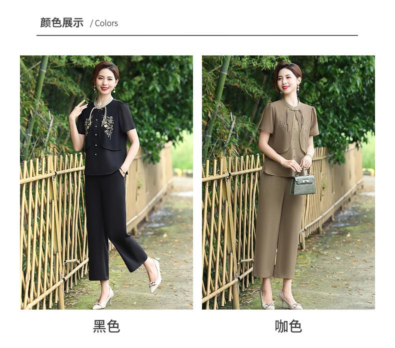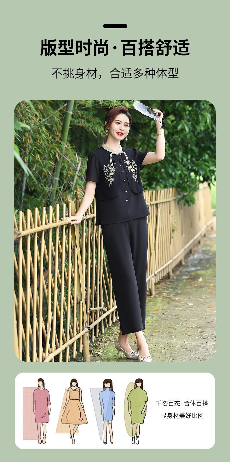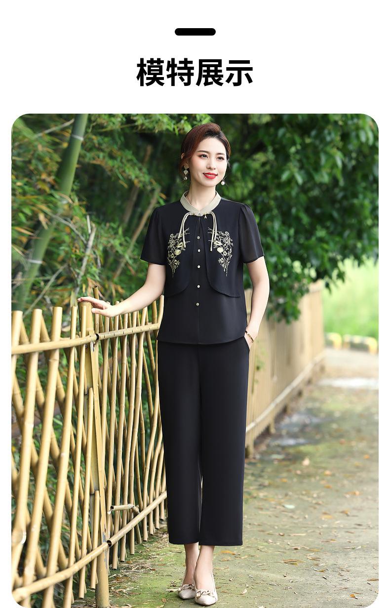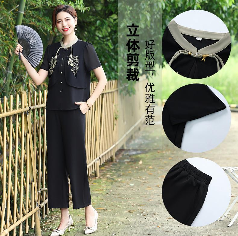 2024 Novo Vestido de Verão para Mães de Meia-Idade Estilo Nacional Terno de Chiffon Manga de Três Pontos Top para Mulheres de Meia-Idade e Idosas Elegante Conjunto de Duas Peças