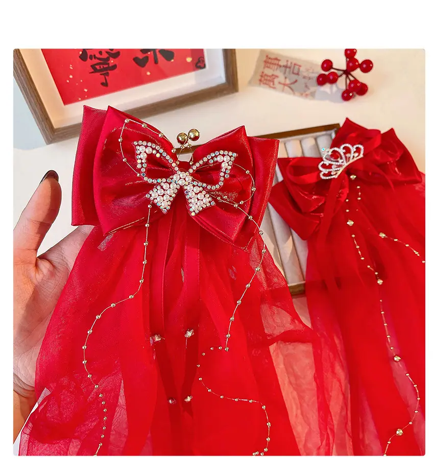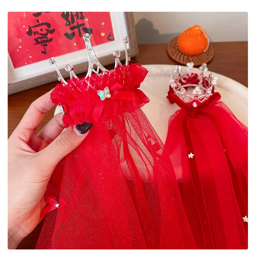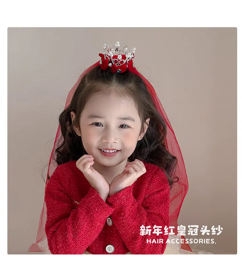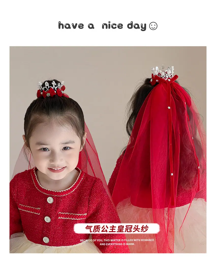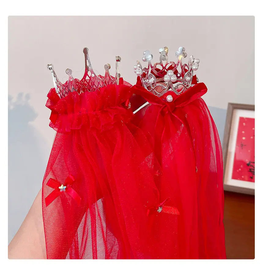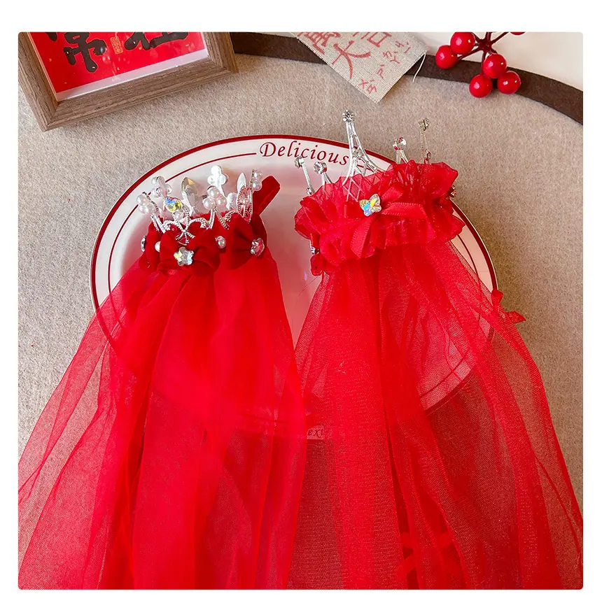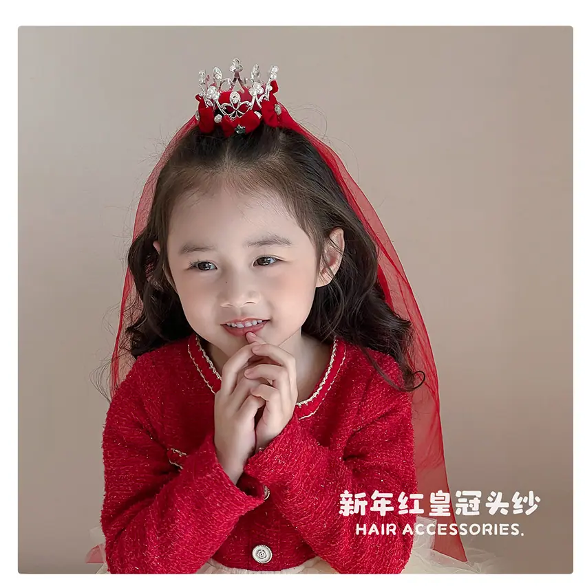 Meninas Red Pearl Crown Bow Veil Ano Novo Infantil Fada Cabelo Acessórios Elegante Doce Vestido Headwear Lote