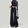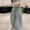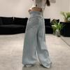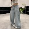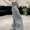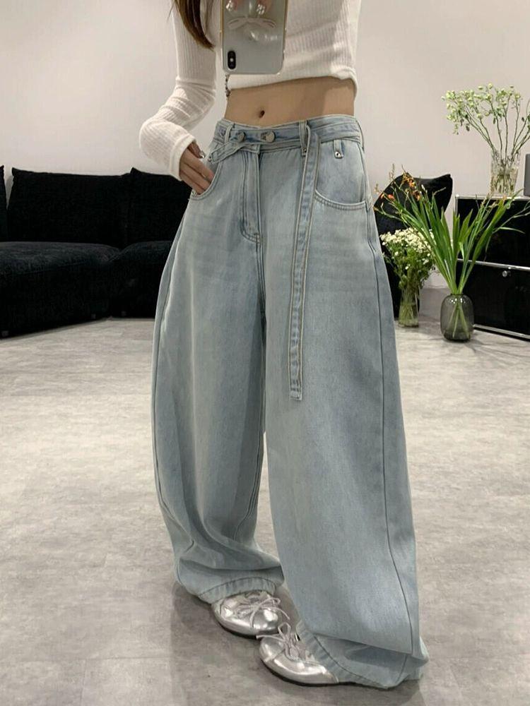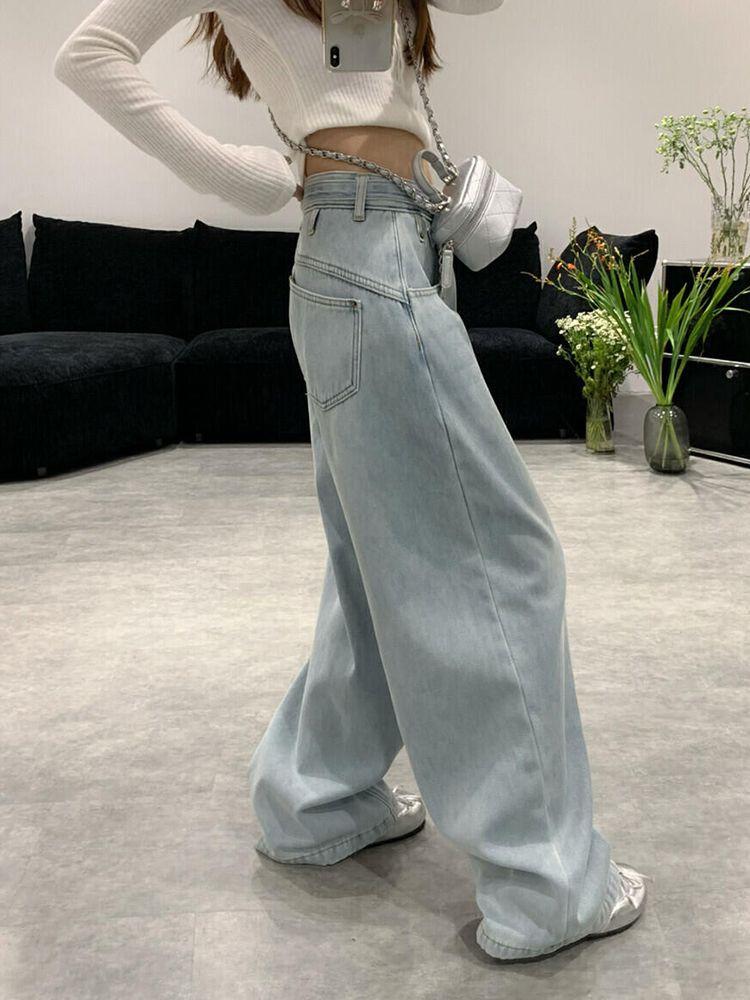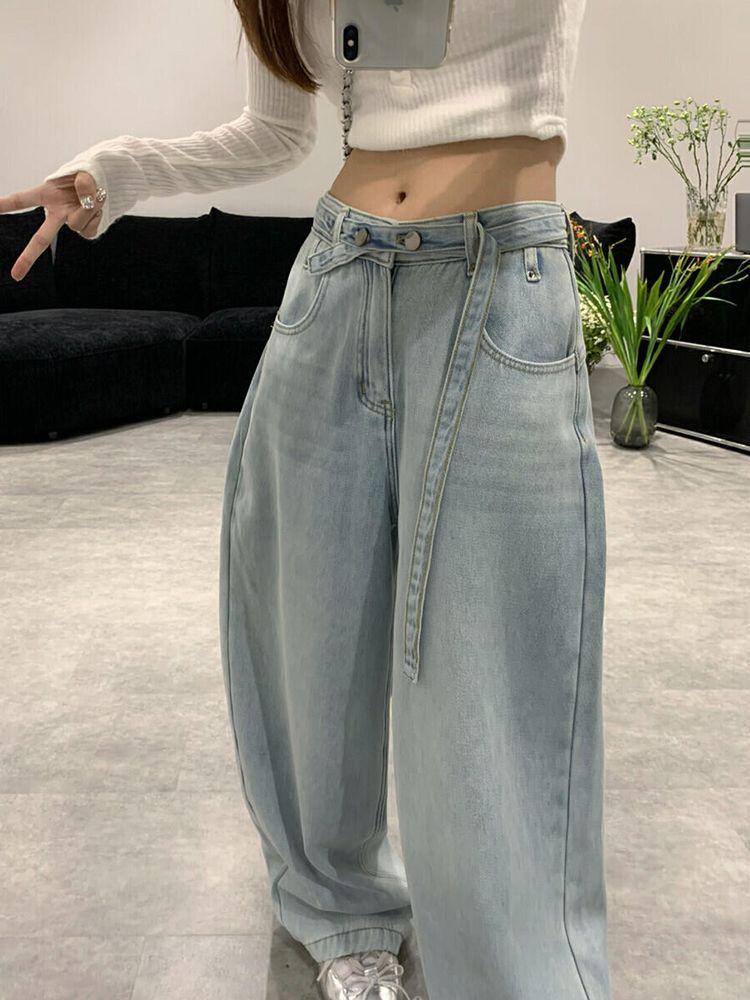Calça Jeans Reta Cintura Alta com Cinto Feminino Outono e Inverno Nova Chegada Cinto Solto Slimming Perna Larga Calça Jeans Chão