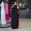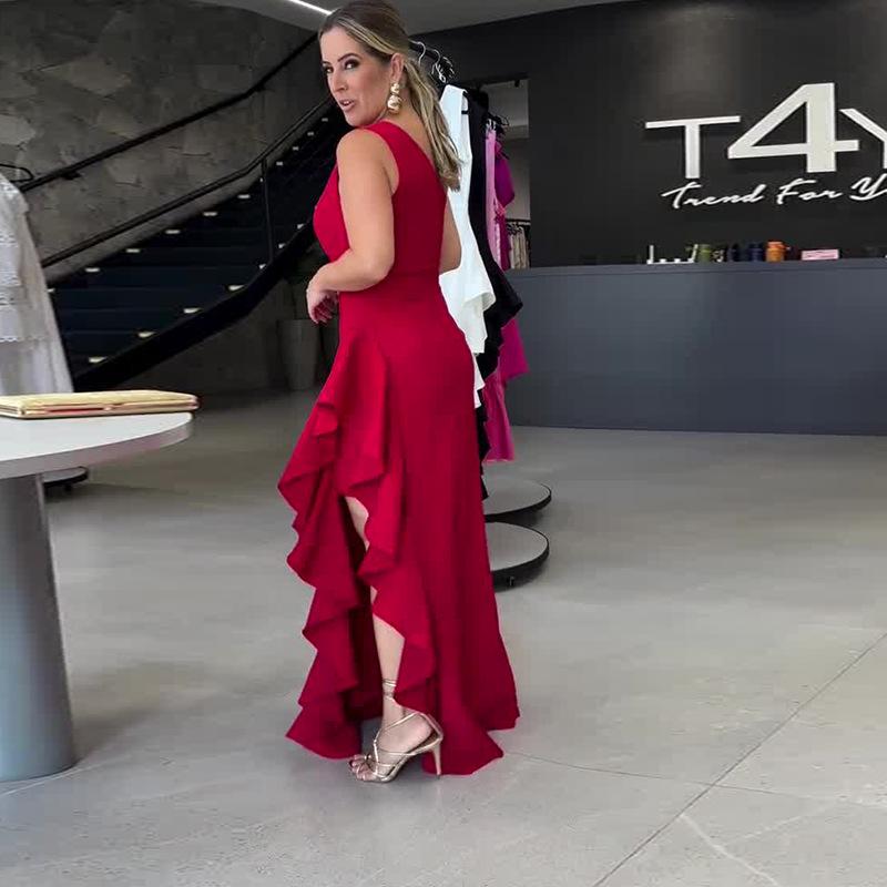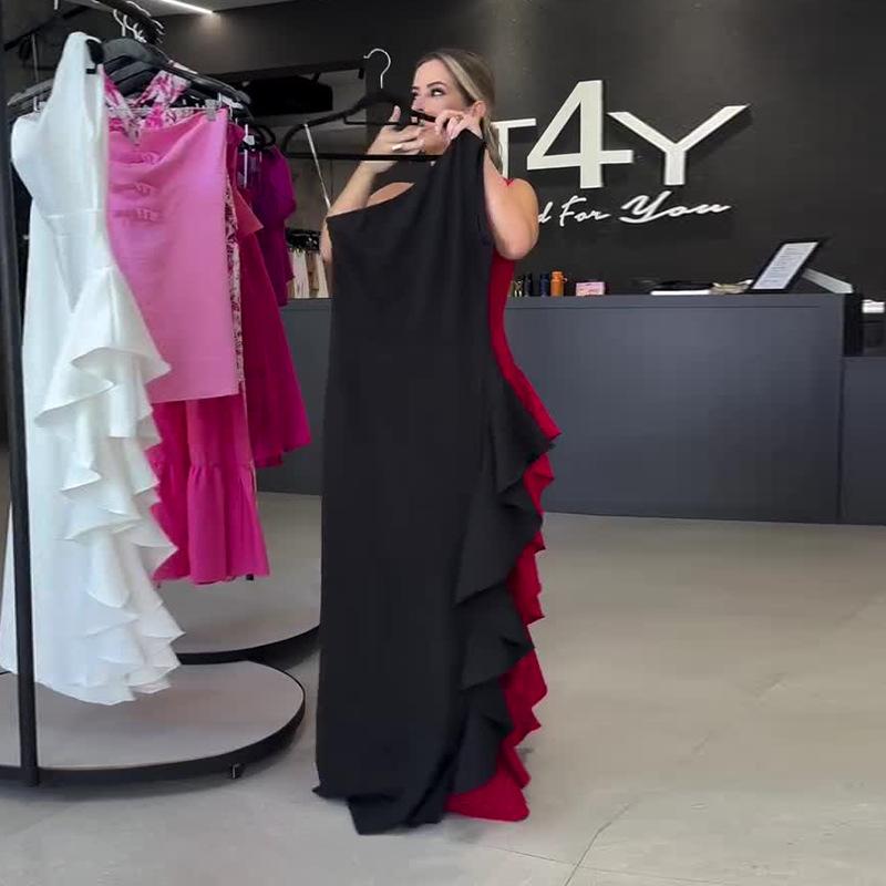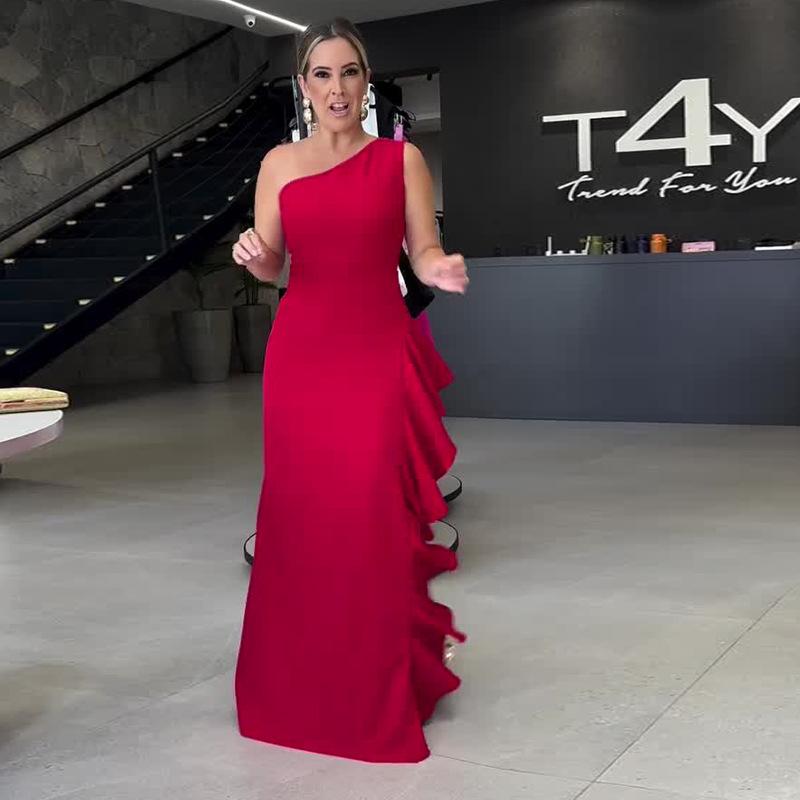 2025 Verão Novo Europeu e Americano Amazon Cross-border Moda Feminina Cor Sólida Gola Oblíqua Cintura Sem Mangas Vestido Dividido
