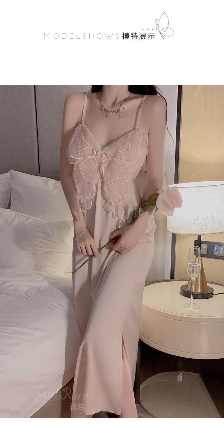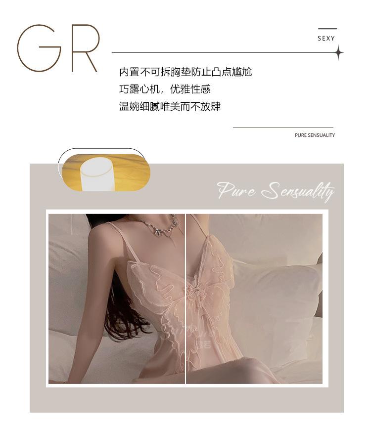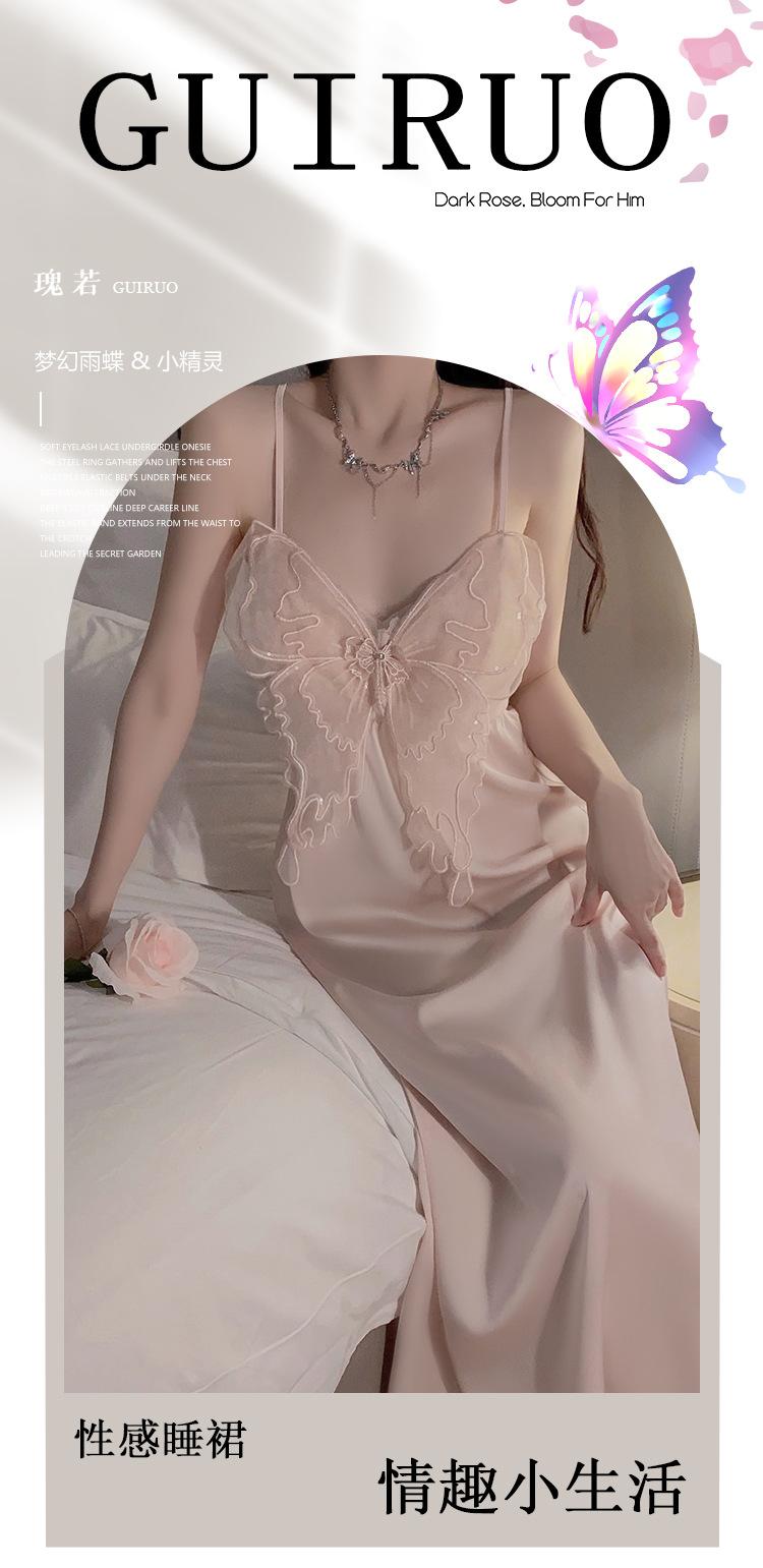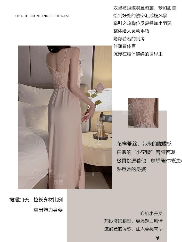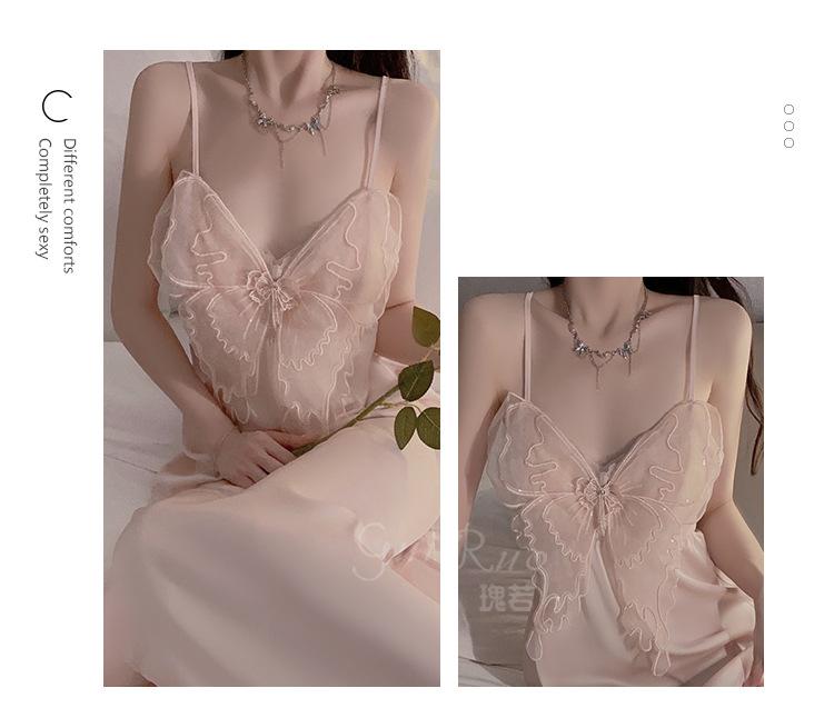 Rosa se cetim renda mais peito almofada sexy pequena fenda flor borboleta longa roupa interior casa vestido camisola P3963
