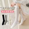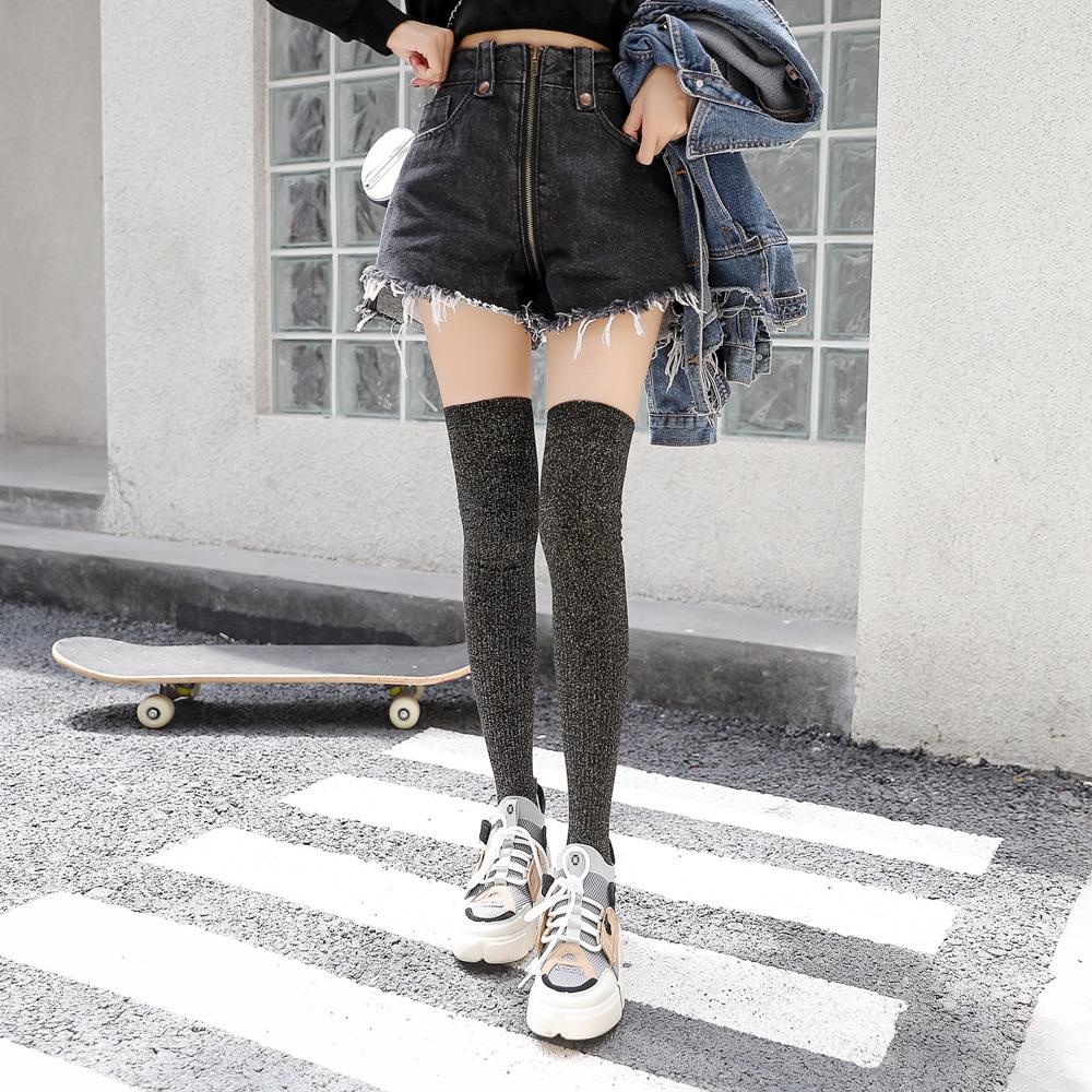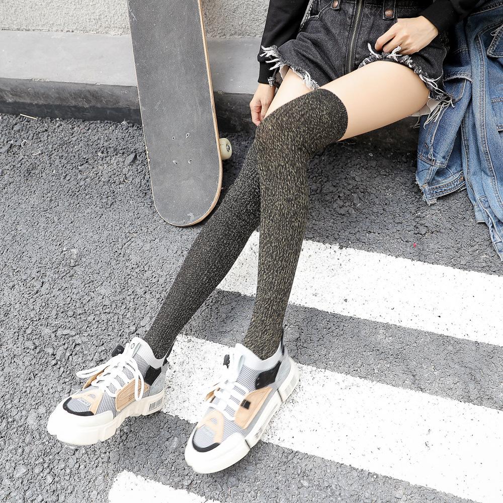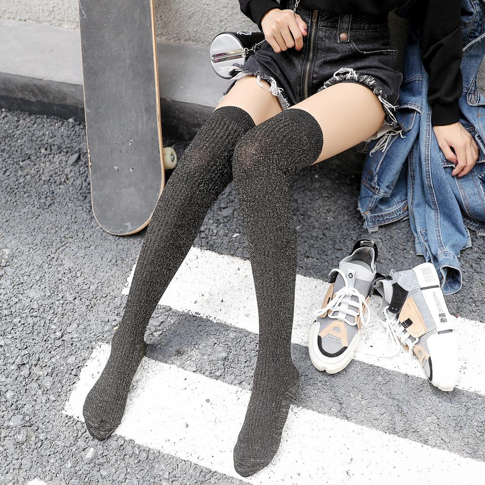 3032 Novas meias femininas de seda prateada de cor sólida, estilo universitário japonês, acima do joelho, meias antiderrapantes com estrelas do mesmo estilo