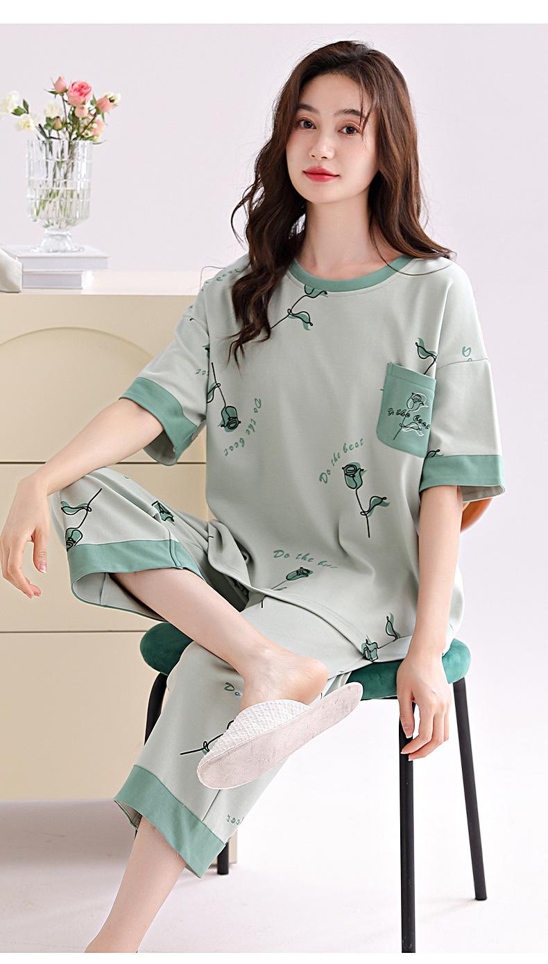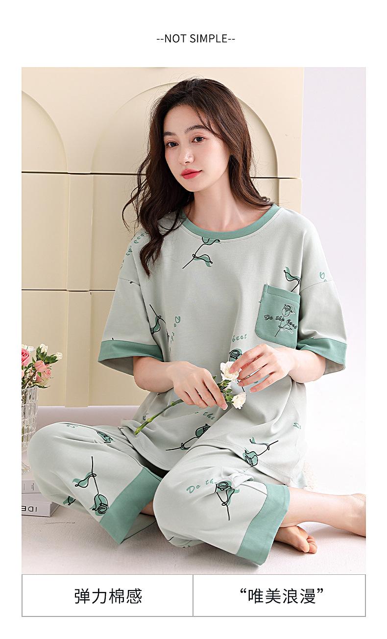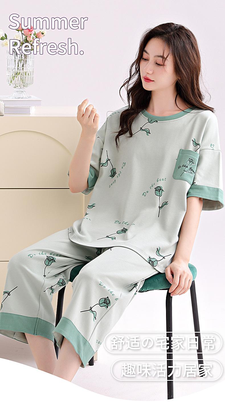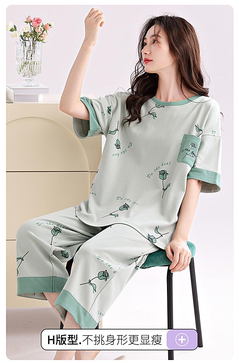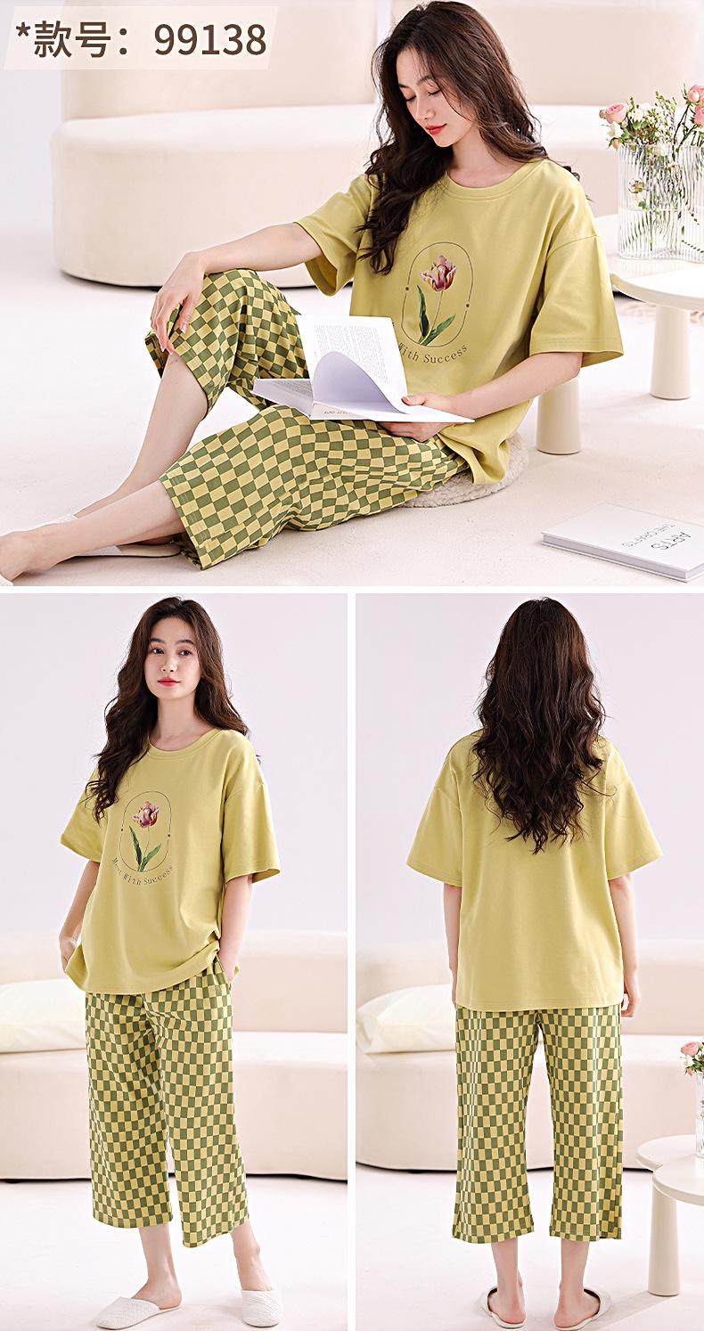2025 Verão Algodão Pijamas Femininos Verão Exterior Vestindo Novo Algodão Manga Curta plus size Roupas de Casa Terno de Gola Redonda
