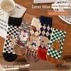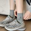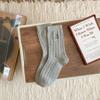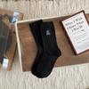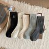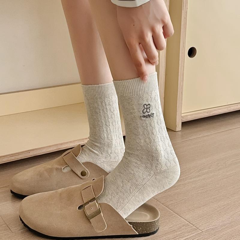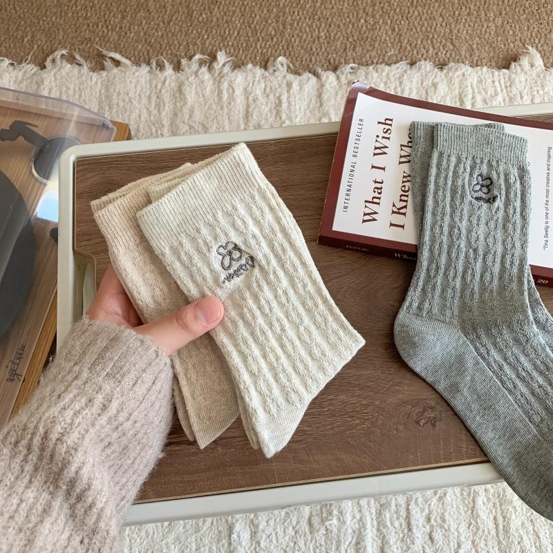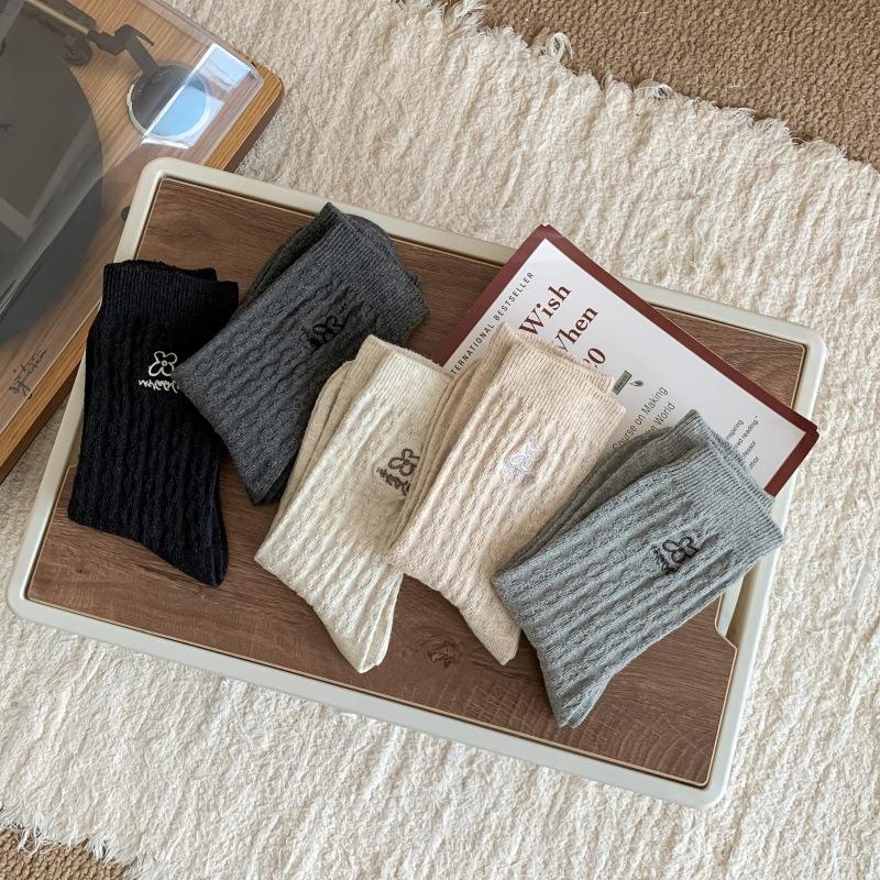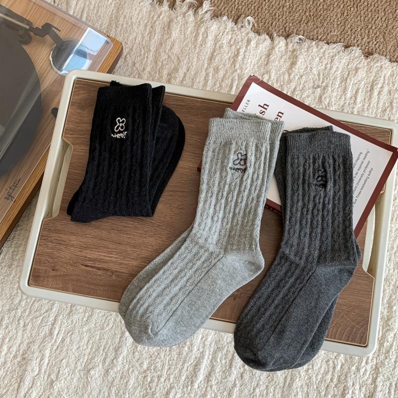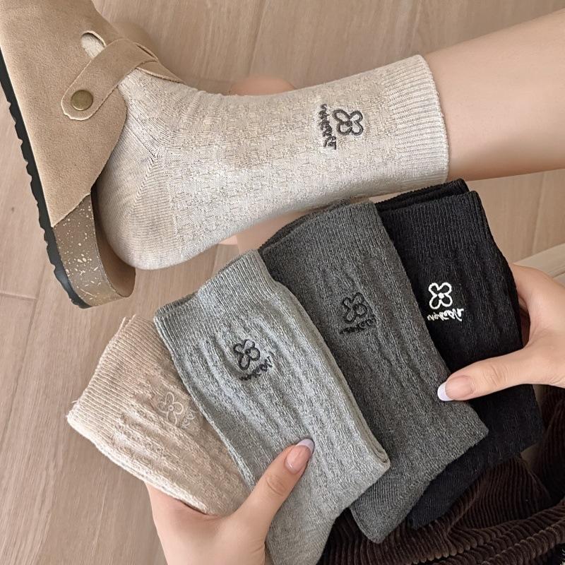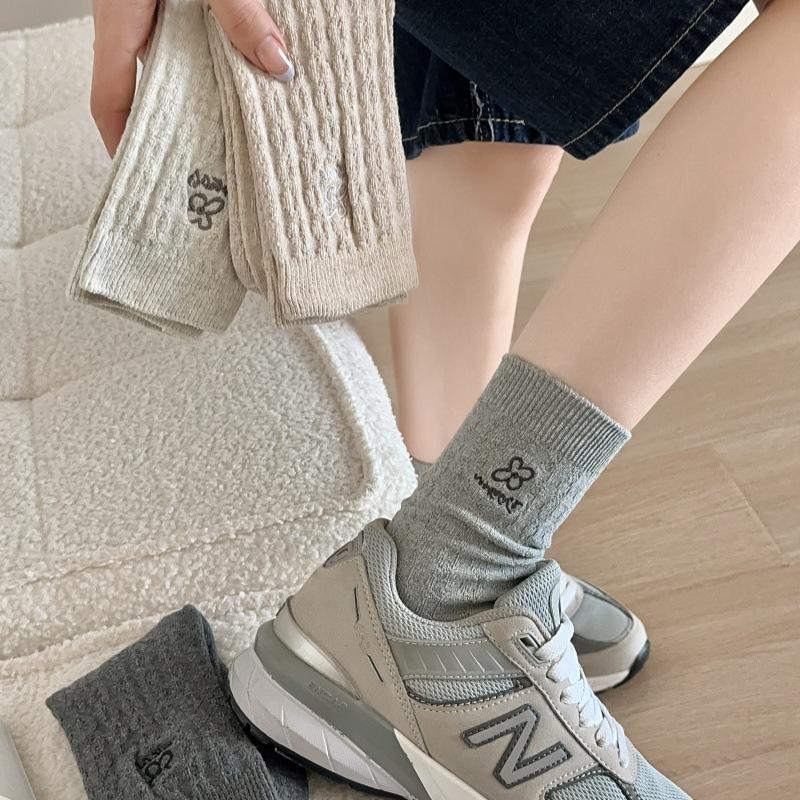 Meias Femininas de Meia Panturrilha Bordadas com Pequenas Flores Cinzas de Outono e Inverno, Meias de Cor Pura, Meias de Algodão Felpudo Estilo Preppy Coreano