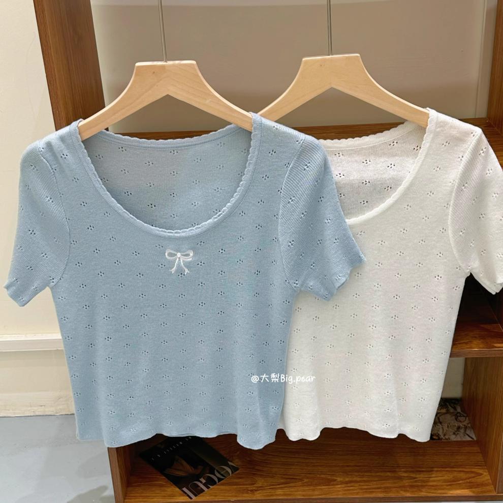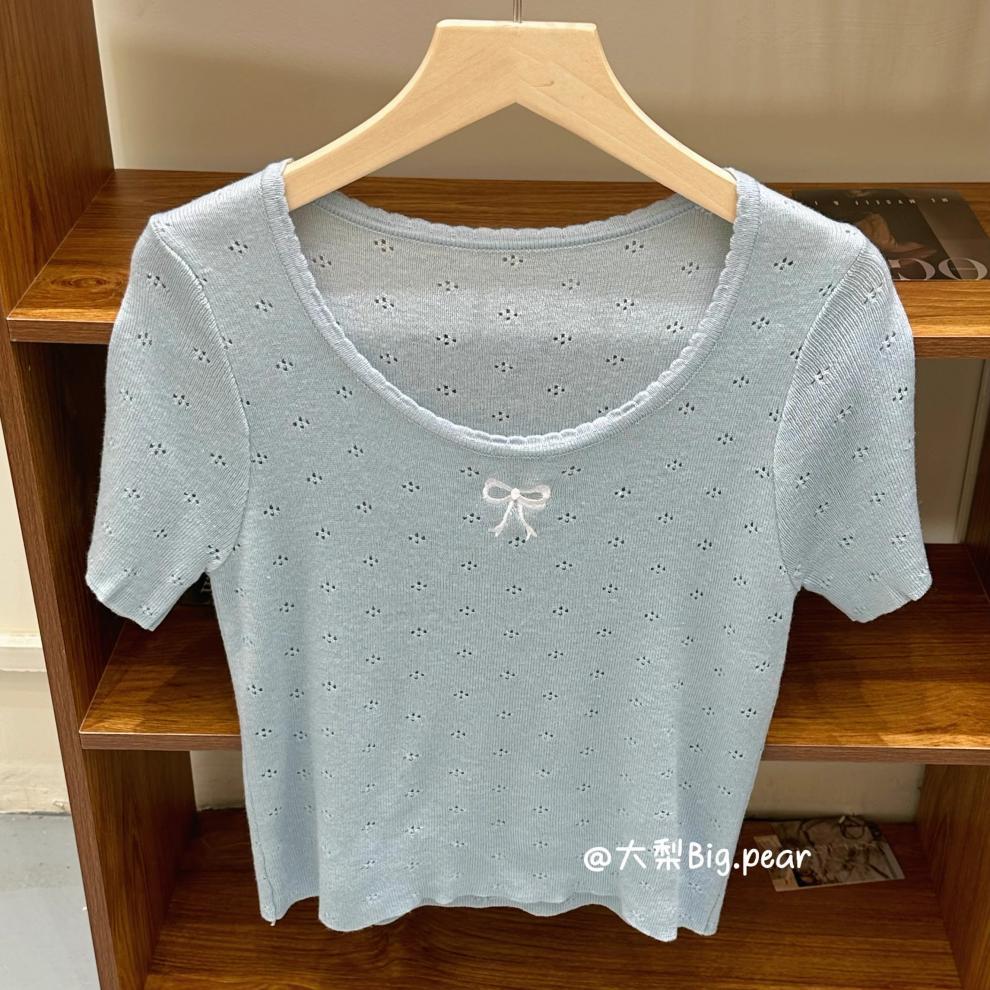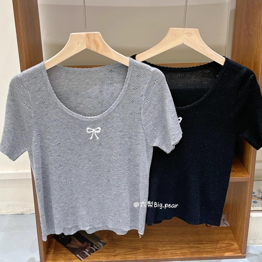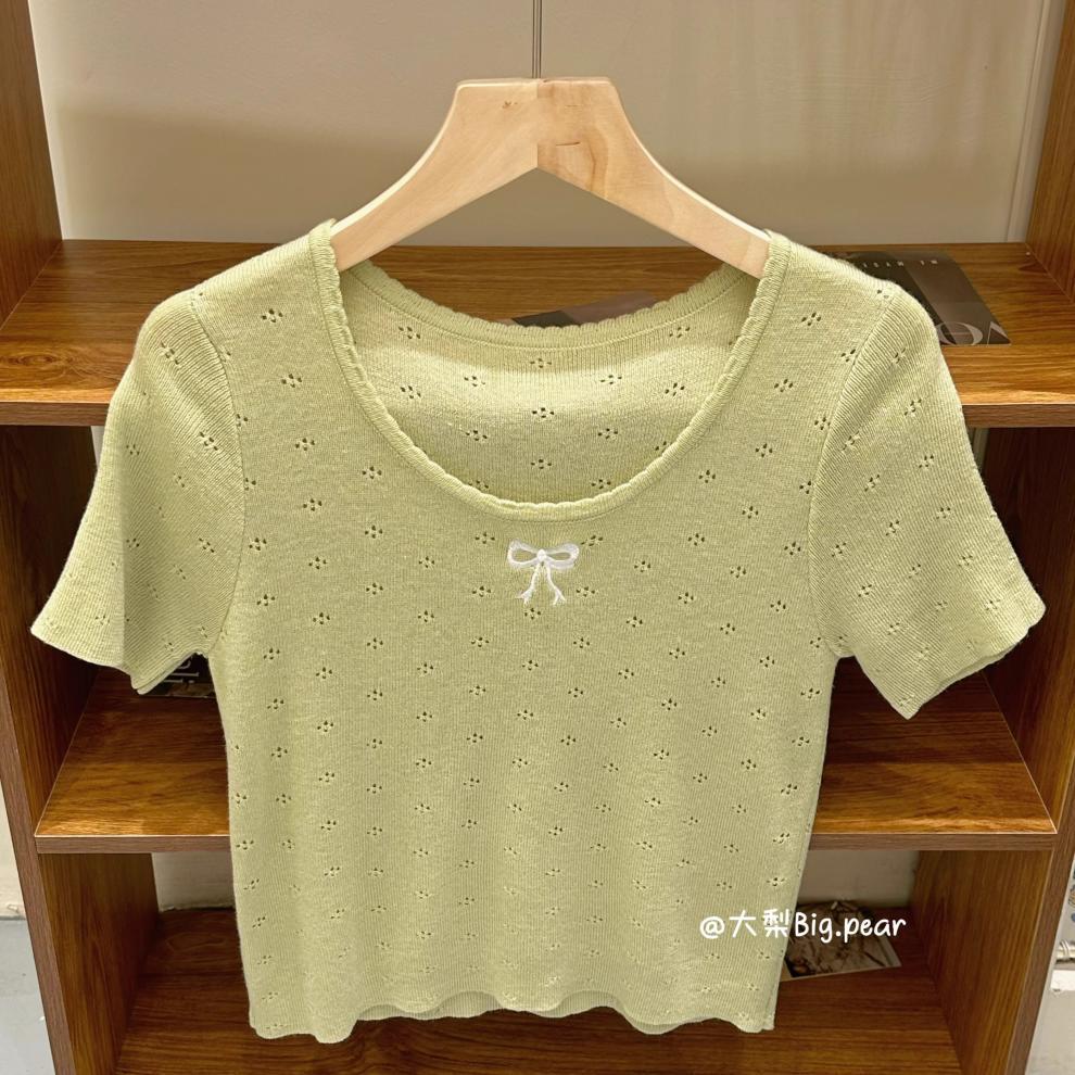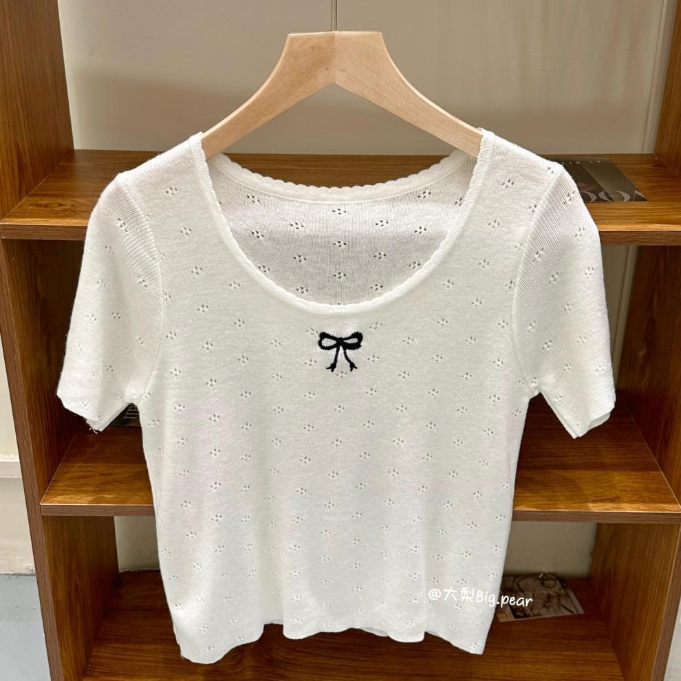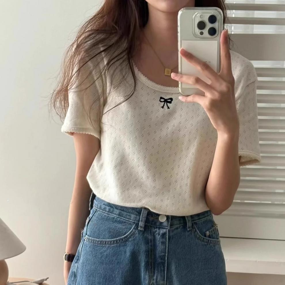 2025 Primavera e Verão Idade-redução Hollow Bow Bordado Renda Manga Curta T-shirt Feminino Tricô Doce