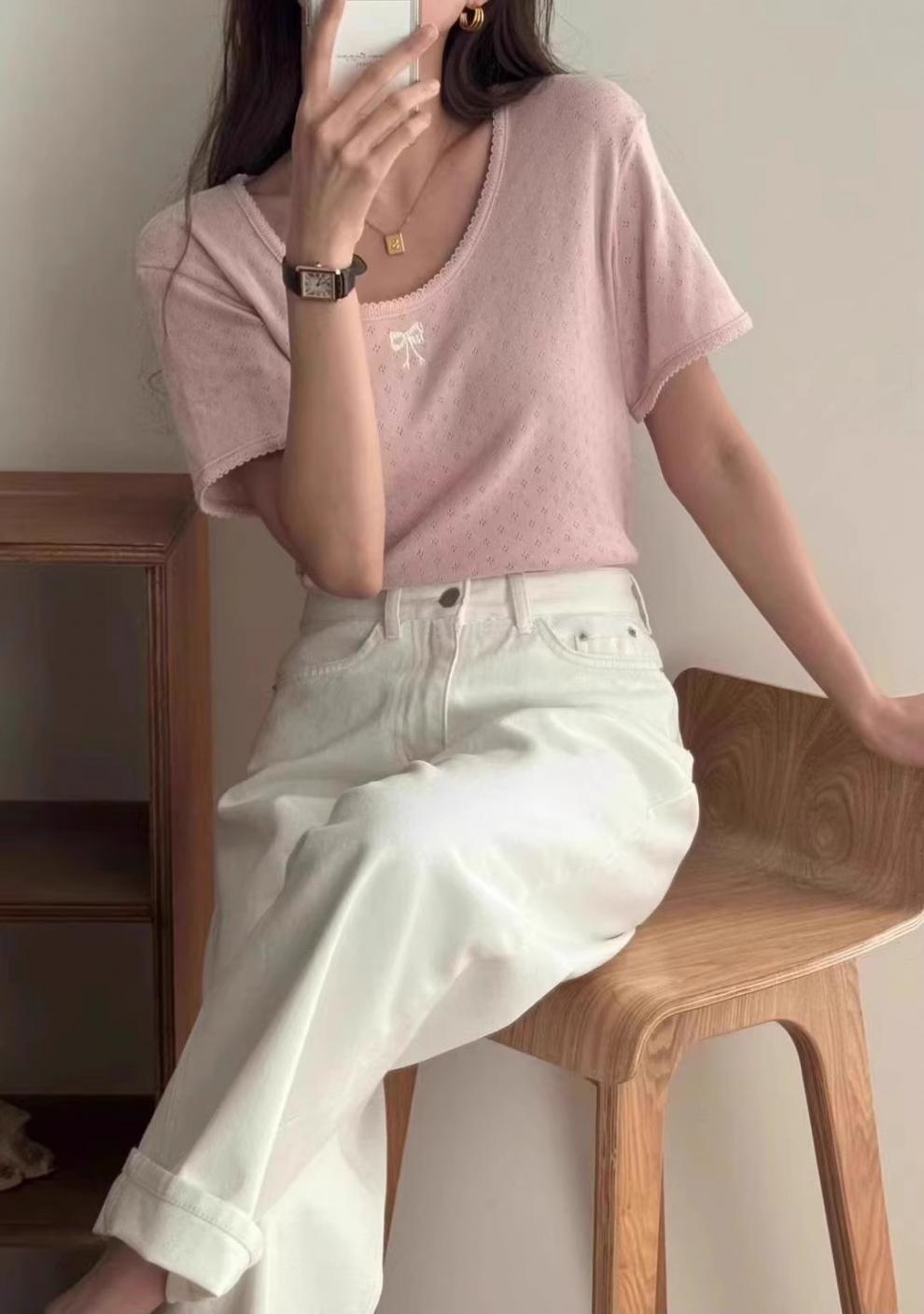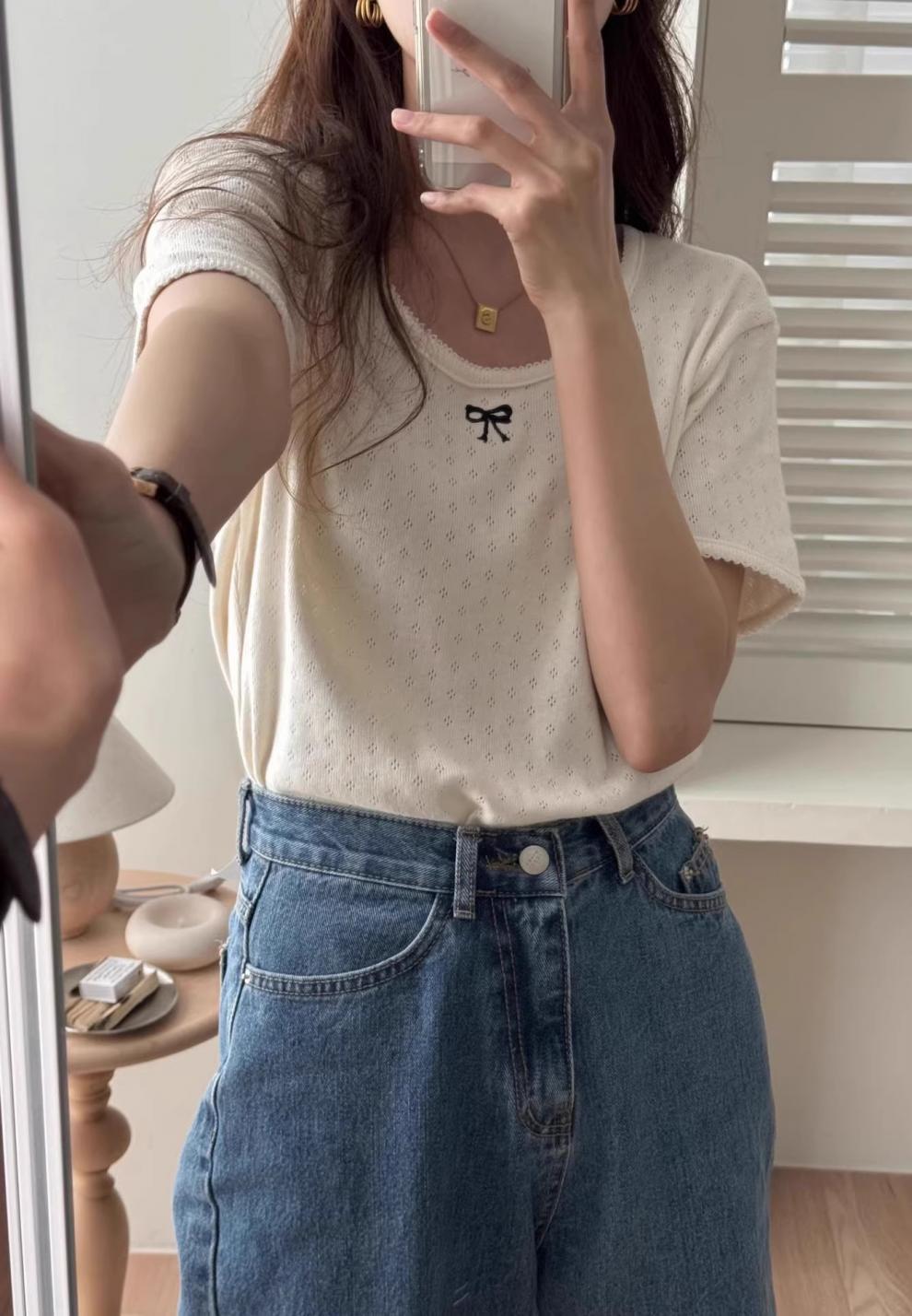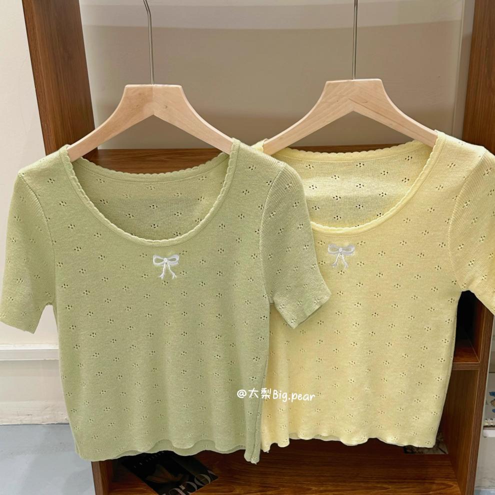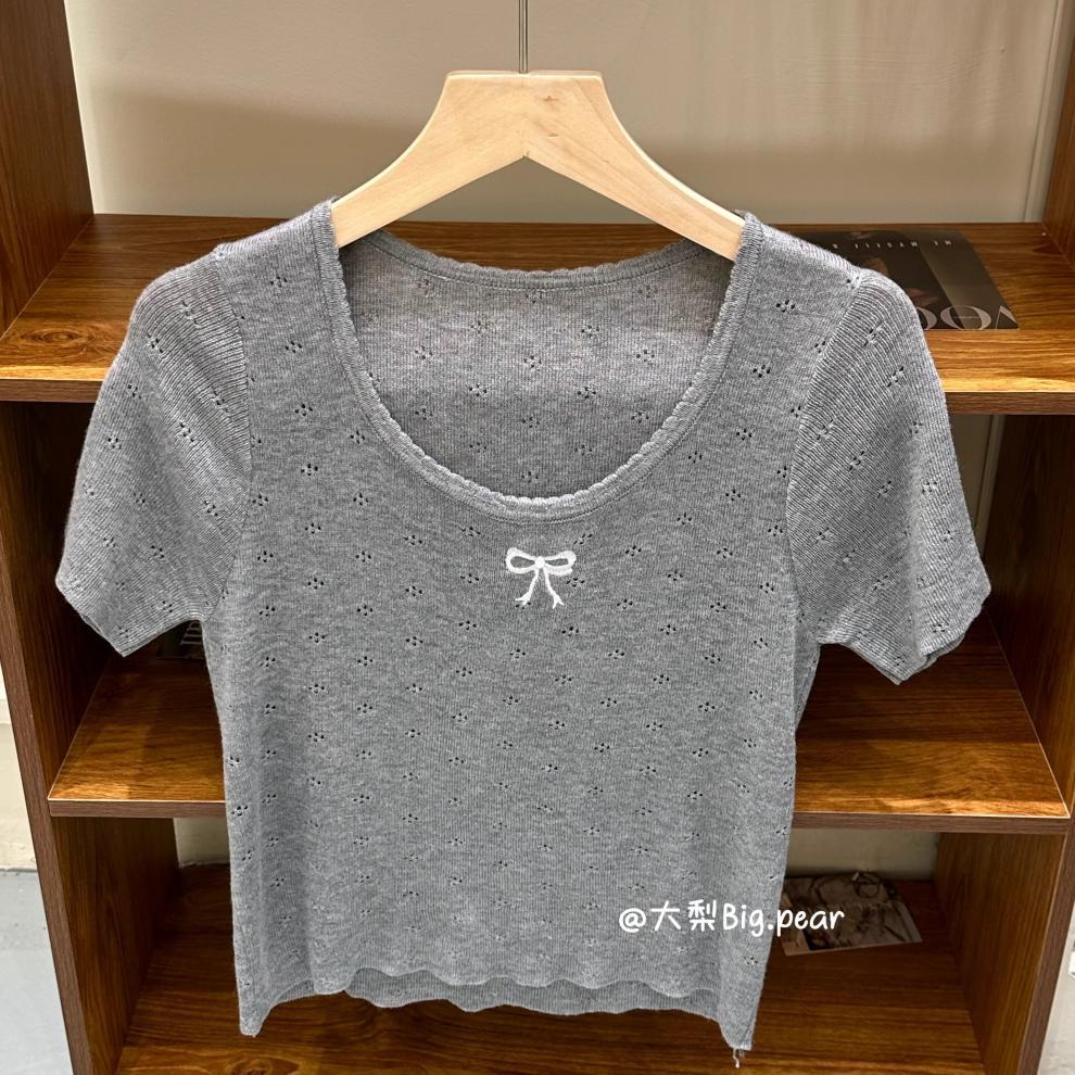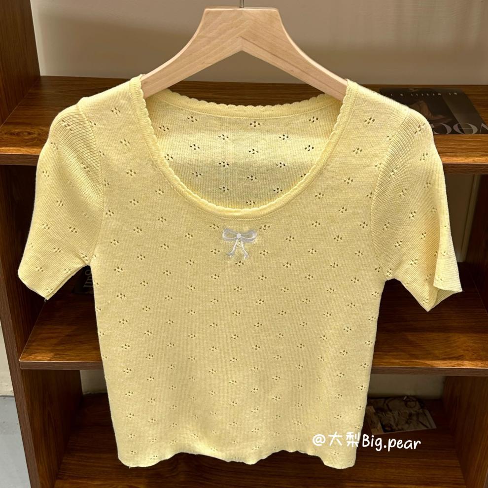 2025 Primavera e Verão Idade-redução Hollow Bow Bordado Renda Manga Curta T-shirt Feminino Tricô Doce