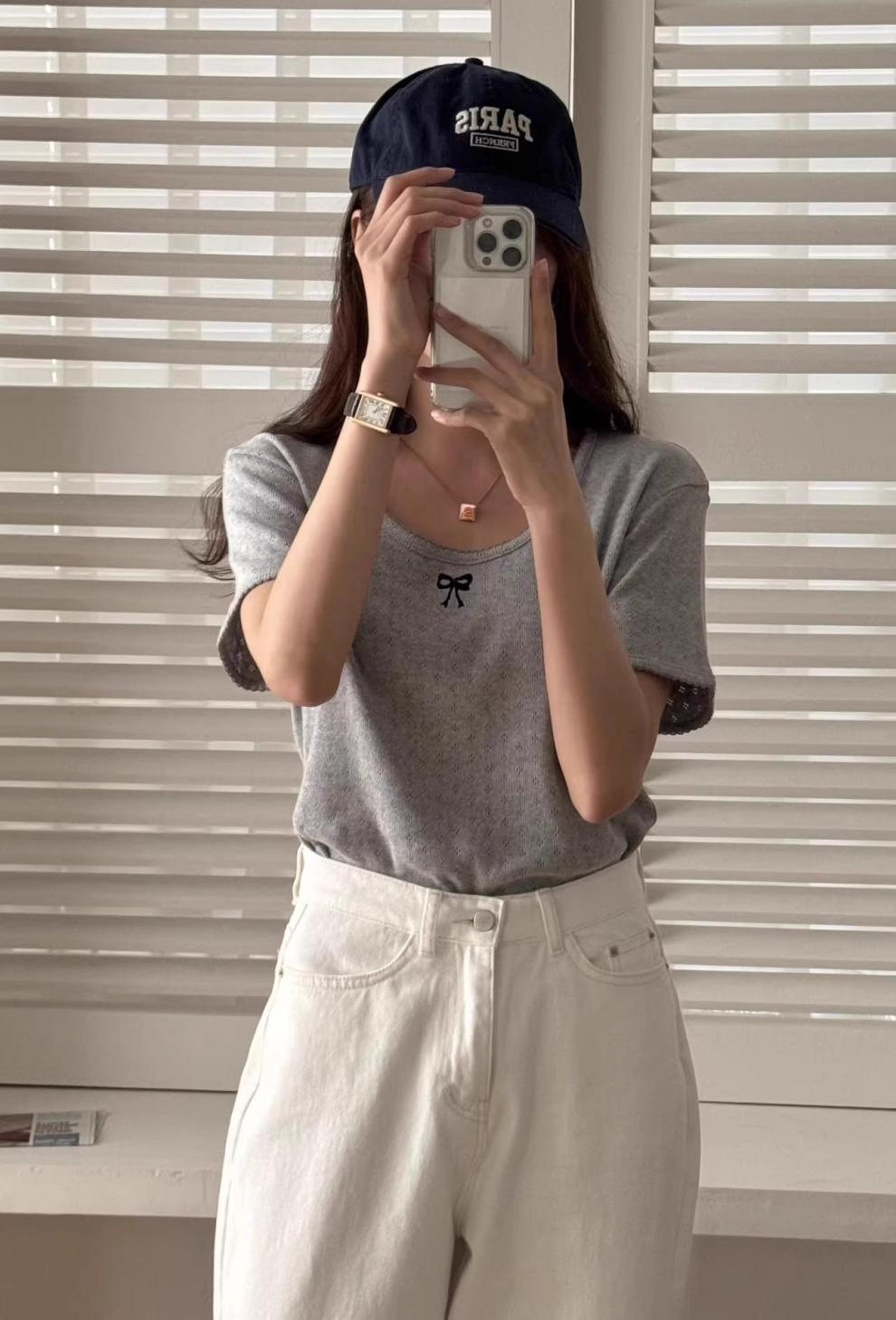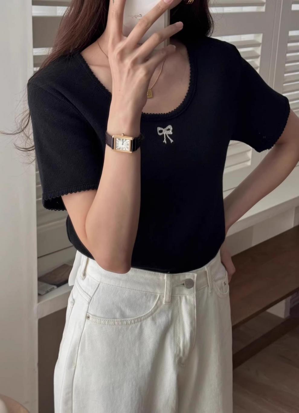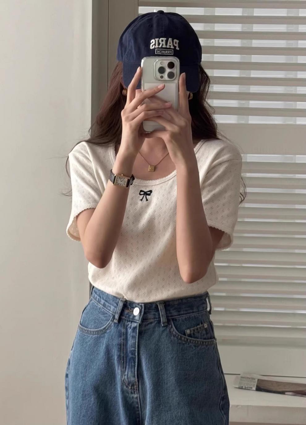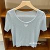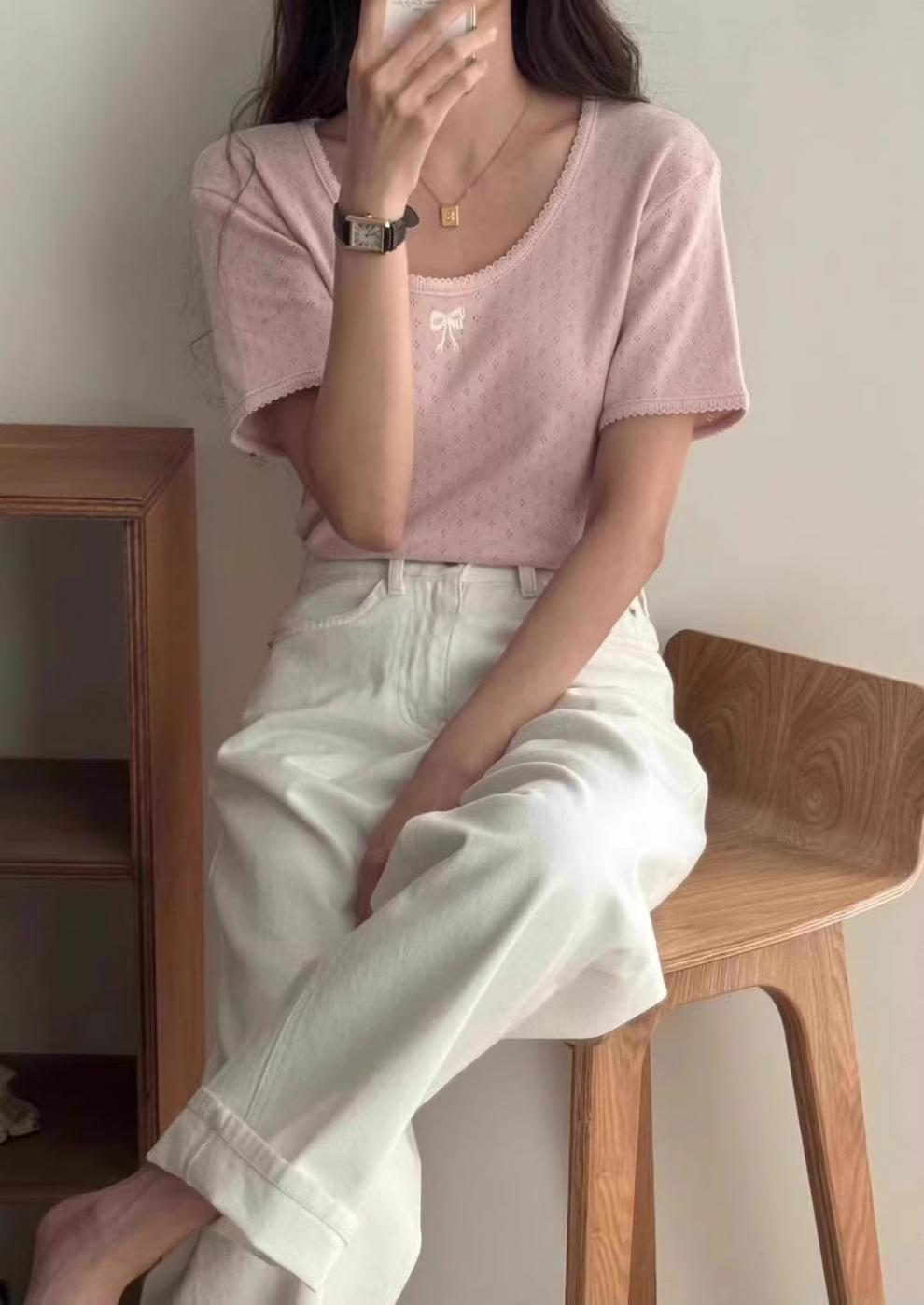 2025 Primavera e Verão Idade-redução Hollow Bow Bordado Renda Manga Curta T-shirt Feminino Tricô Doce