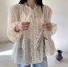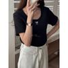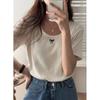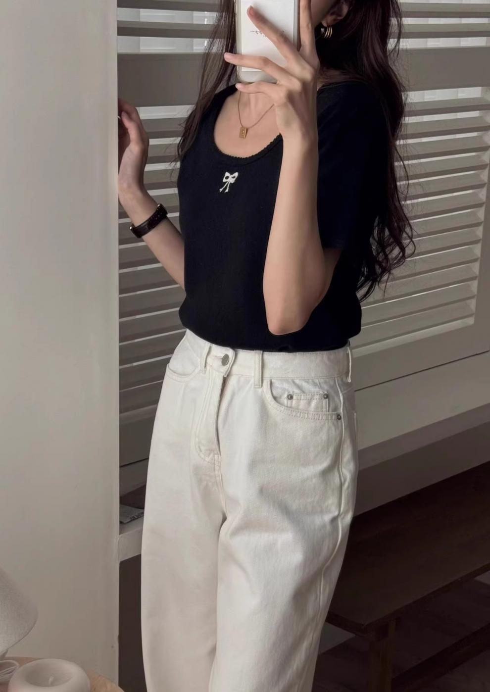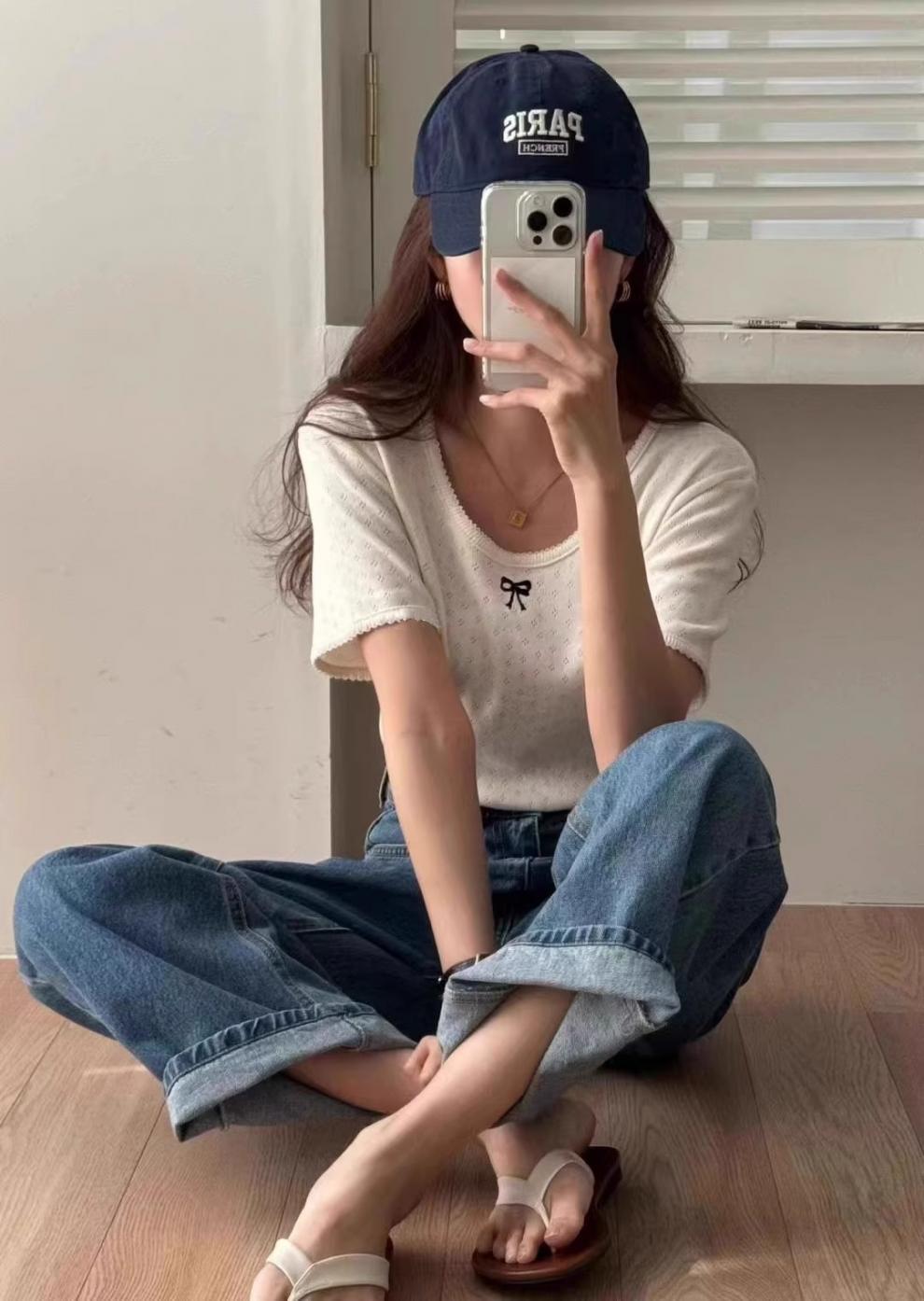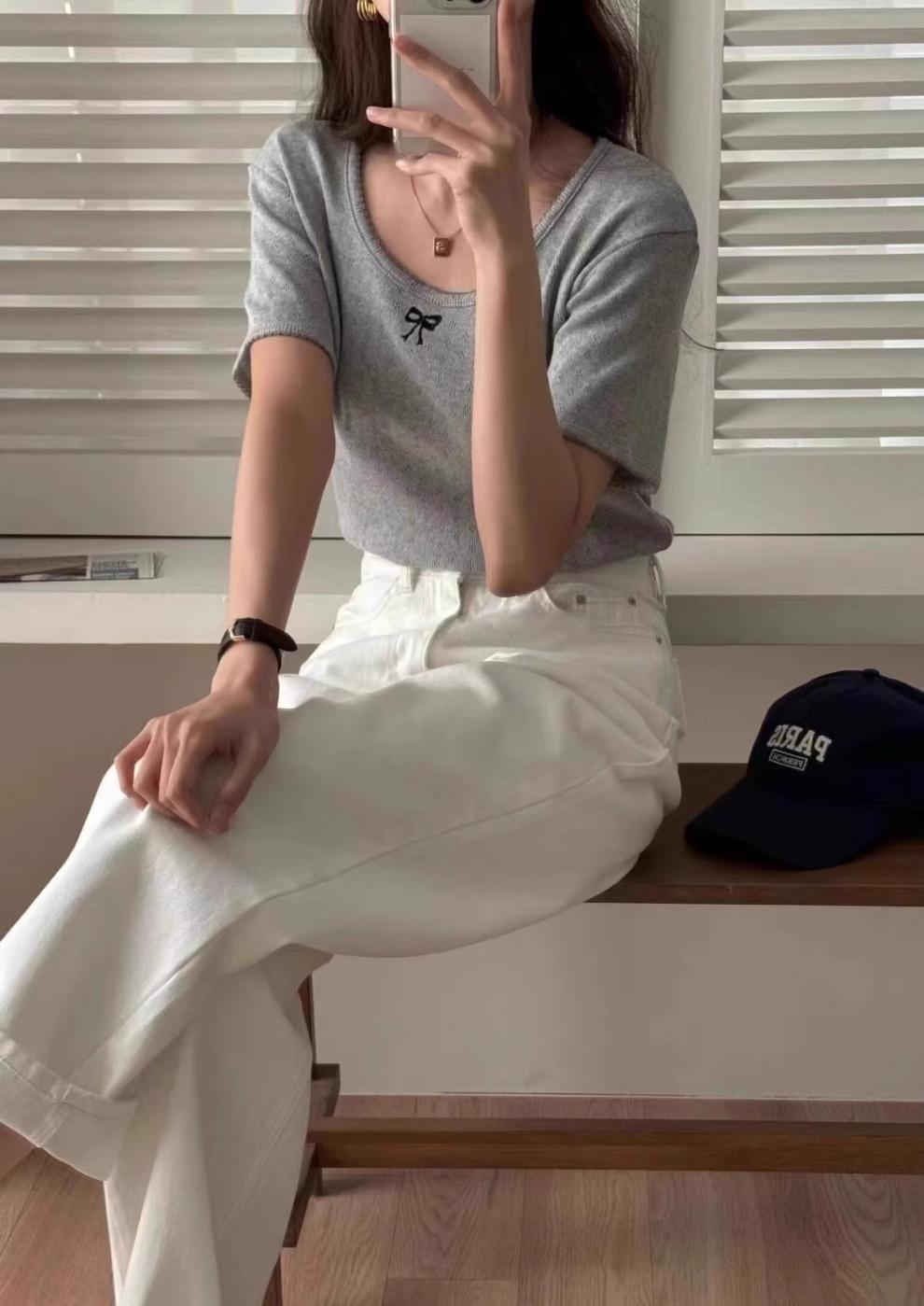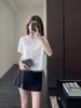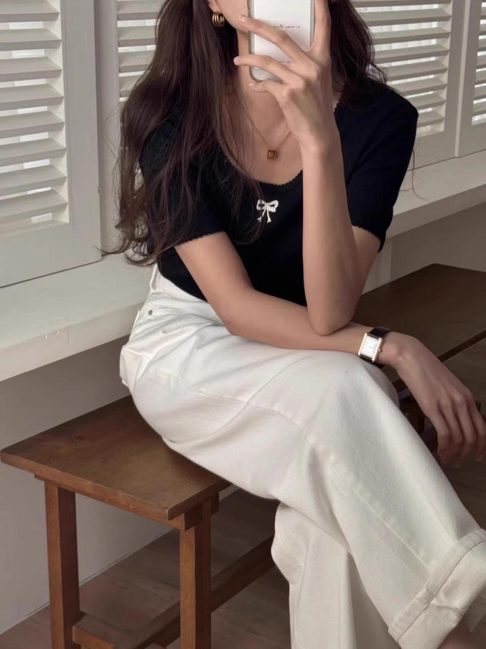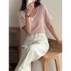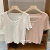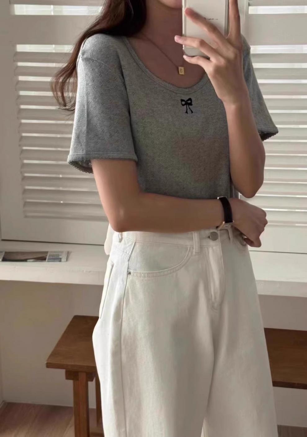 2025 Primavera e Verão Idade-redução Hollow Bow Bordado Renda Manga Curta T-shirt Feminino Tricô Doce
